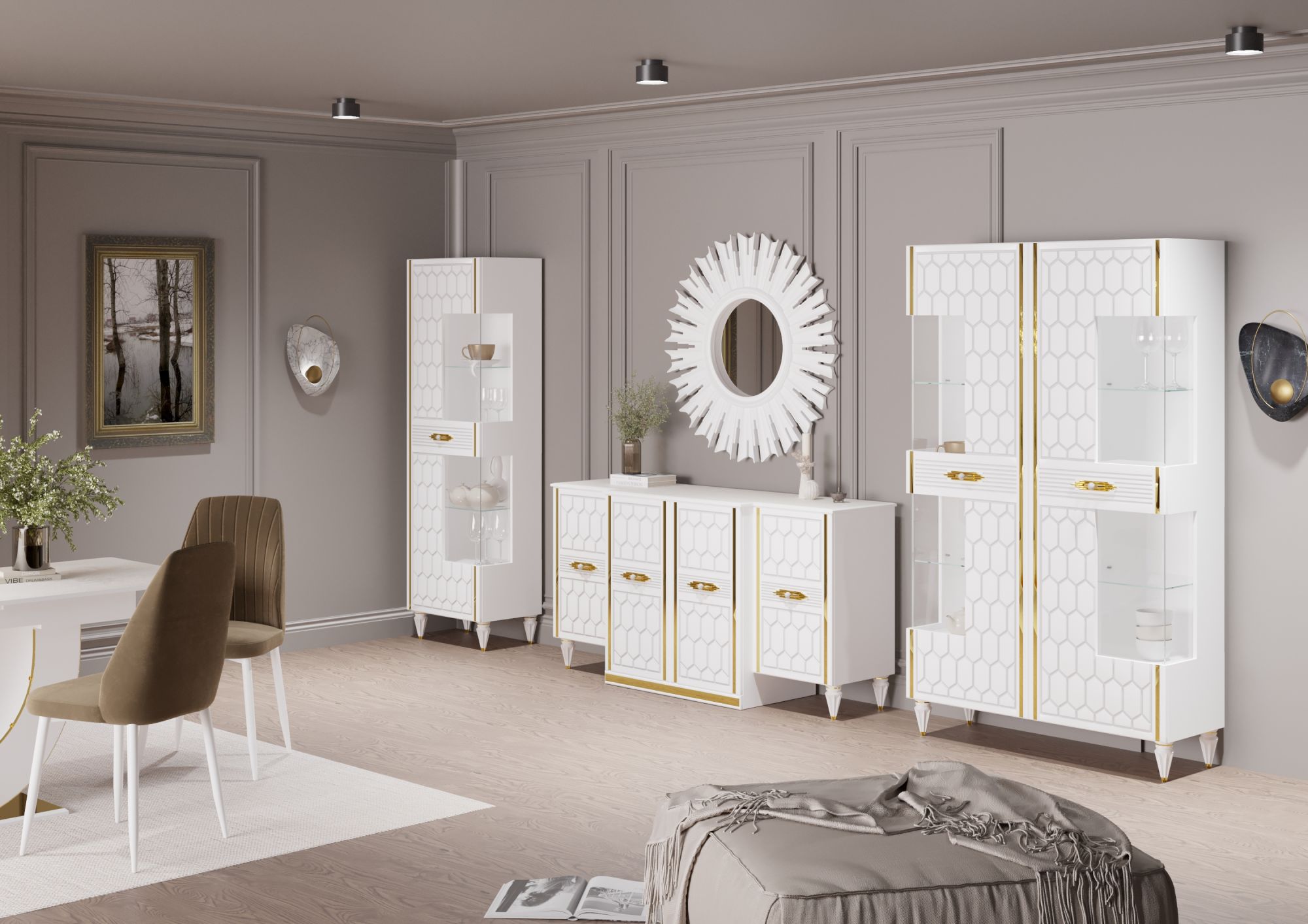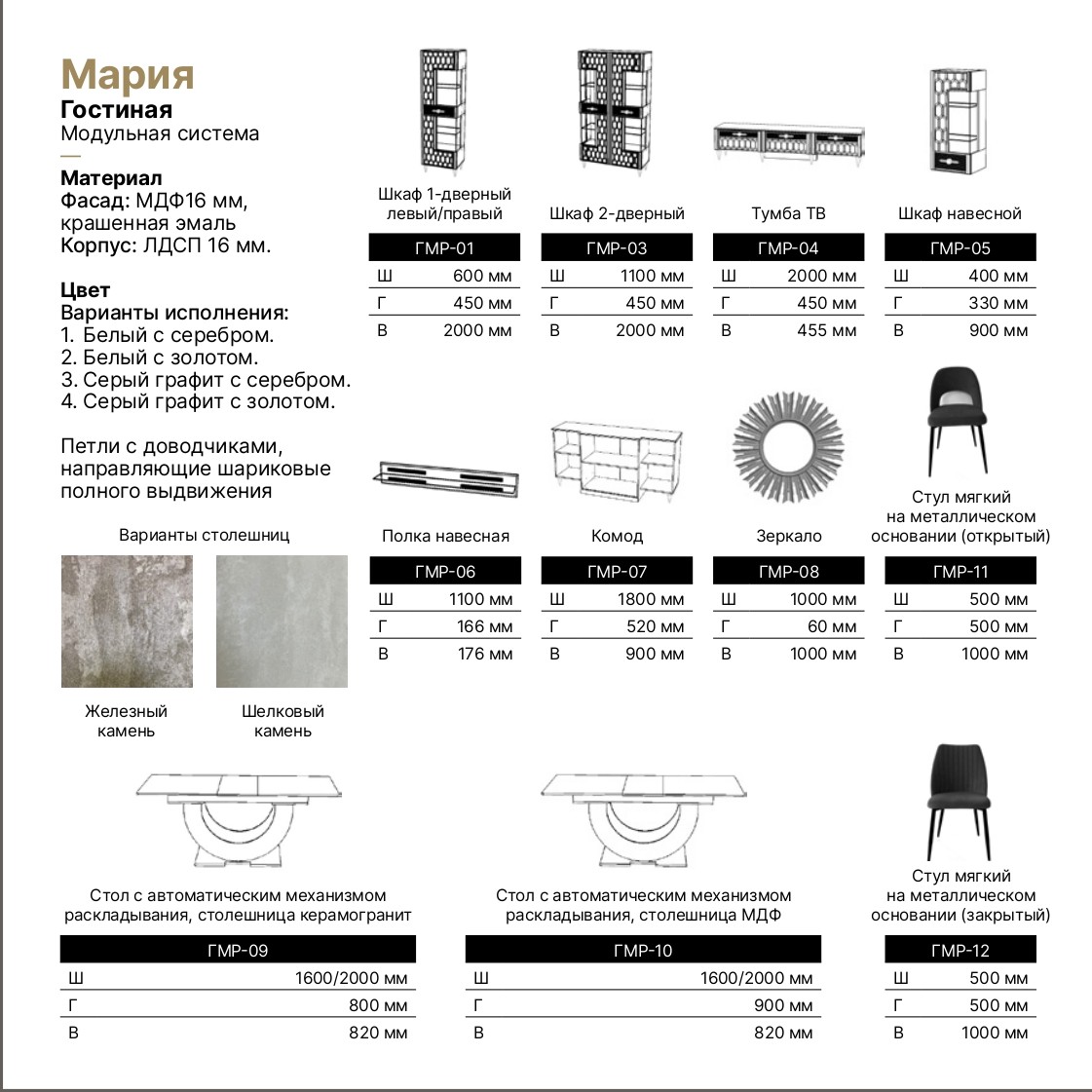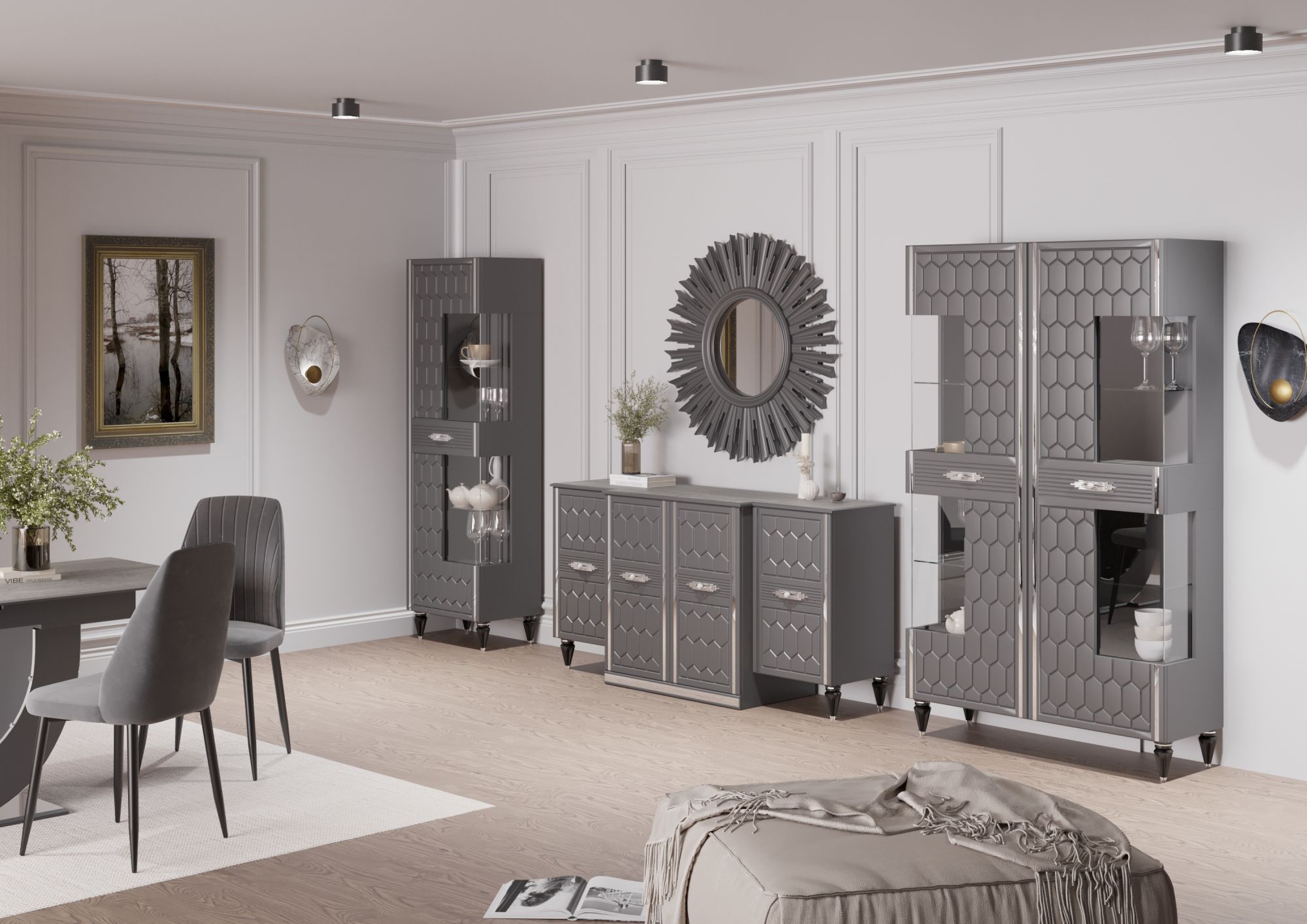 - Модульные гостиные — гибкое решение для создания индивидуального интерьера. Вы самостоятельно выбираете элементы: тумбы, пеналы, витрины, полки и комбинируете их по своему вкусу. Модульная система легко адаптируется под любую площадь — от компактных квартир до просторных залов.