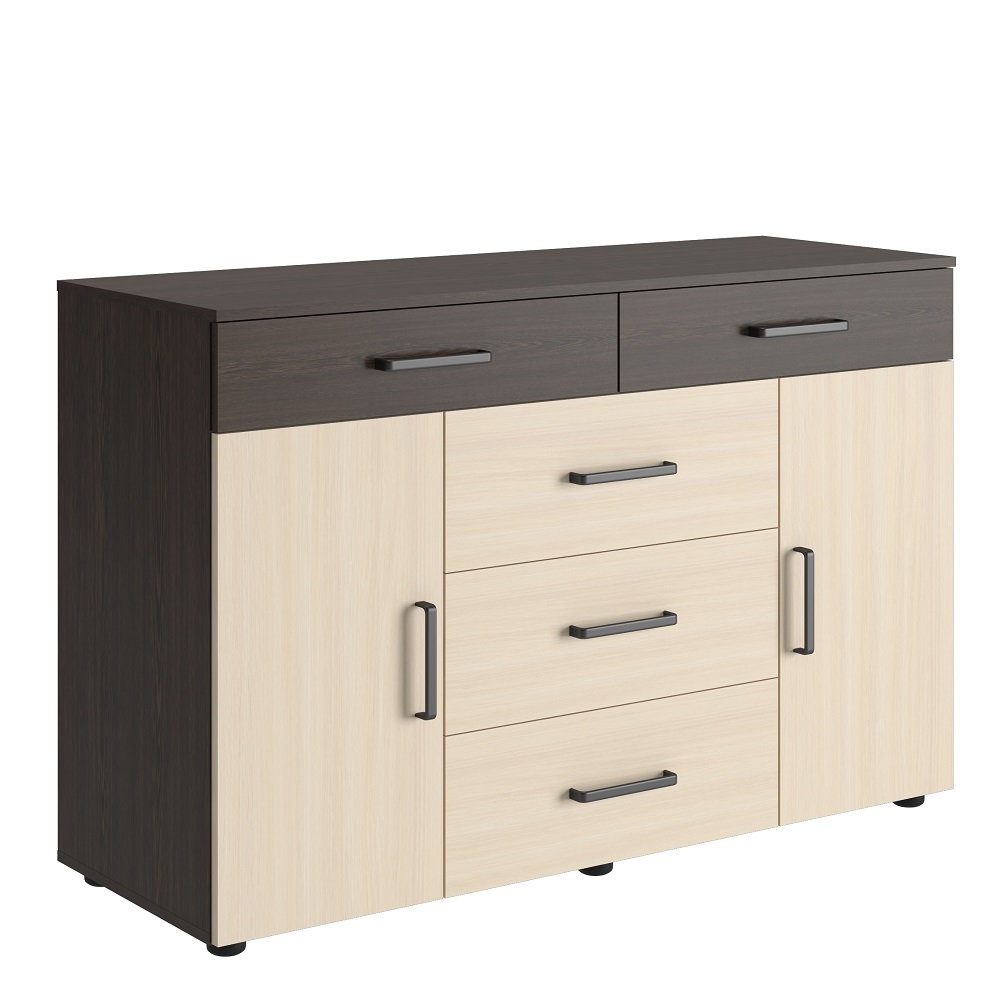 Размеры: 1250*910*449 мм Комод с пятью ящиками, отлично подойдет для спальни, прихожей или детской комнаты. Эта модель мебели доступна в следующих цветах: Вариант 1 Корпус: Венге Фасад: Дуб молочный. Вариант 2 Корпус: ЛДСП Белый гладкий. Фасад: ЛДСП Белый гладкий.