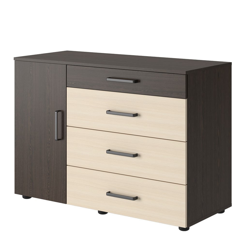 Каркас/фасад ЛДСП 16 мм: Венге/Дуб молочный, Белый гладкий; Задние стенки и дно ящиков - ЛДВП «Венге» (толщина 3 мм); Торцы деталей обработаны кромкой ПВХ 0,4 мм в цвет ЛДСП. Ручка – скоба, цвет металлик, длина 138 мм, ширина 16 мм, высота 25 мм, материал – металл; Опоры – ножка круглая, цвет черный, диаметром 50 мм, высота 30 мм, материал –пластик.