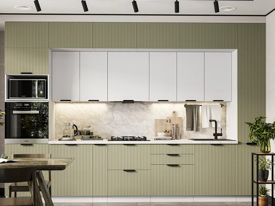 Корпус ЛДСП 16 мм: Белый. Фасады гладкие МДФ 16 мм, пленки ПВХ на выбор: Софт пломбир, Софт латте, Софт маренго, Канадский орех, Камень беж, Софт пихтовый зеленый, Софт хаки. Фрезеровка фасада Line доступна только в цвете: Софт пломбир, Софт маренго, Софт пихтовый зеленый, Софт хаки. Ручки металл, матовые в черном цвете, в комплекте.