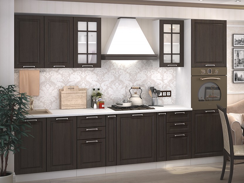 В состав комплекта входит: пенал ШП 600, шкаф нижний ШН 800, шкаф нижний с 3 ящ. ШН3Я 400- 2 шт., шкаф нижний бутылочница ШНБ 150 - 2шт., шкаф нижний 1дв. ШН 600, шкаф верхний 2-х дв. ШВ 800, шкаф 1 дв. со стеклом ШВС 400 - 2 шт., столешница 26мм - 2500мм