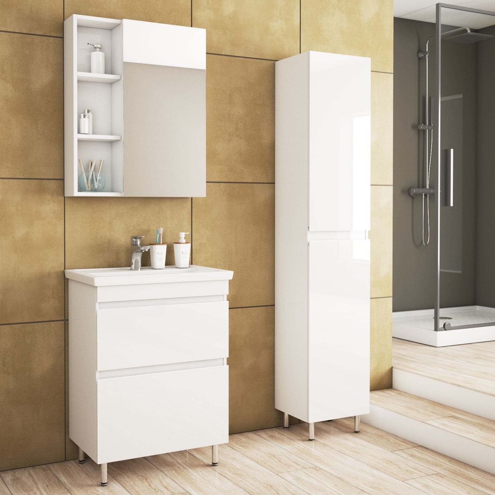В комплект входит: зеркало-шкаф Арно 60, тумба Арно 60, шкаф-пенал;