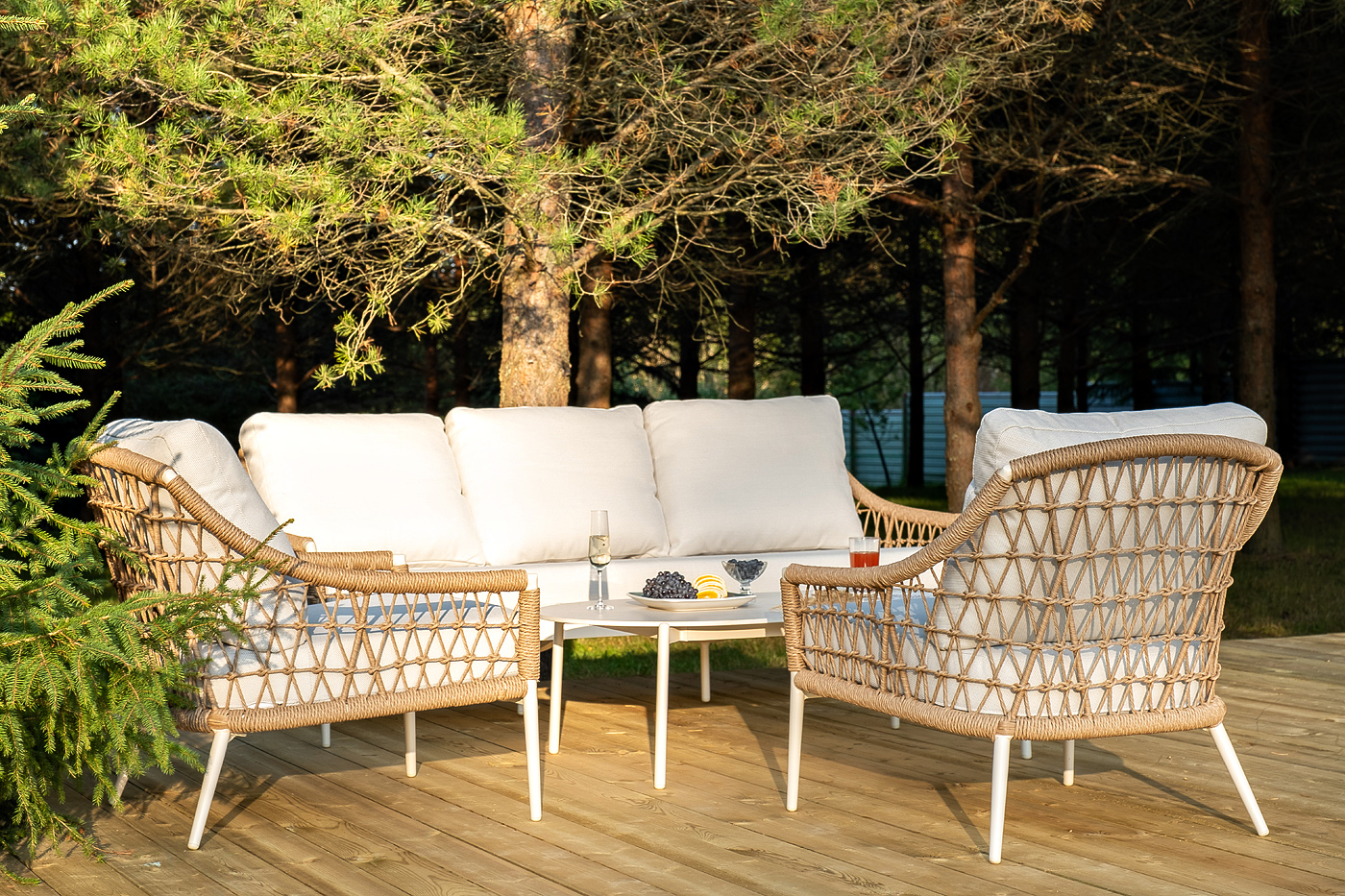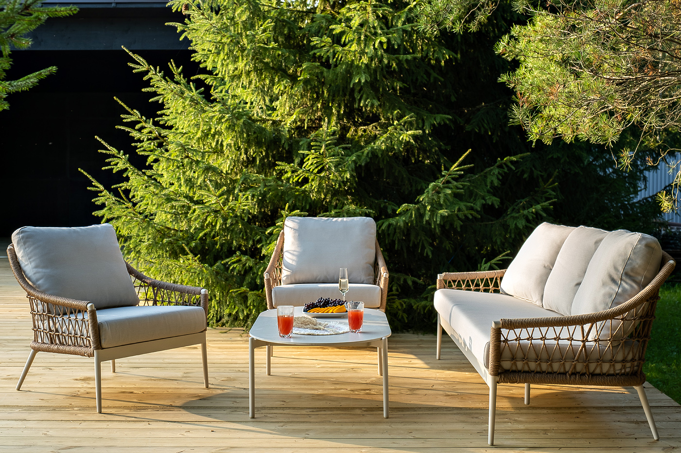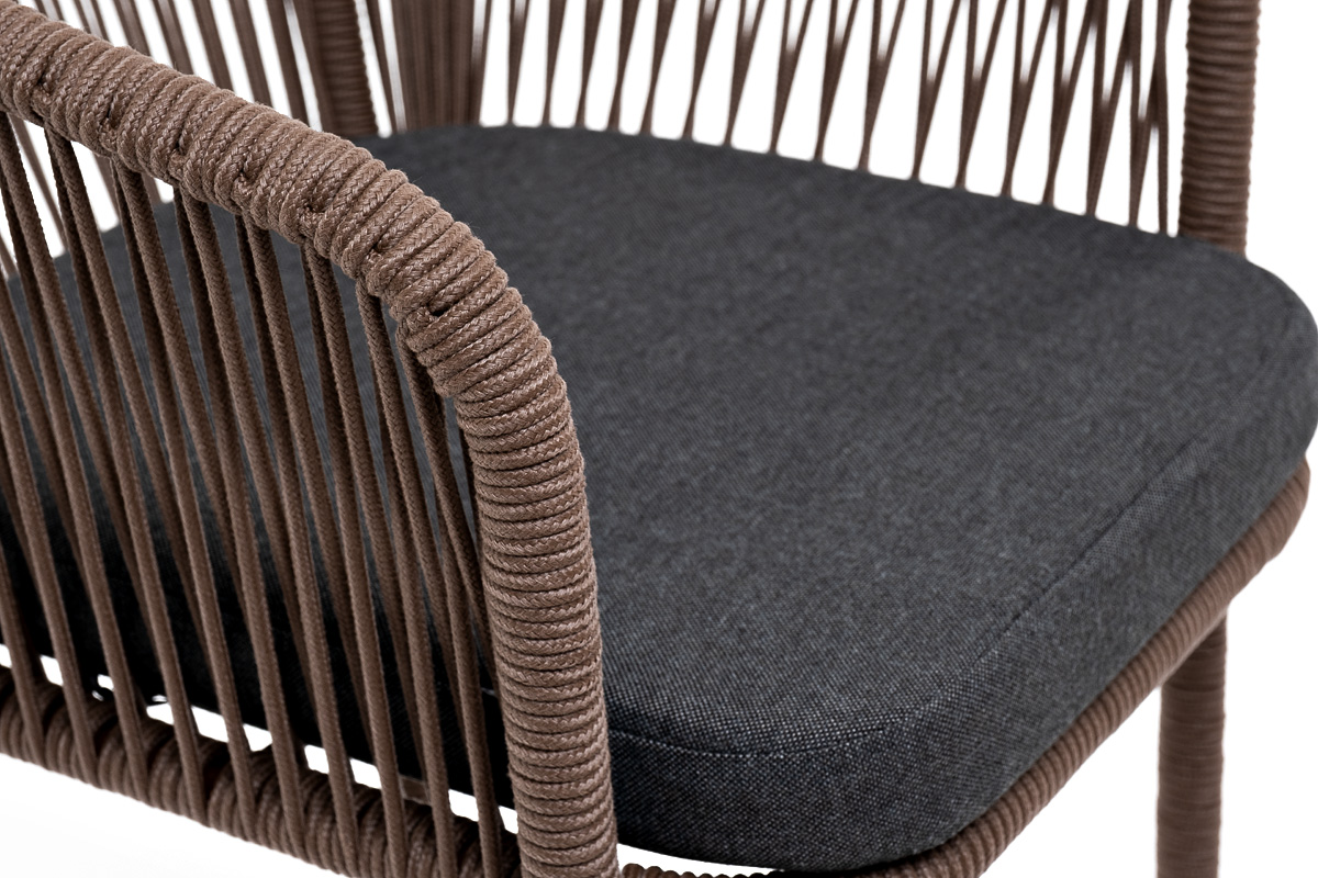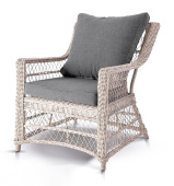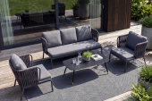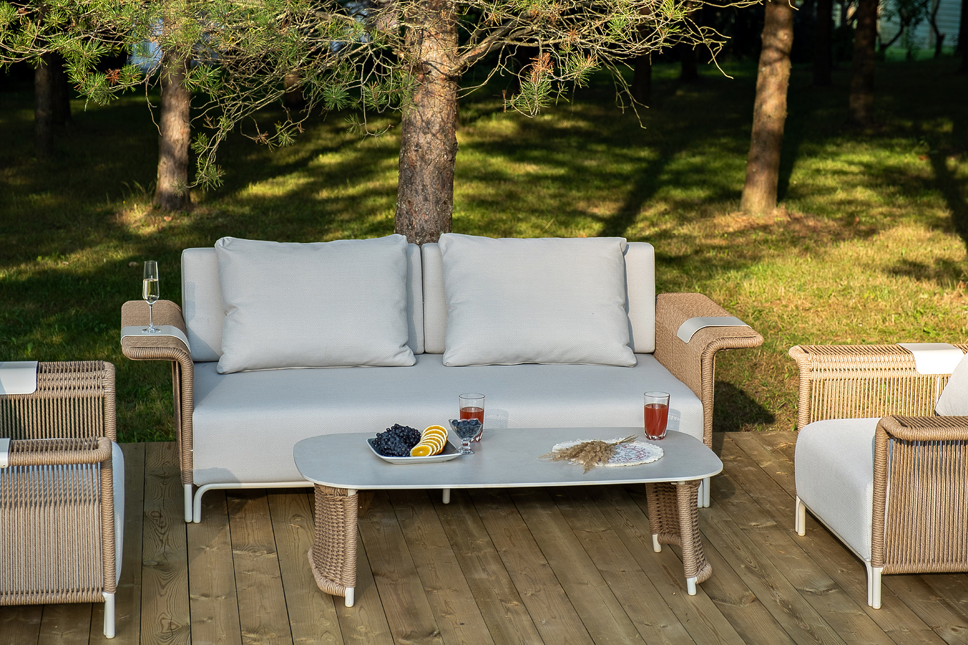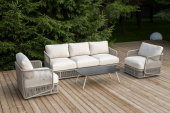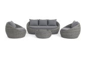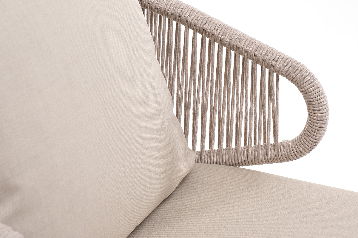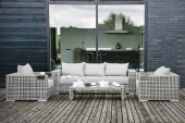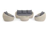 - Лаунж-зоны — готовые комплекты из дивана, кресел и журнального столика. Сбалансированные композиции для 4-8 человек создают уютное пространство для общения. Все элементы выполнены в едином стиле с одинаковым типом плетения и цветом.