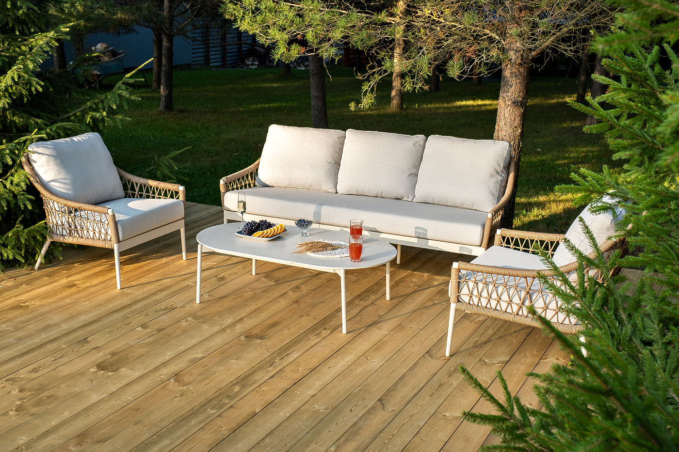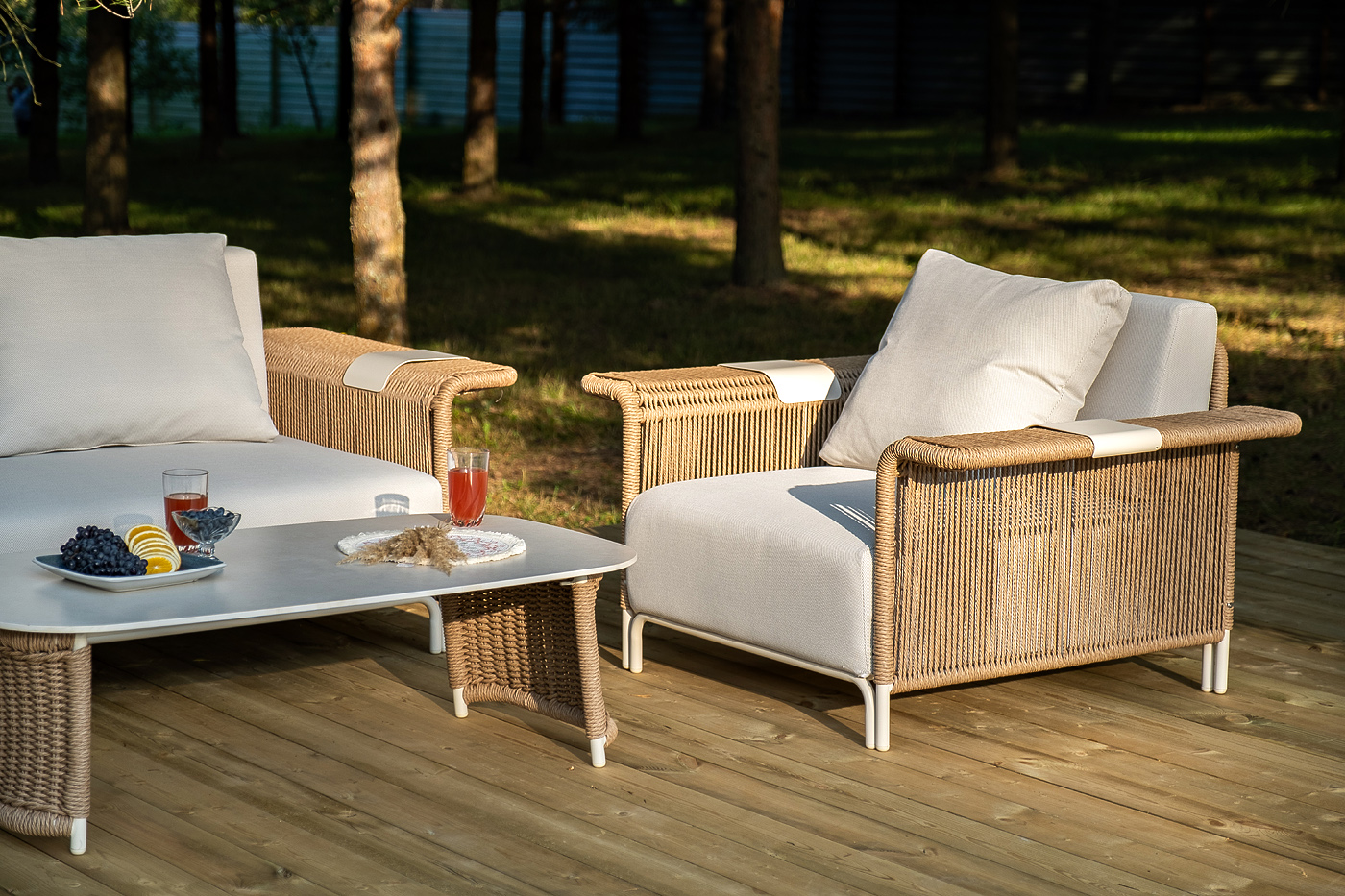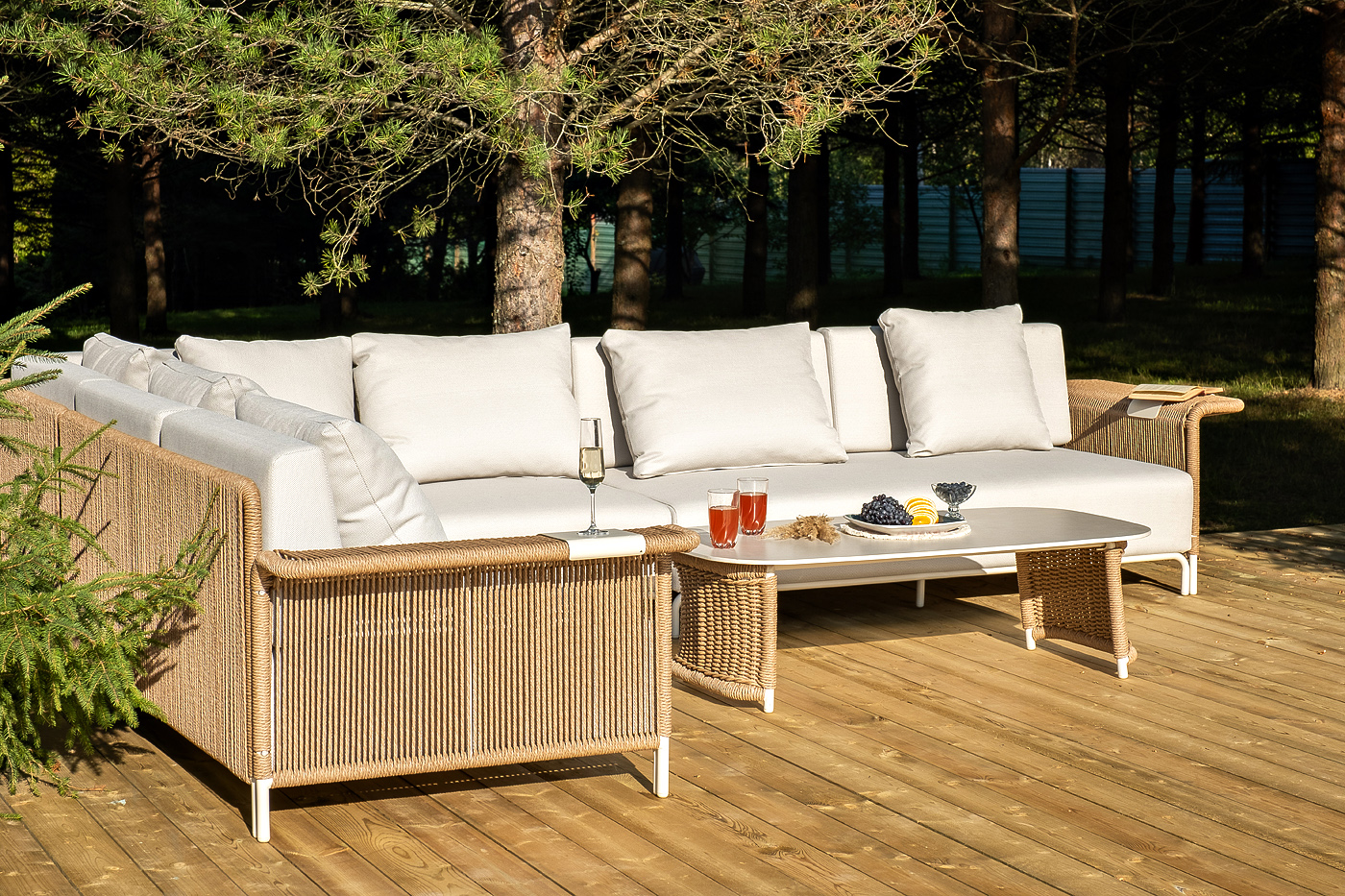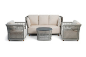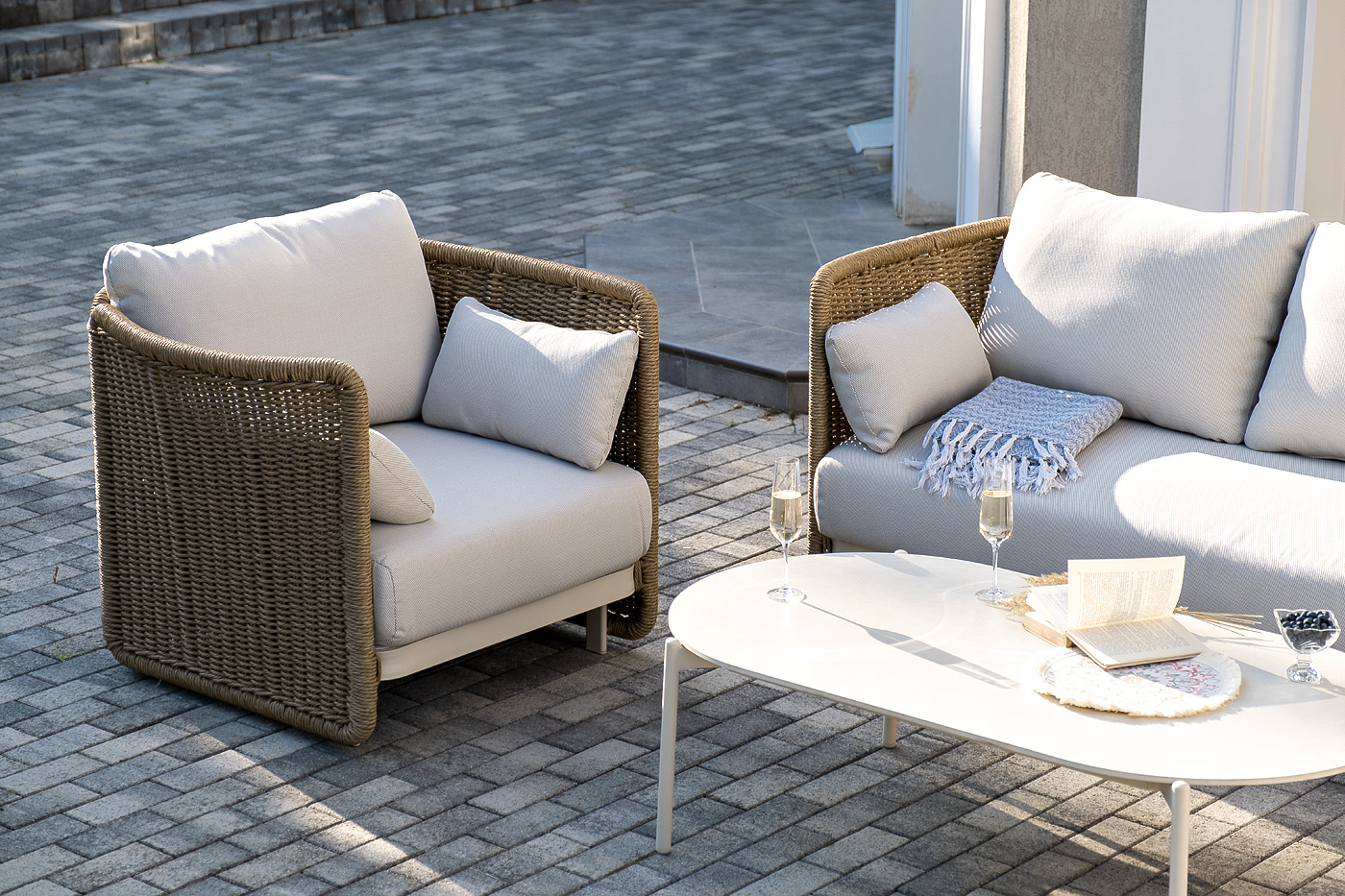 - Лаунж-зоны — готовые комплекты из дивана, кресел и журнального столика. Сбалансированные композиции для 4-8 человек создают уютное пространство для общения. Все элементы выполнены в едином стиле с одинаковым типом плетения и цветом.