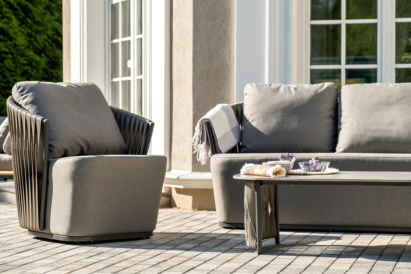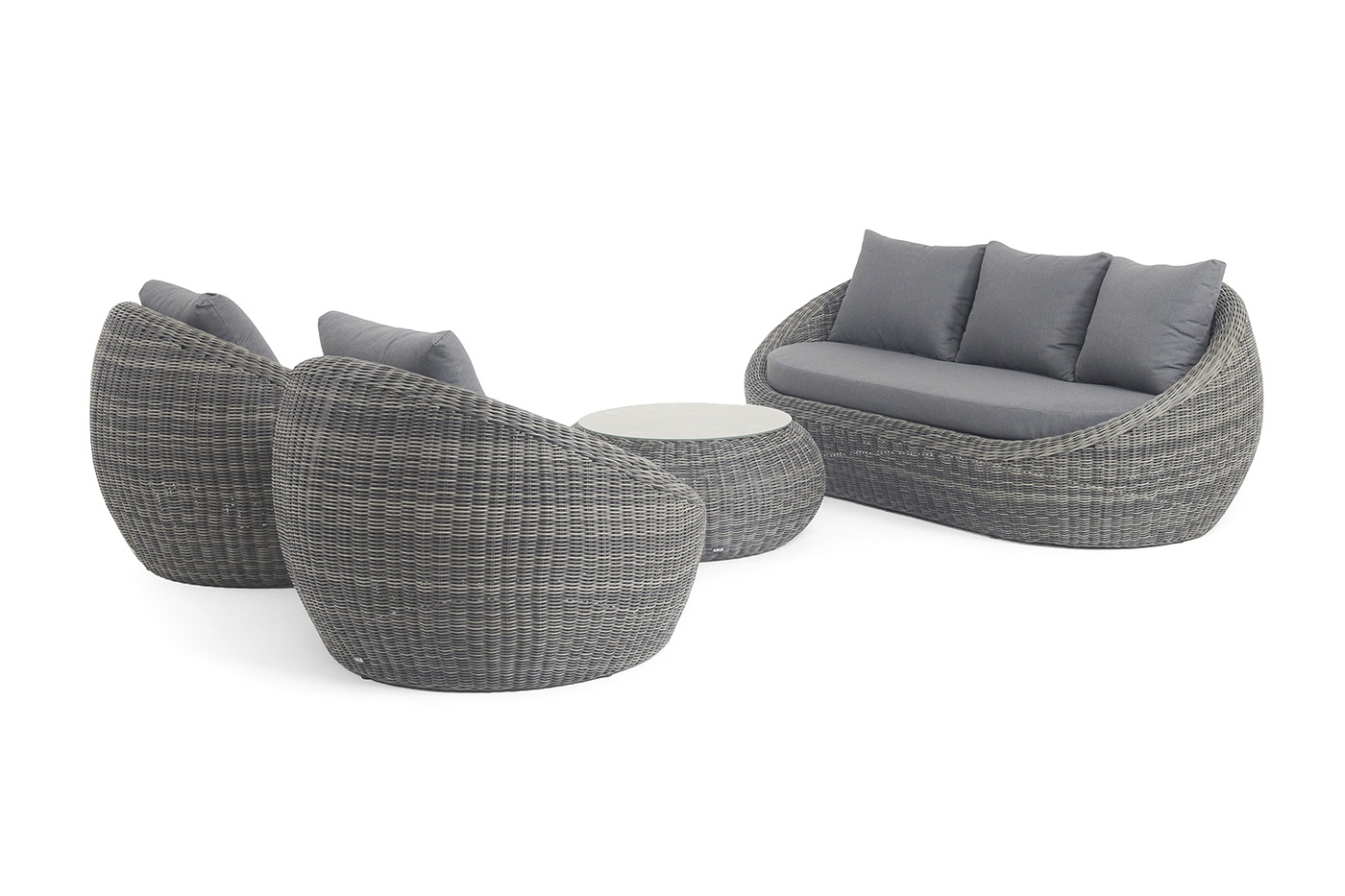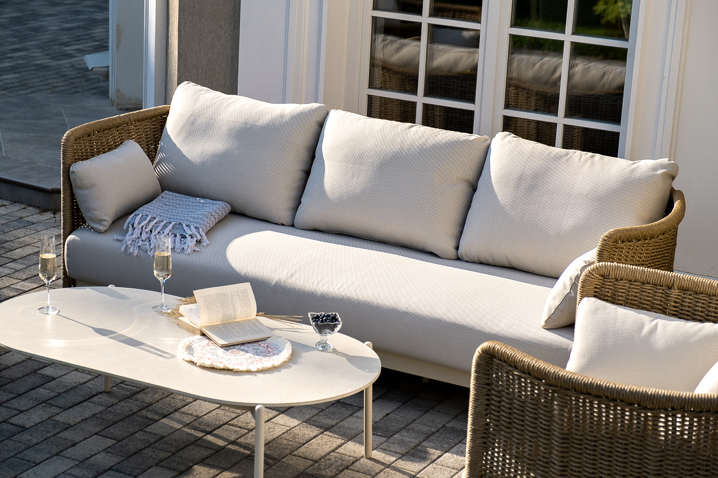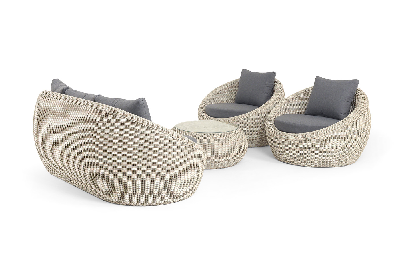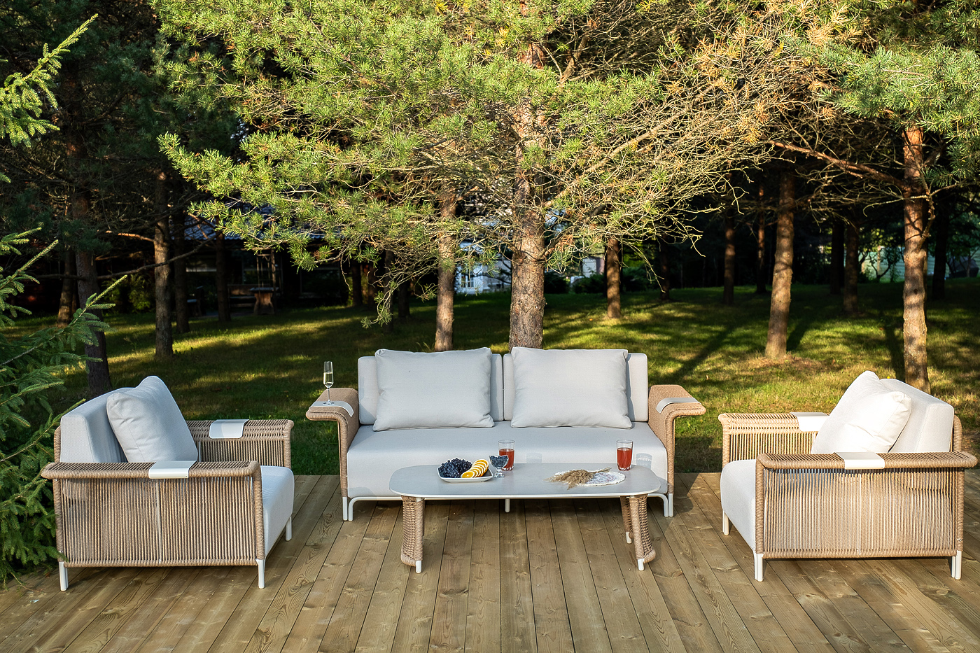 - Лаунж-зоны — готовые комплекты из дивана, кресел и журнального столика. Сбалансированные композиции для 4-8 человек создают уютное пространство для общения. Все элементы выполнены в едином стиле с одинаковым типом плетения и цветом.
