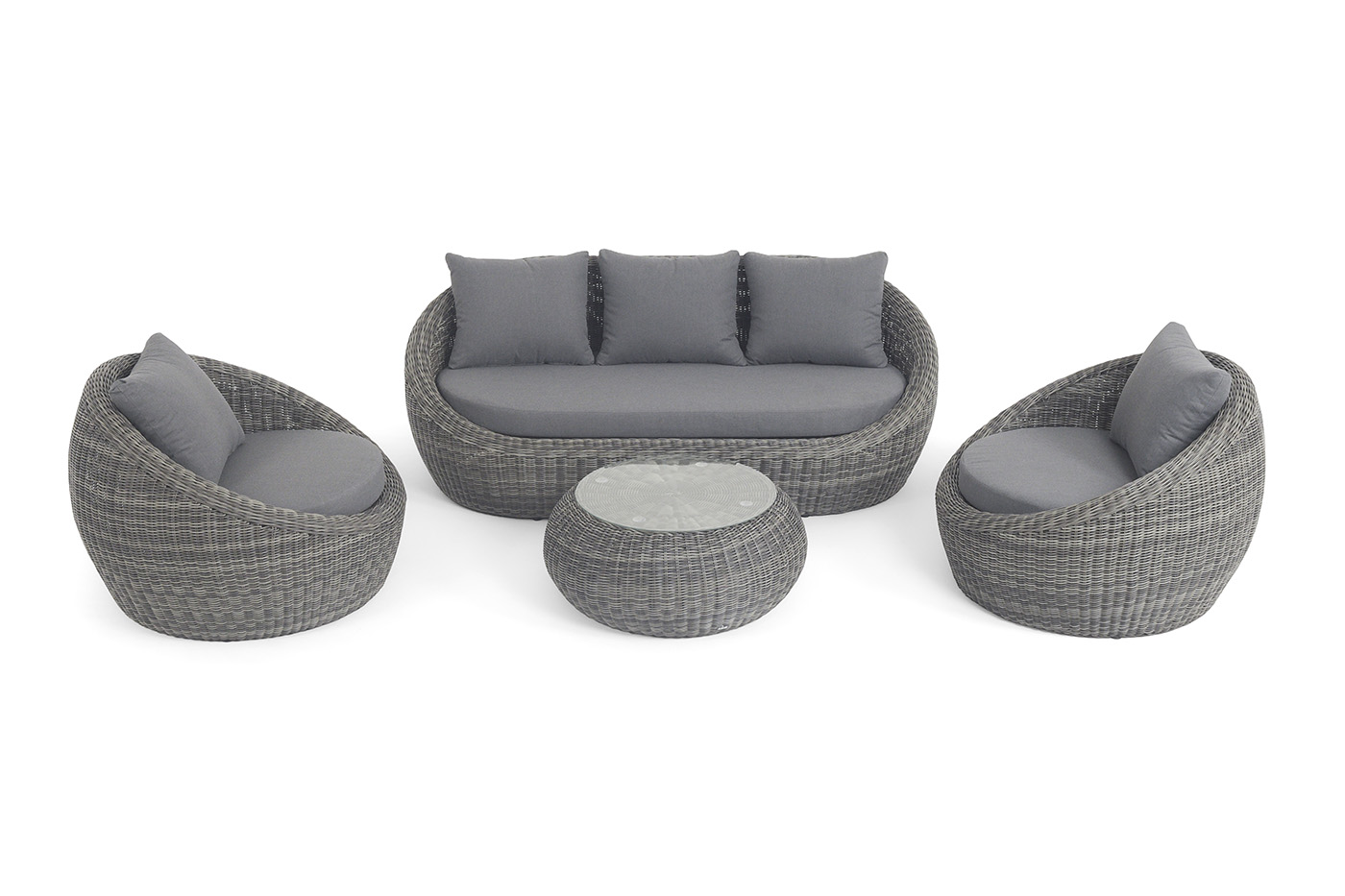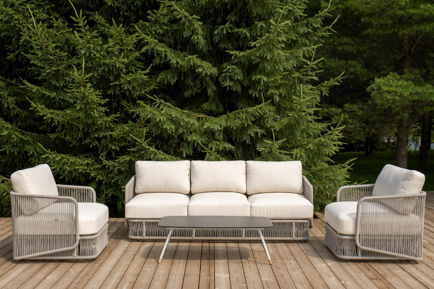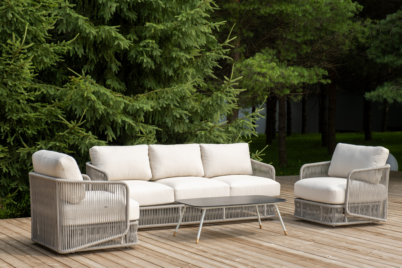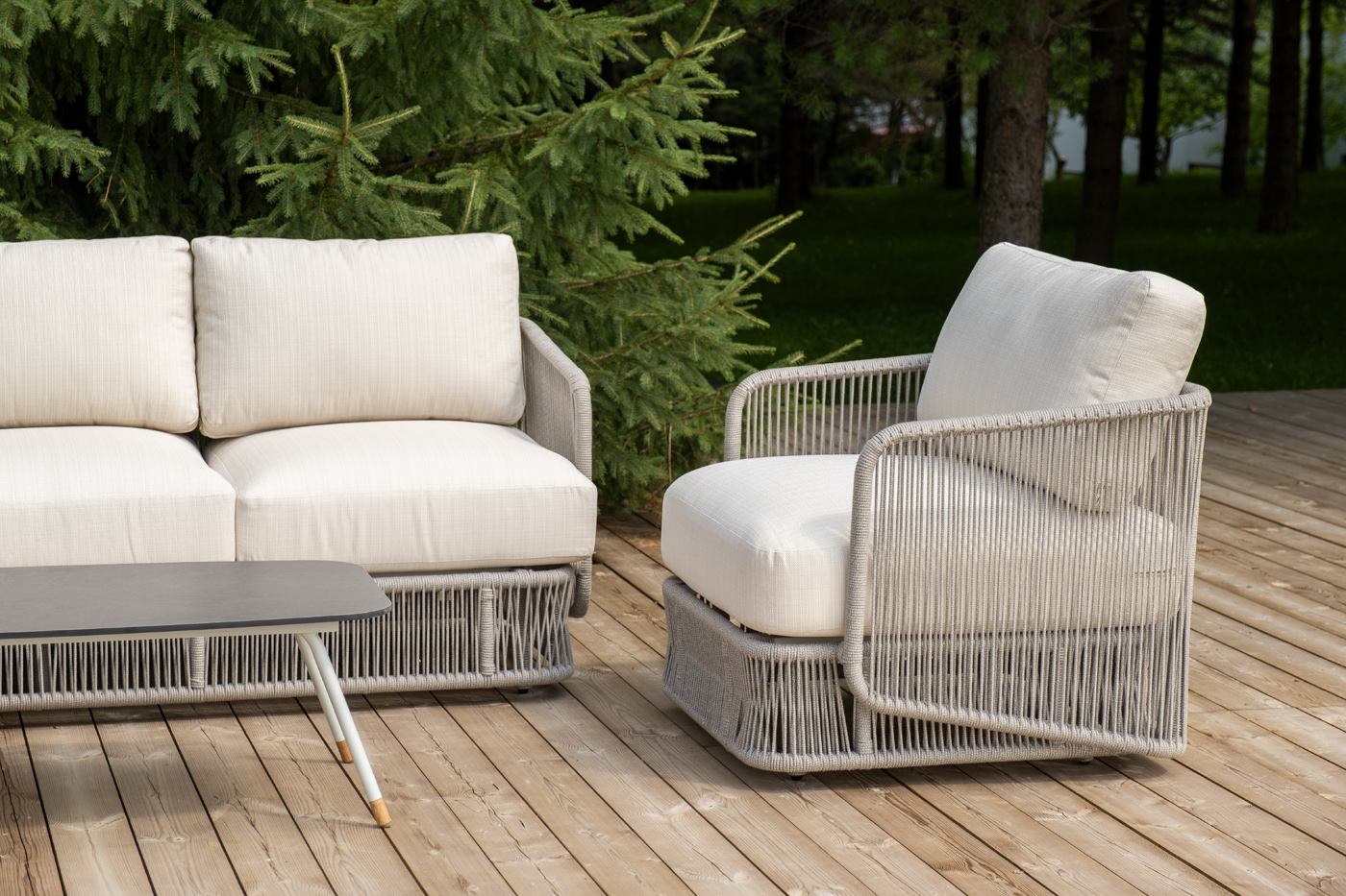- Лаунж-зоны — готовые комплекты из дивана, кресел и журнального столика. Сбалансированные композиции для 4-8 человек создают уютное пространство для общения. Все элементы выполнены в едином стиле с одинаковым типом плетения и цветом.