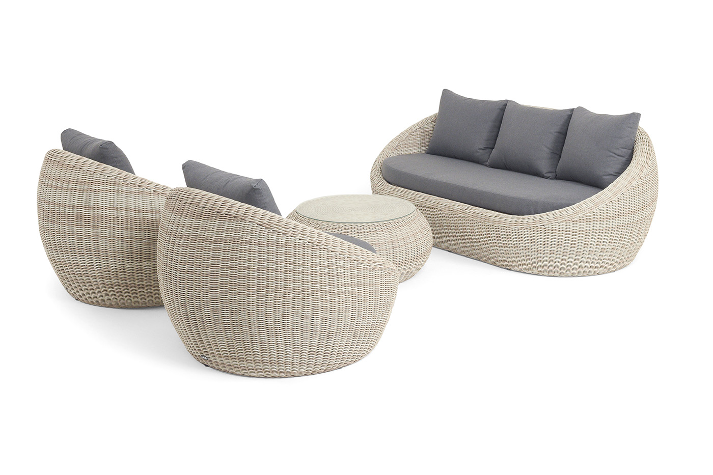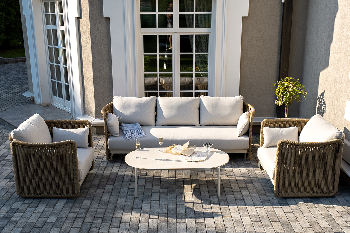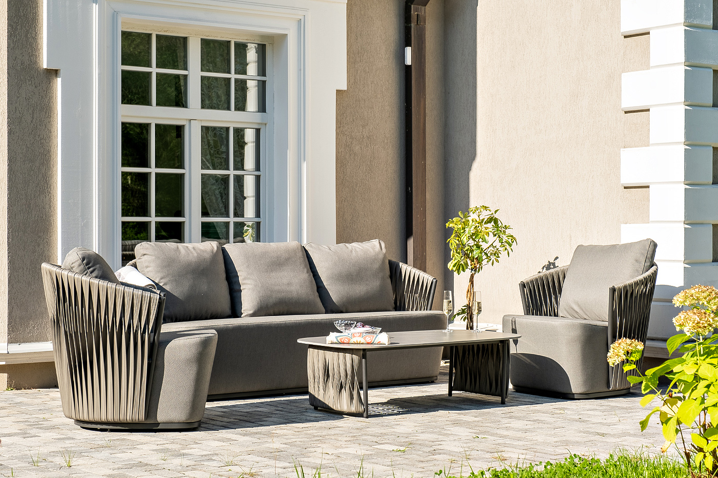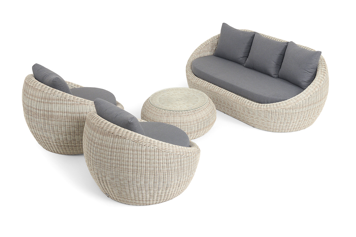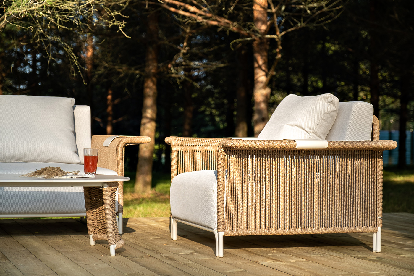 - Лаунж-зоны — готовые комплекты из дивана, кресел и журнального столика. Сбалансированные композиции для 4-8 человек создают уютное пространство для общения. Все элементы выполнены в едином стиле с одинаковым типом плетения и цветом.
