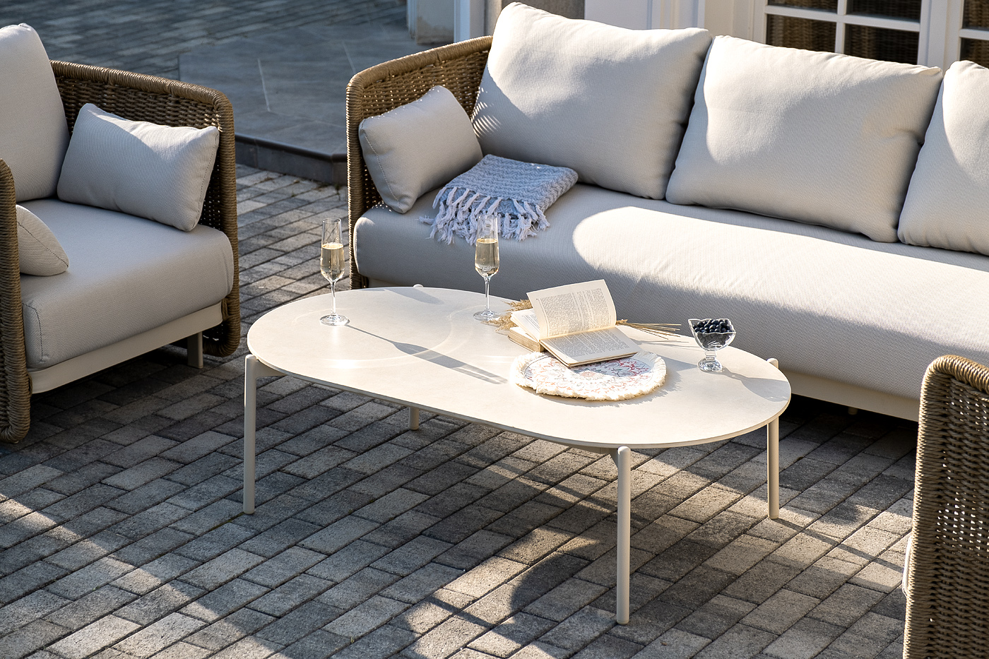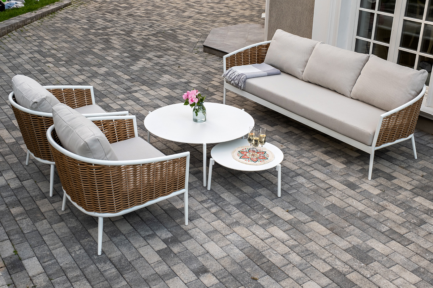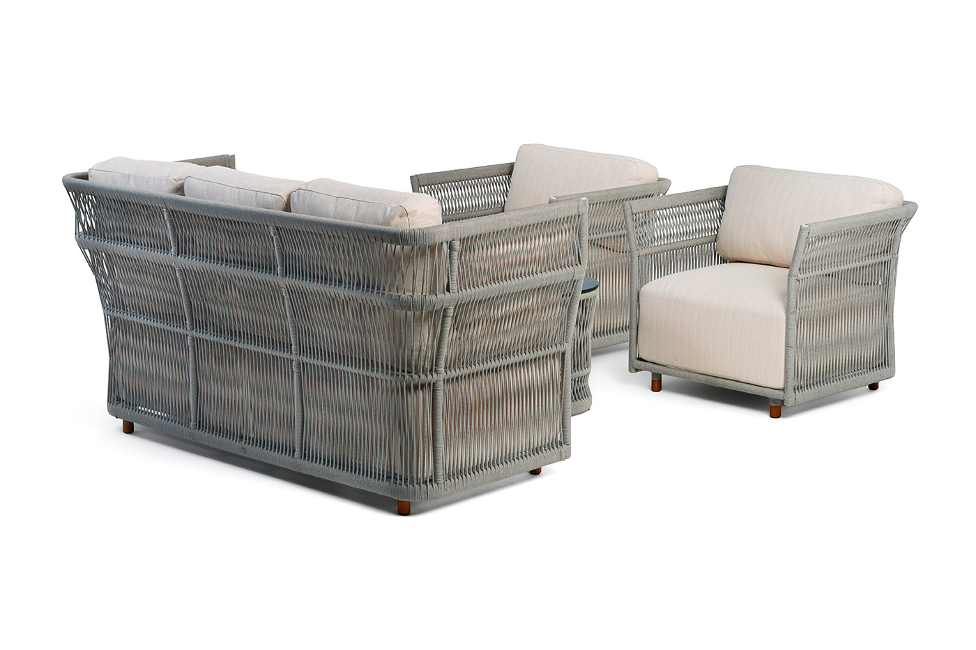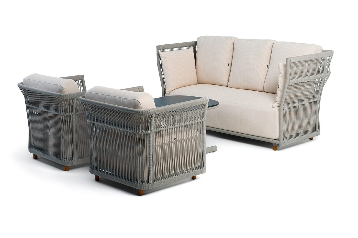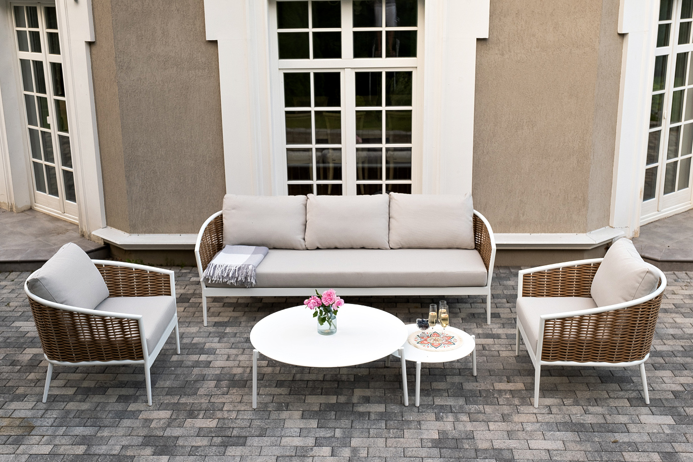 - Лаунж-зоны — готовые комплекты из дивана, кресел и журнального столика. Сбалансированные композиции для 4-8 человек создают уютное пространство для общения. Все элементы выполнены в едином стиле с одинаковым типом плетения и цветом.