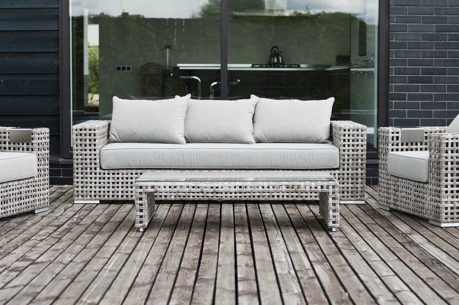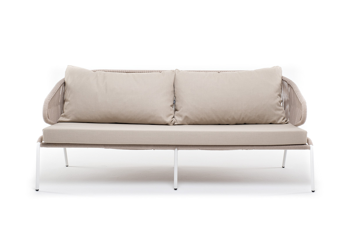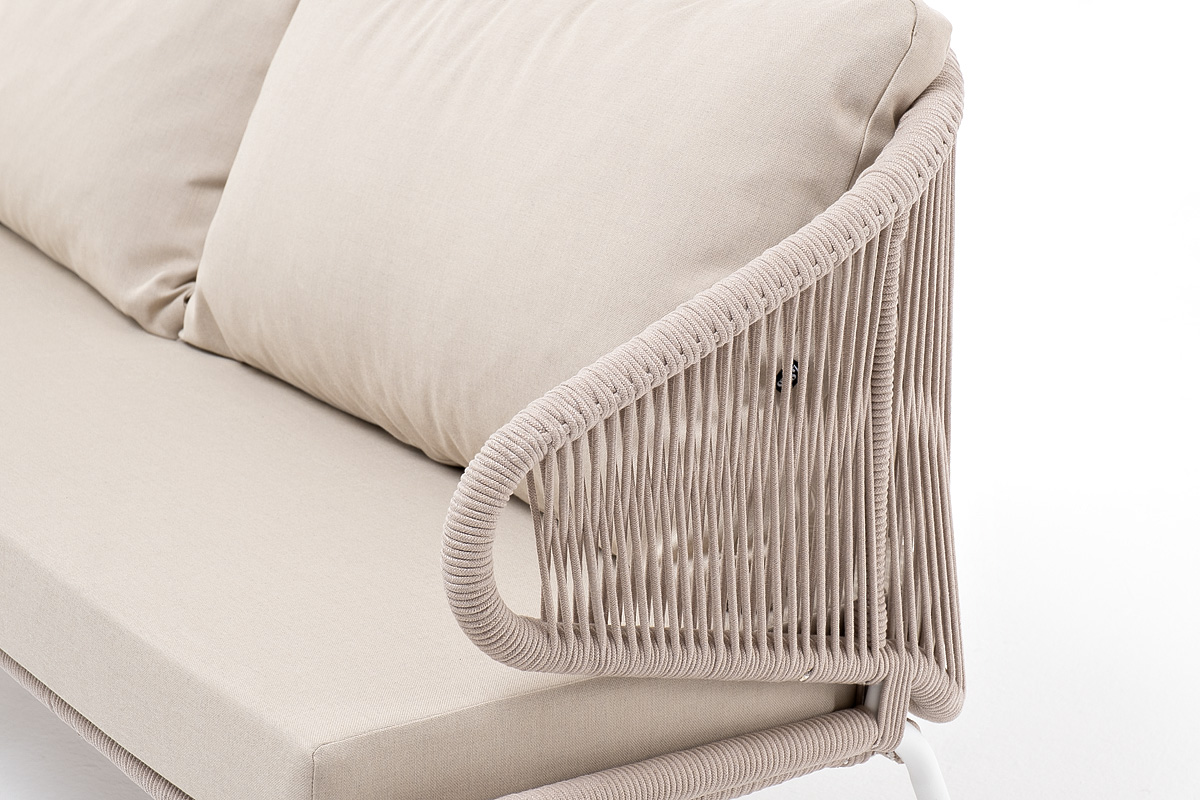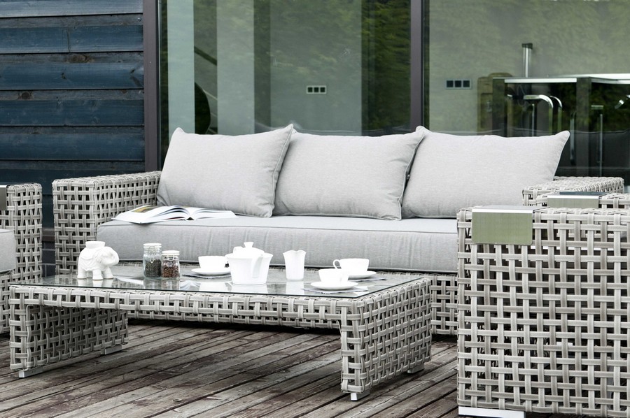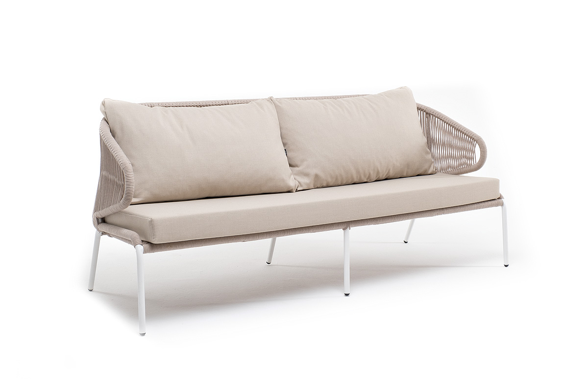 - Диваны — прямые 2-3-местные и угловые модели для террас, веранд и зимних садов. Плетение создаёт изящный дизайн, а мягкие подушки из влагостойких тканей обеспечивают комфорт. Каркас из алюминия выдерживает нагрузку до 150 кг на одно место. Глубина сиденья 65-75 см позволяет удобно расположиться для отдыха.