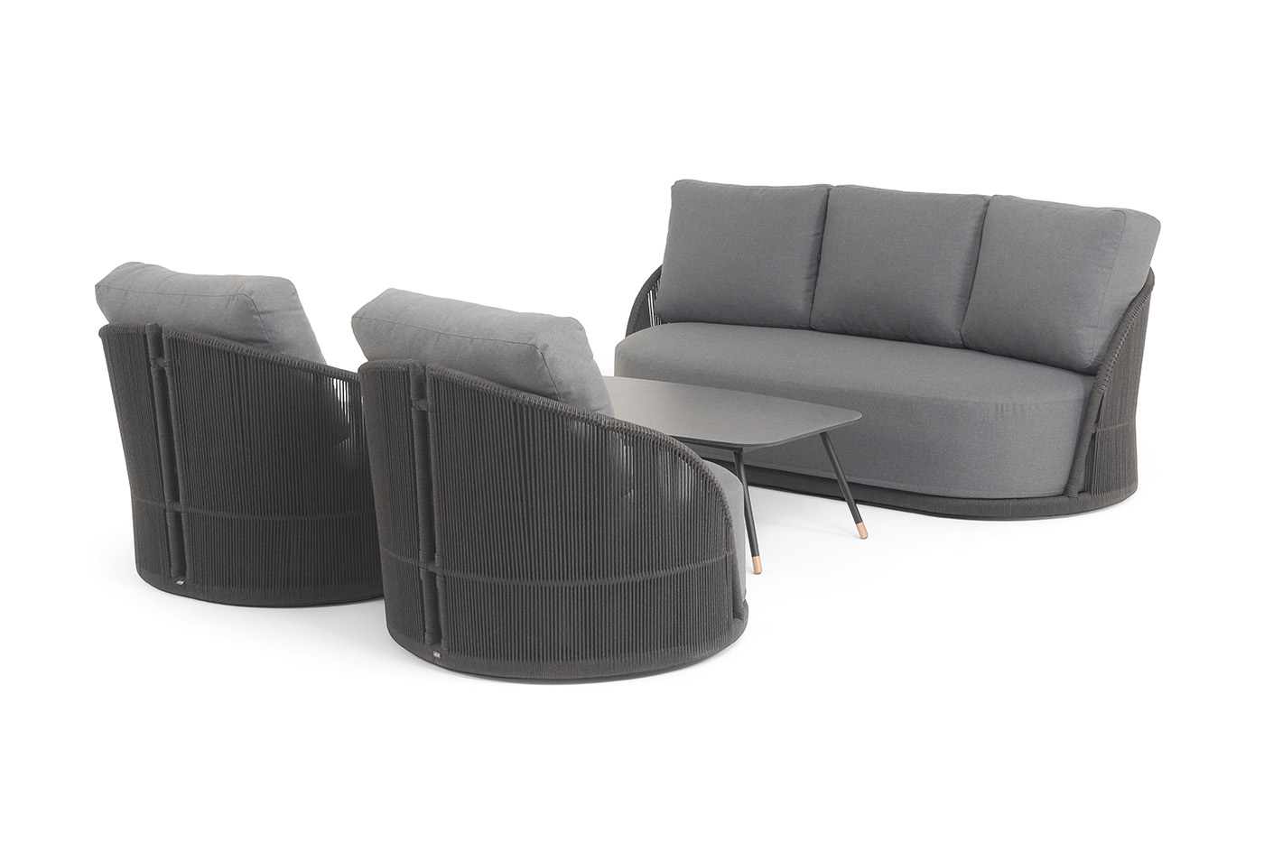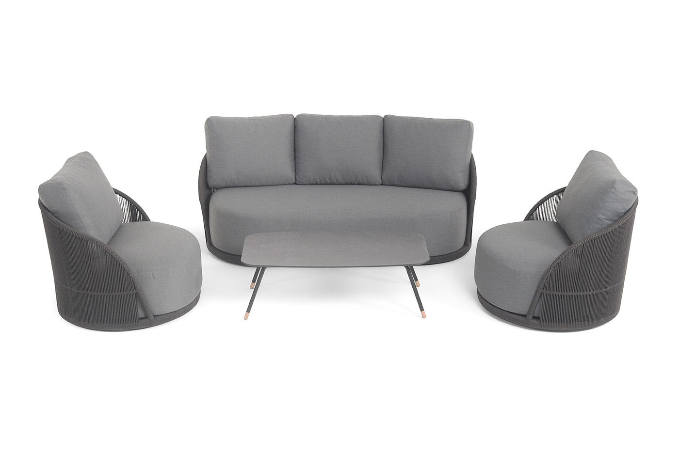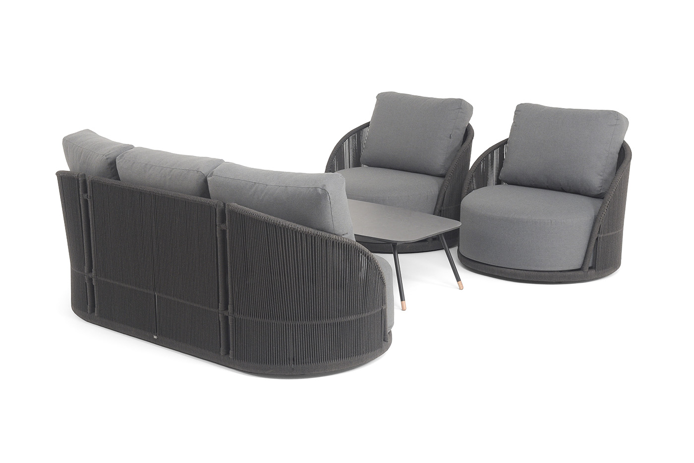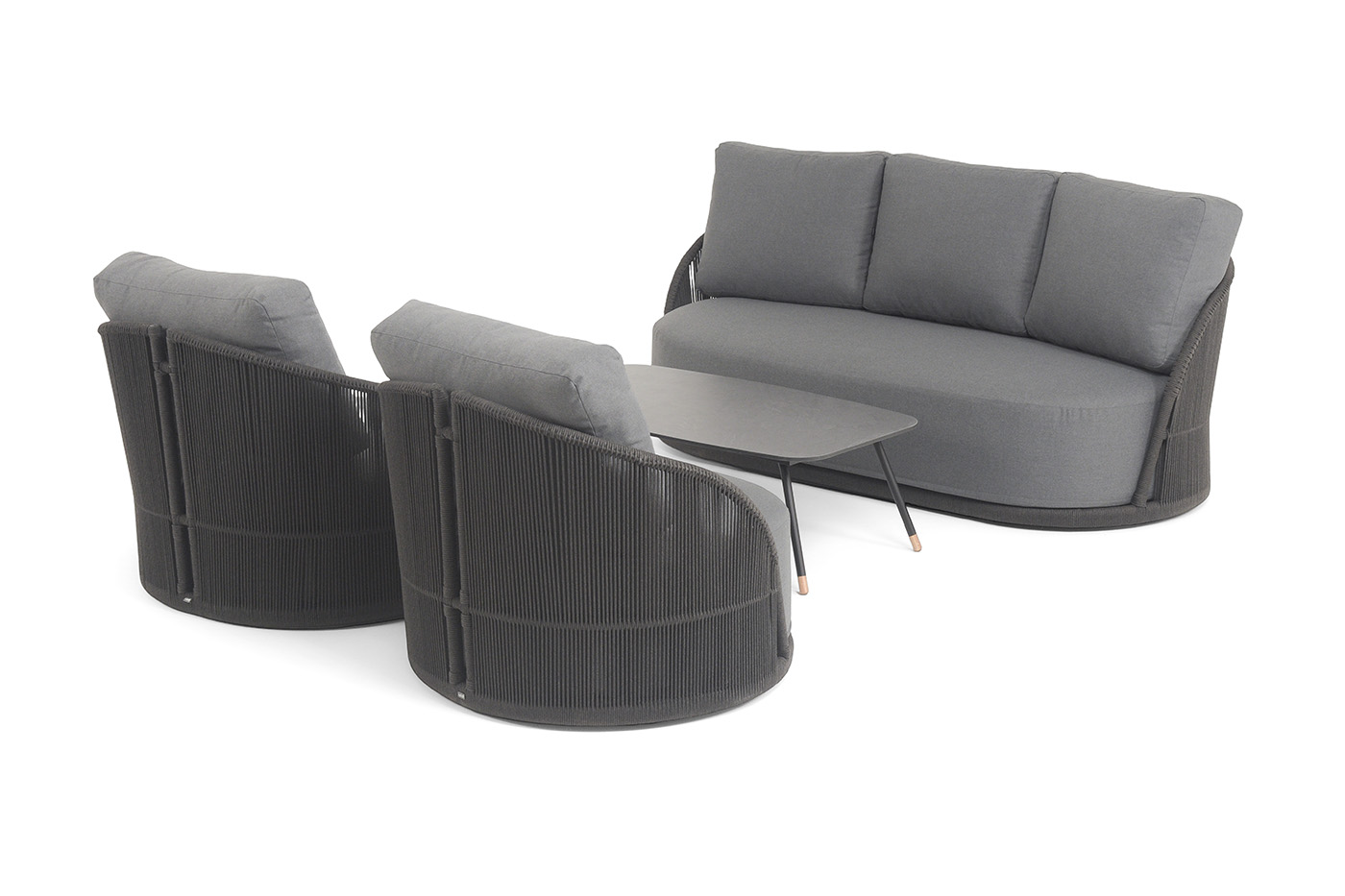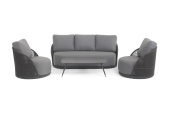 - Лаунж-зоны — готовые комплекты из дивана, кресел и журнального столика. Сбалансированные композиции для 4-8 человек создают уютное пространство для общения. Все элементы выполнены в едином стиле с одинаковым типом плетения и цветом.