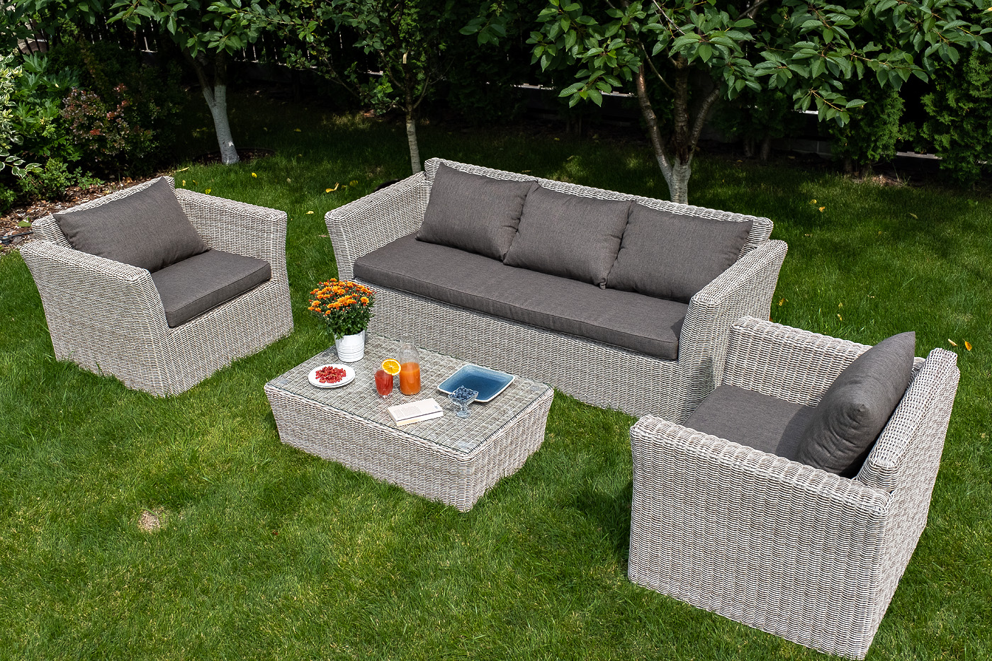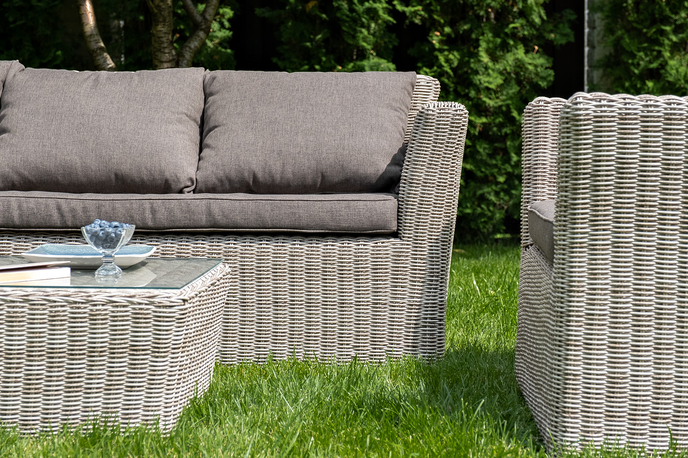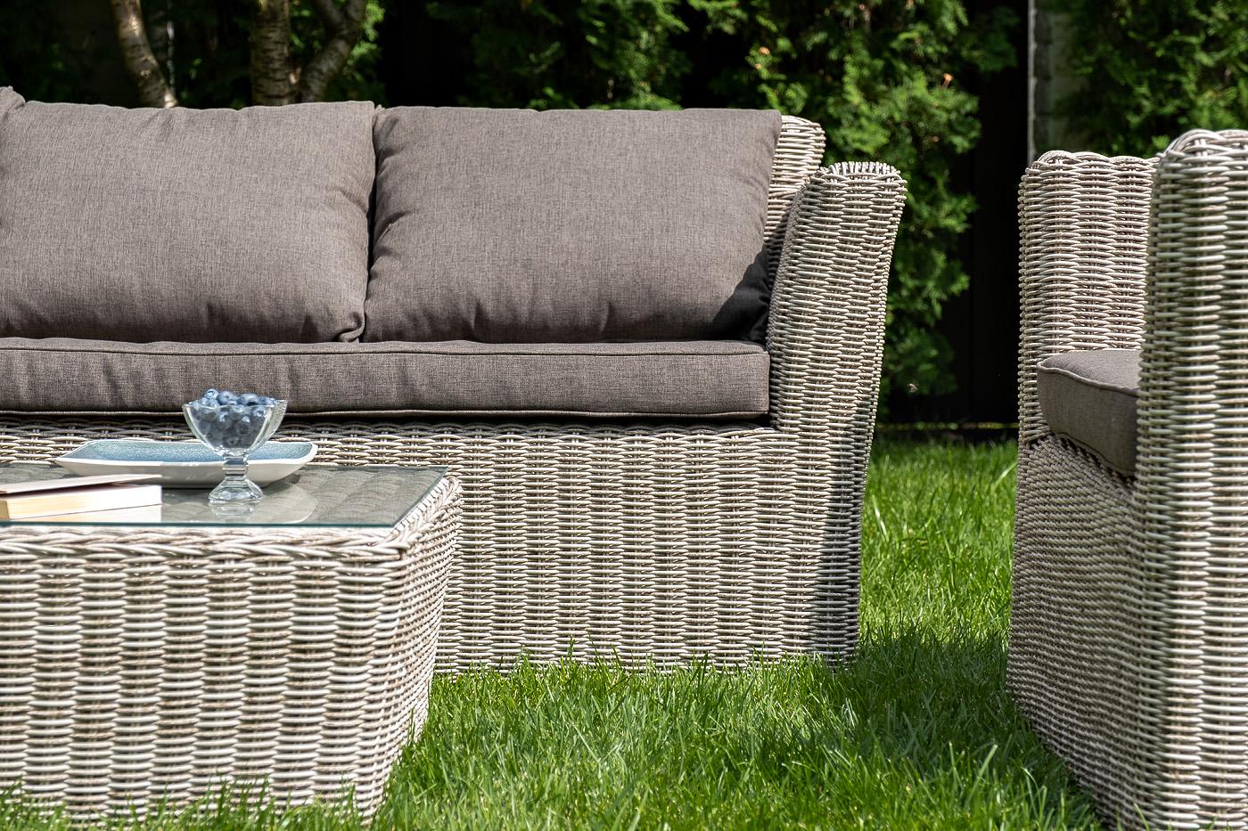 Размеры модели: 2220×865×815 мм, которые позволяют разместить трех человек. Подушки, входящие в комплект, выполнены из высококачественного полиэстера с влагоотталкивающей пропиткой.