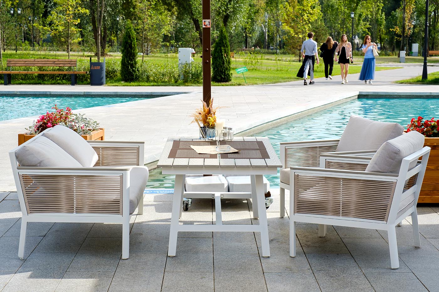 В комплекте - подушки со съёмными чехлами из 100%-го полиэстера, плотностью 300гр/м2. Ткань имеет влагоотталкивающую пропитку.