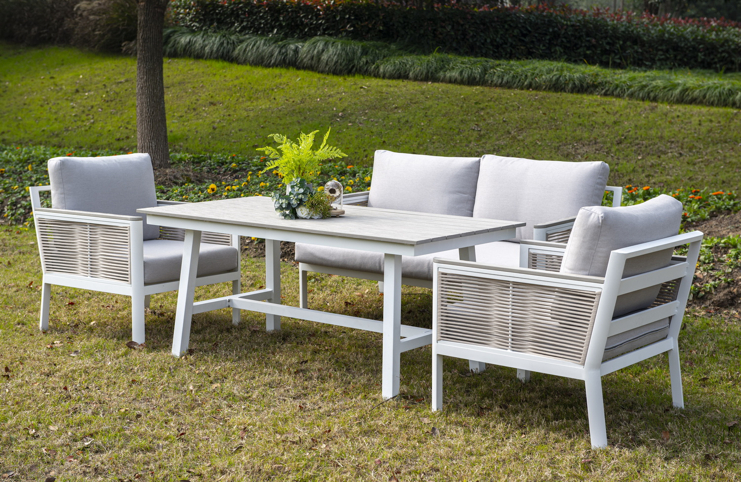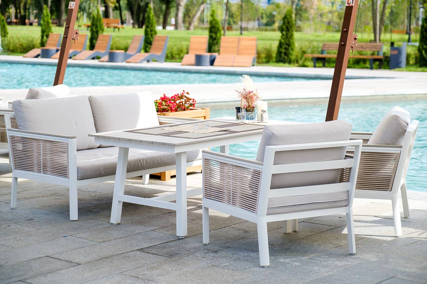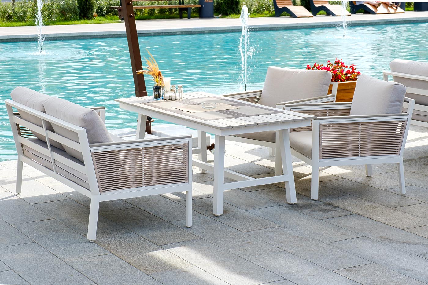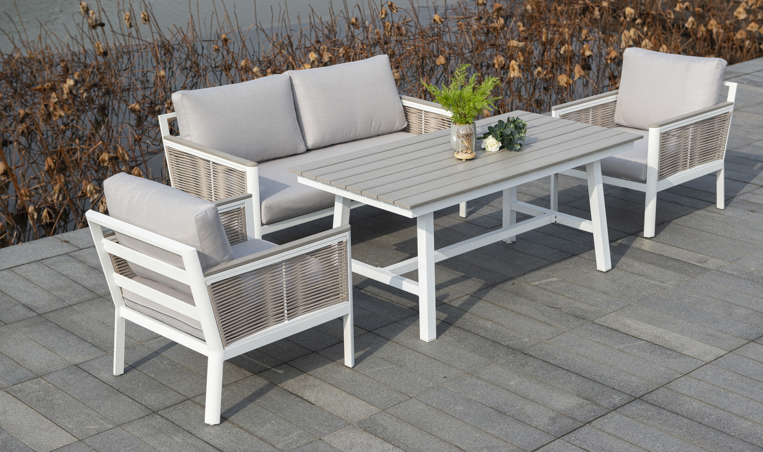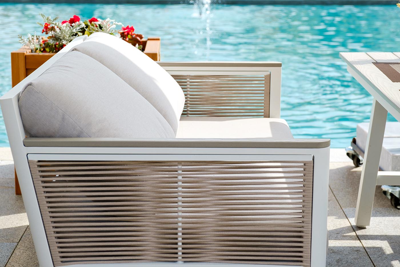 Каркас выполнен из высококачественного алюминия и окрашен порошковой краской в белый цвет. Боковые стороны подлокотников вручную оплетены эластичными синтетическими лентами серо-коричневого оттенка, состоящие из высокопрочных полиэфирных волокон.