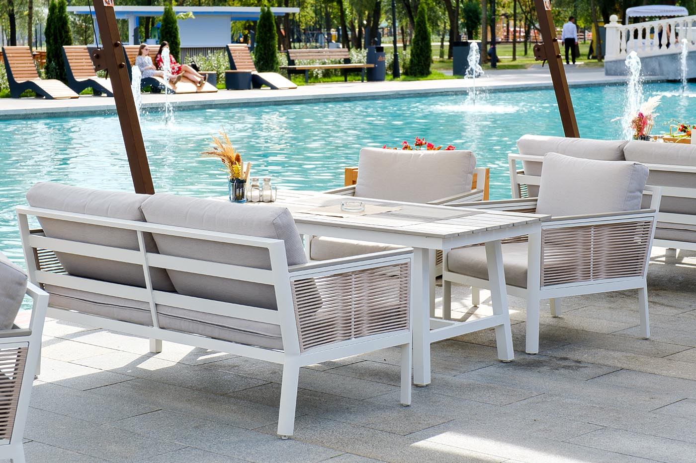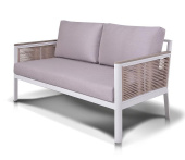 "Сан Ремо" диван 2-местный плетеный из роупа, каркас алюминий белый, роуп бежевый, ткань бежевая