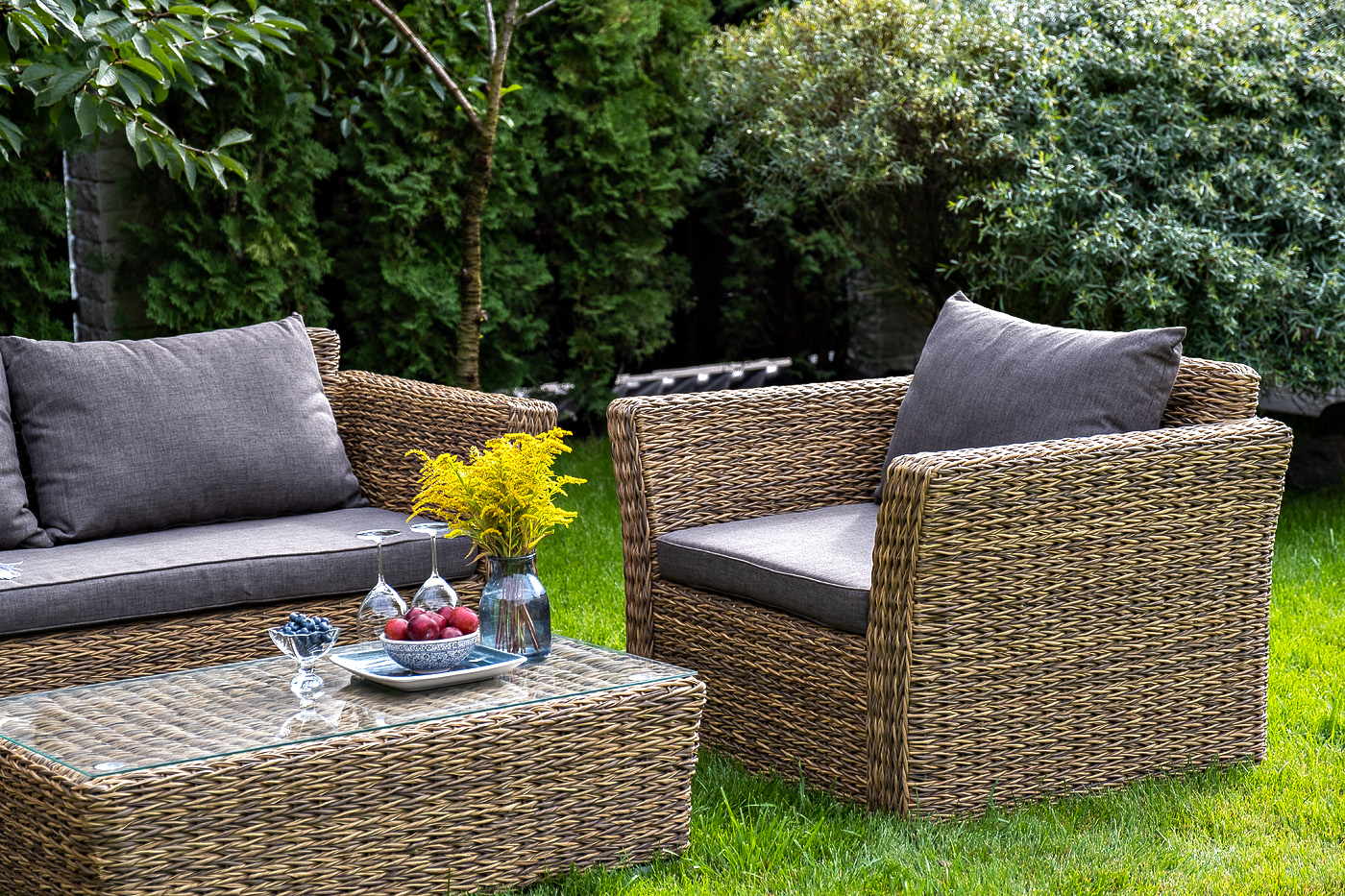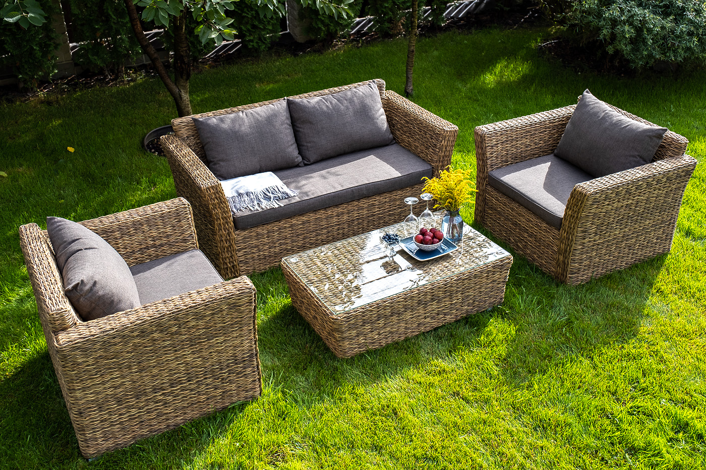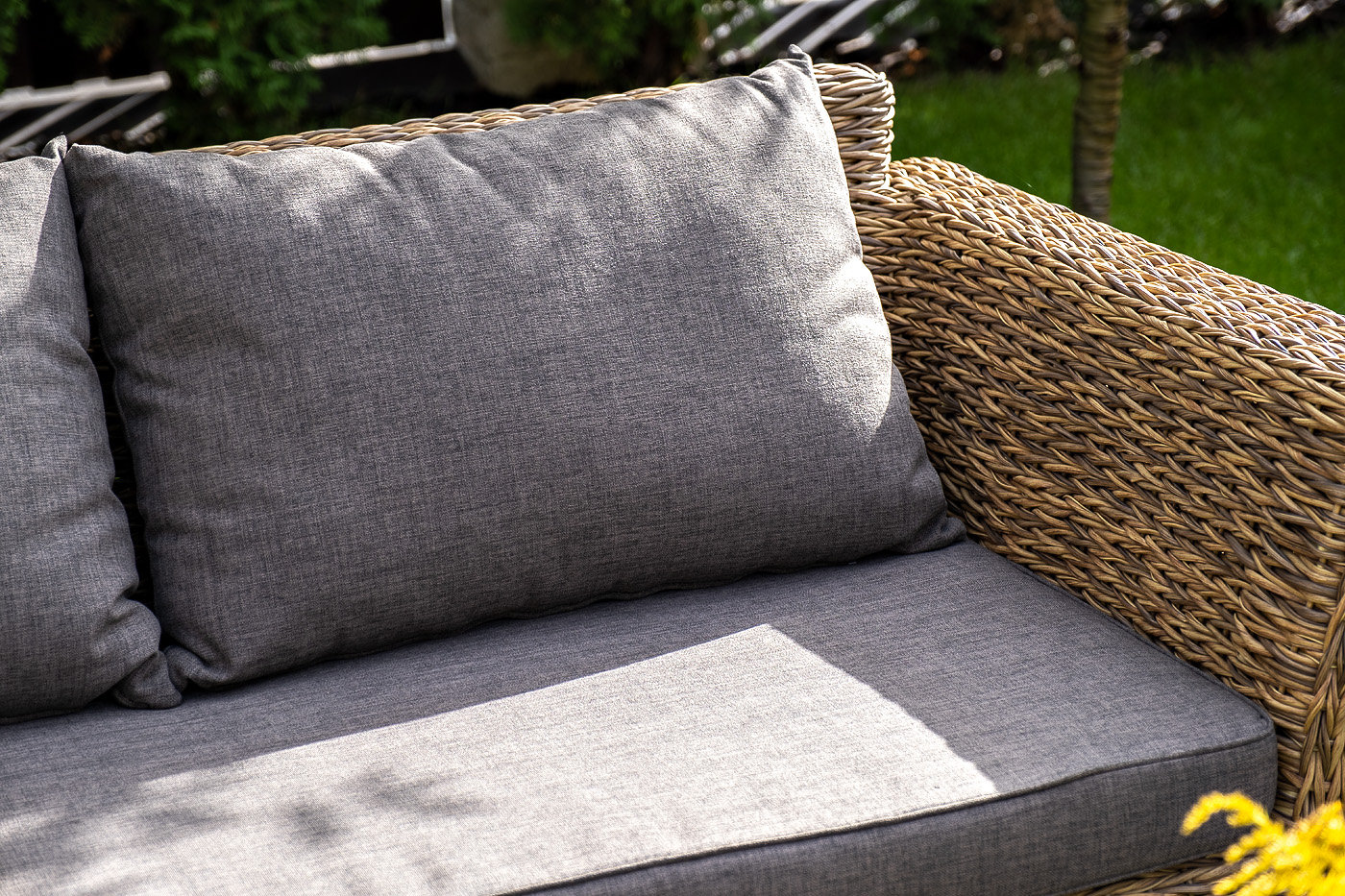 Двухместный диван дополнен несколькими подушками со съёмными чехлами серого цвета. Они изготовлены из прочного полиэстера, плотность которого достигает 300гр/м2. Предусмотрена влагоотталкивающая пропитка ткани для защиты текстильных изделий от намокания.