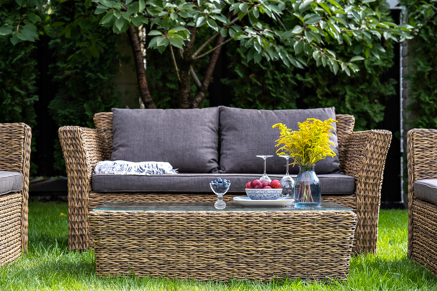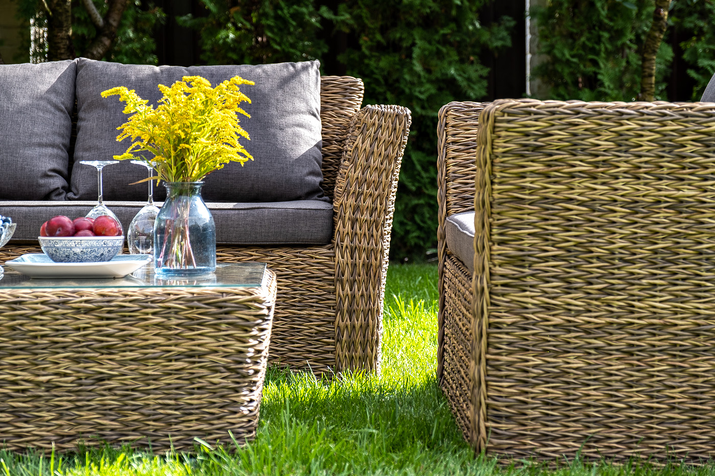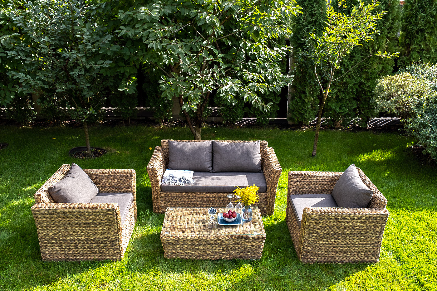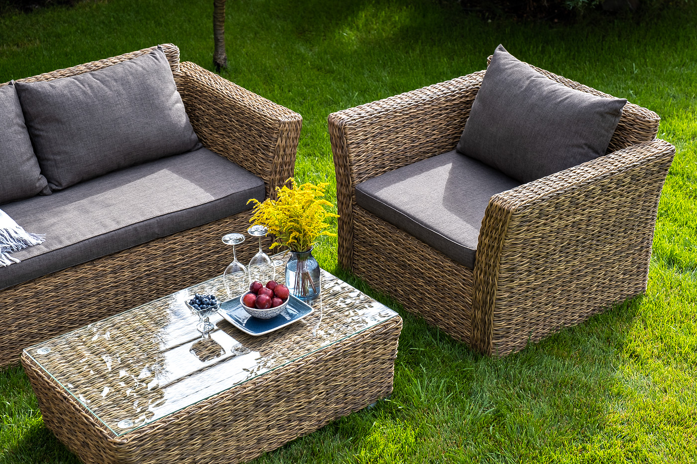 Двухместный диван дополнен несколькими подушками со съёмными чехлами серого цвета. Они изготовлены из прочного полиэстера, плотность которого достигает 300гр/м2. Предусмотрена влагоотталкивающая пропитка ткани для защиты текстильных изделий от намокания.