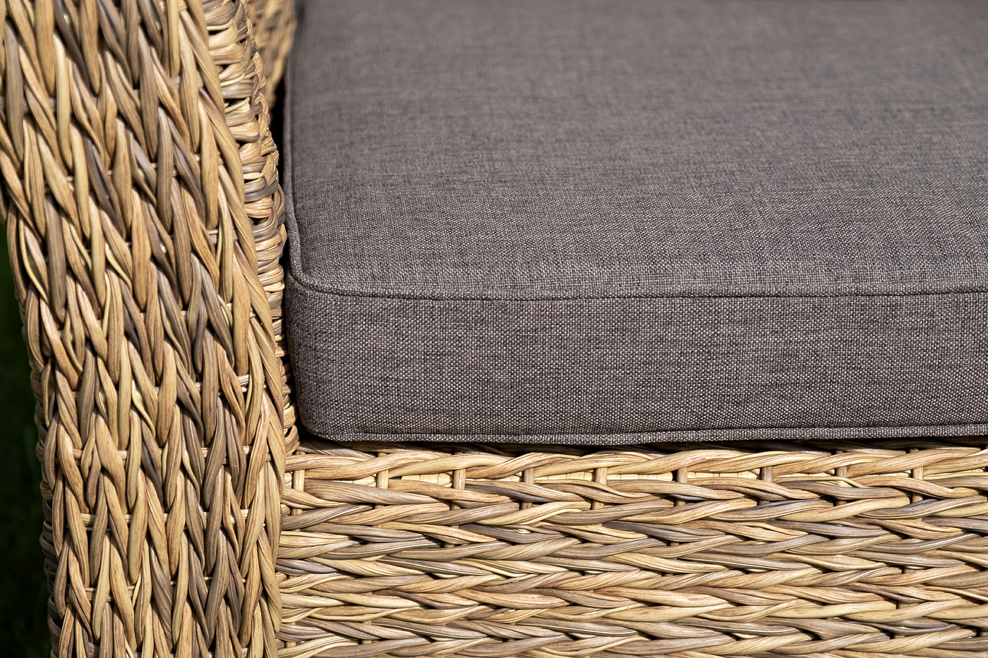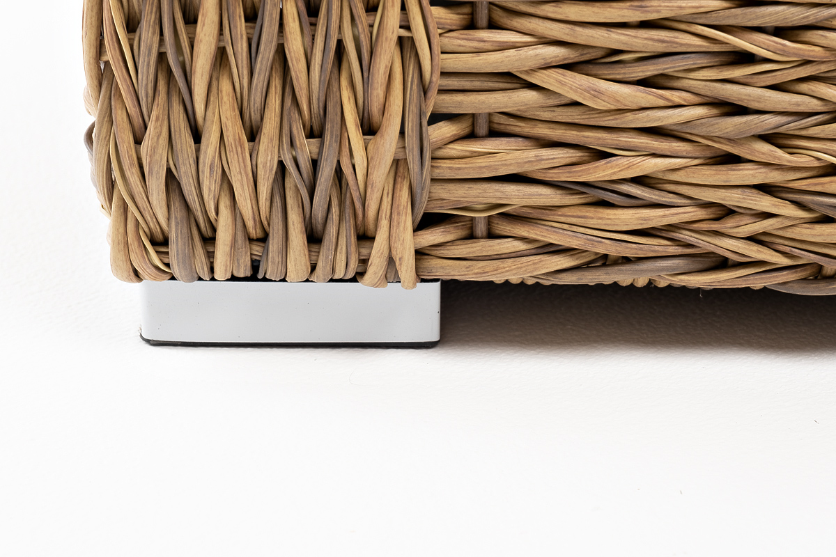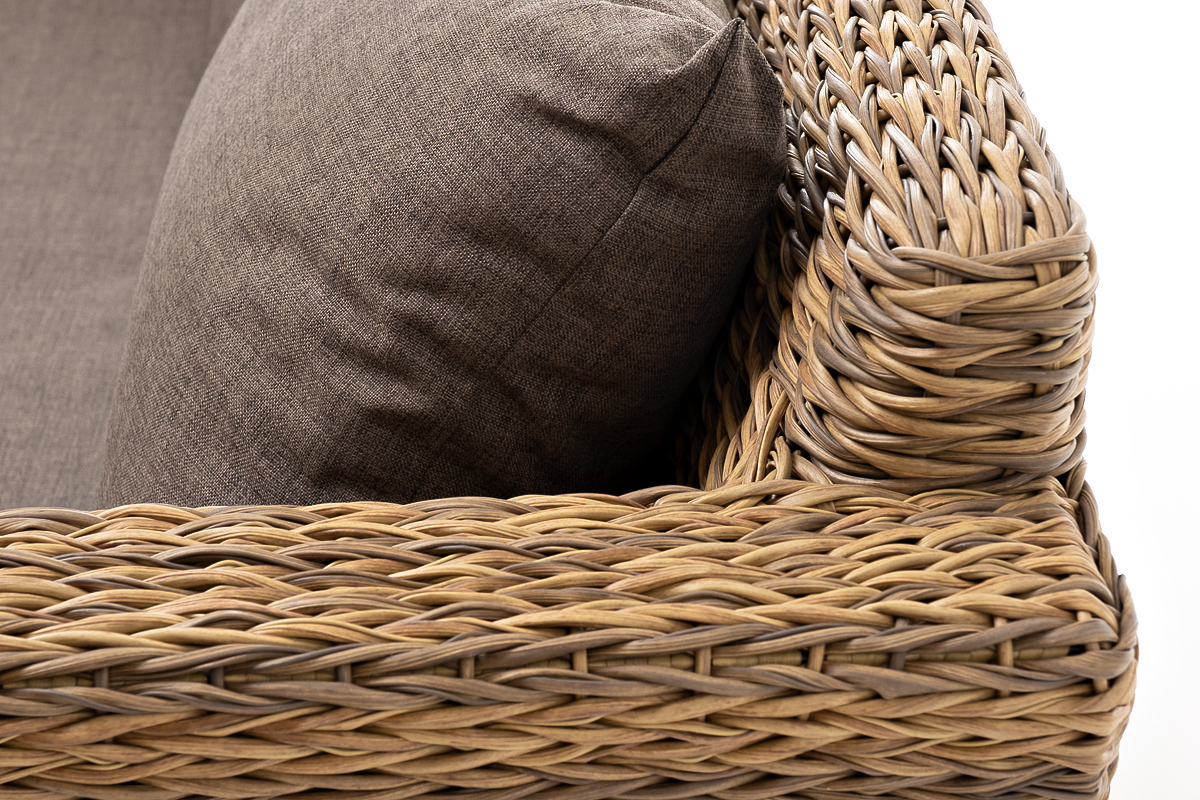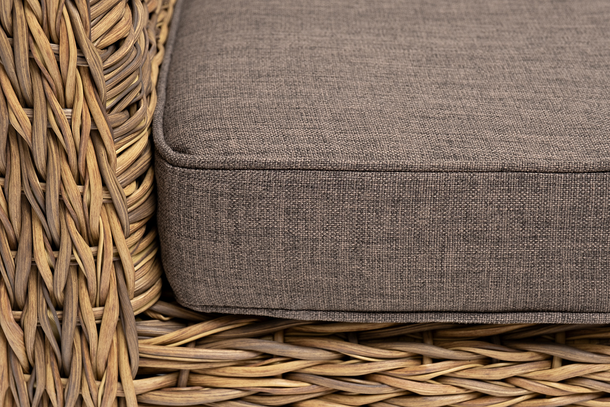 Диван выполнен из искусственного ротанга вида «гиацинт» соломенного цвета, оплетенного вручную.