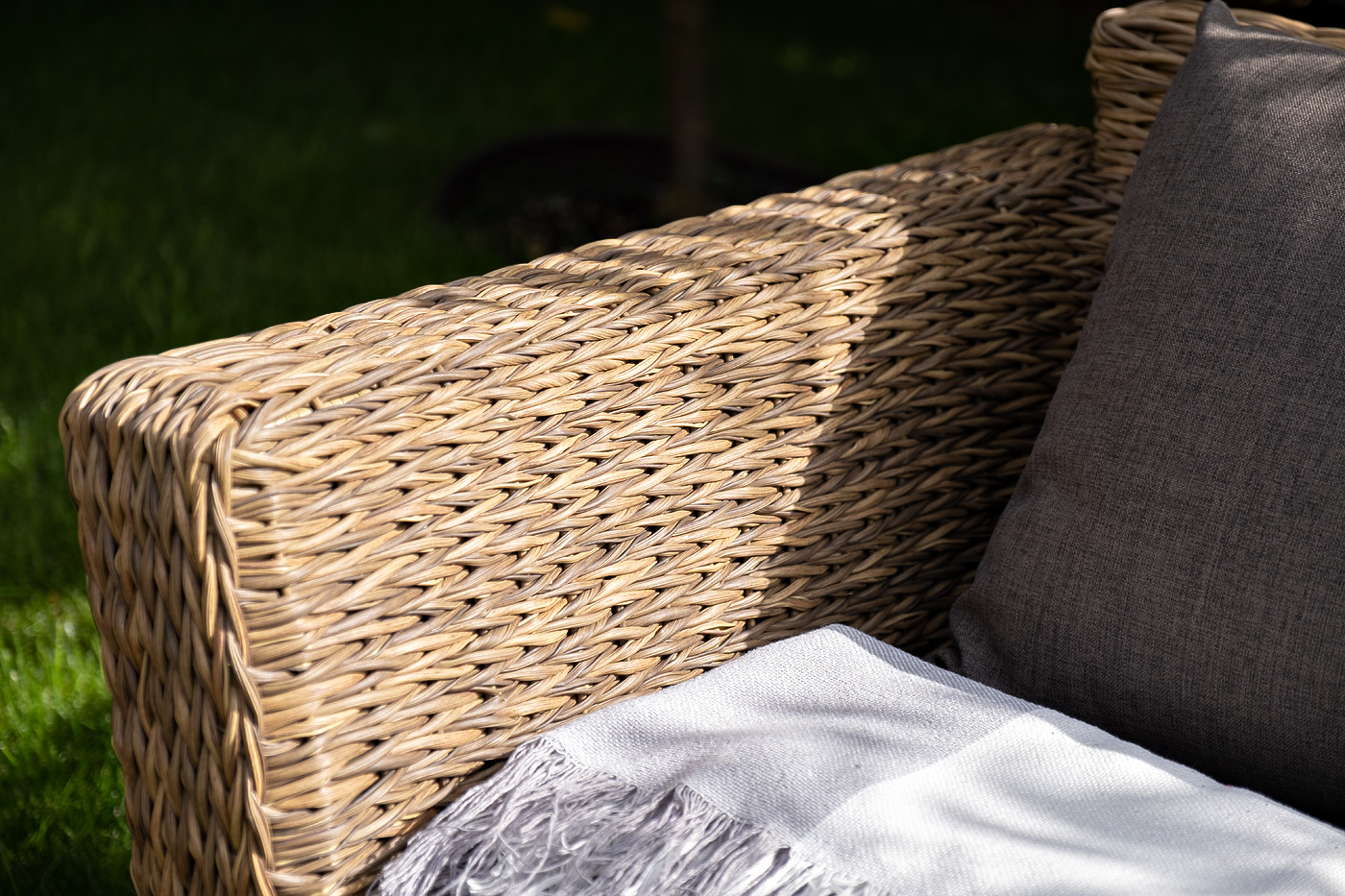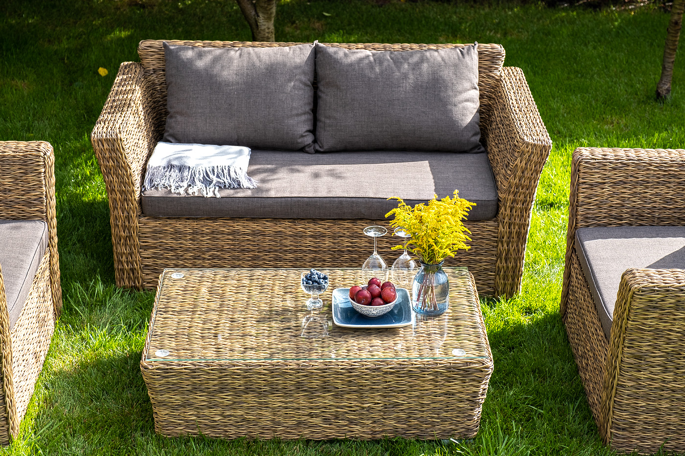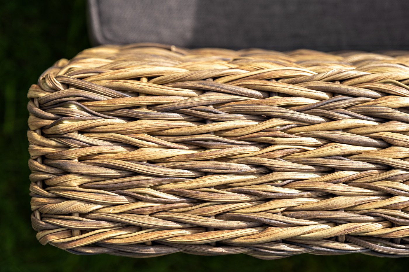 Диван выполнен из искусственного ротанга вида «гиацинт» соломенного цвета, оплетенного вручную.