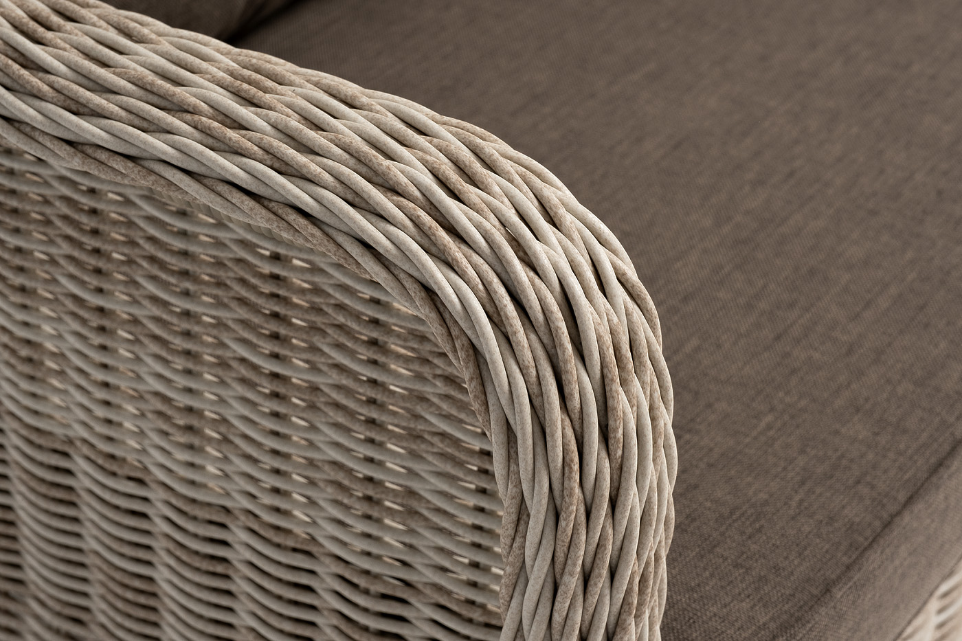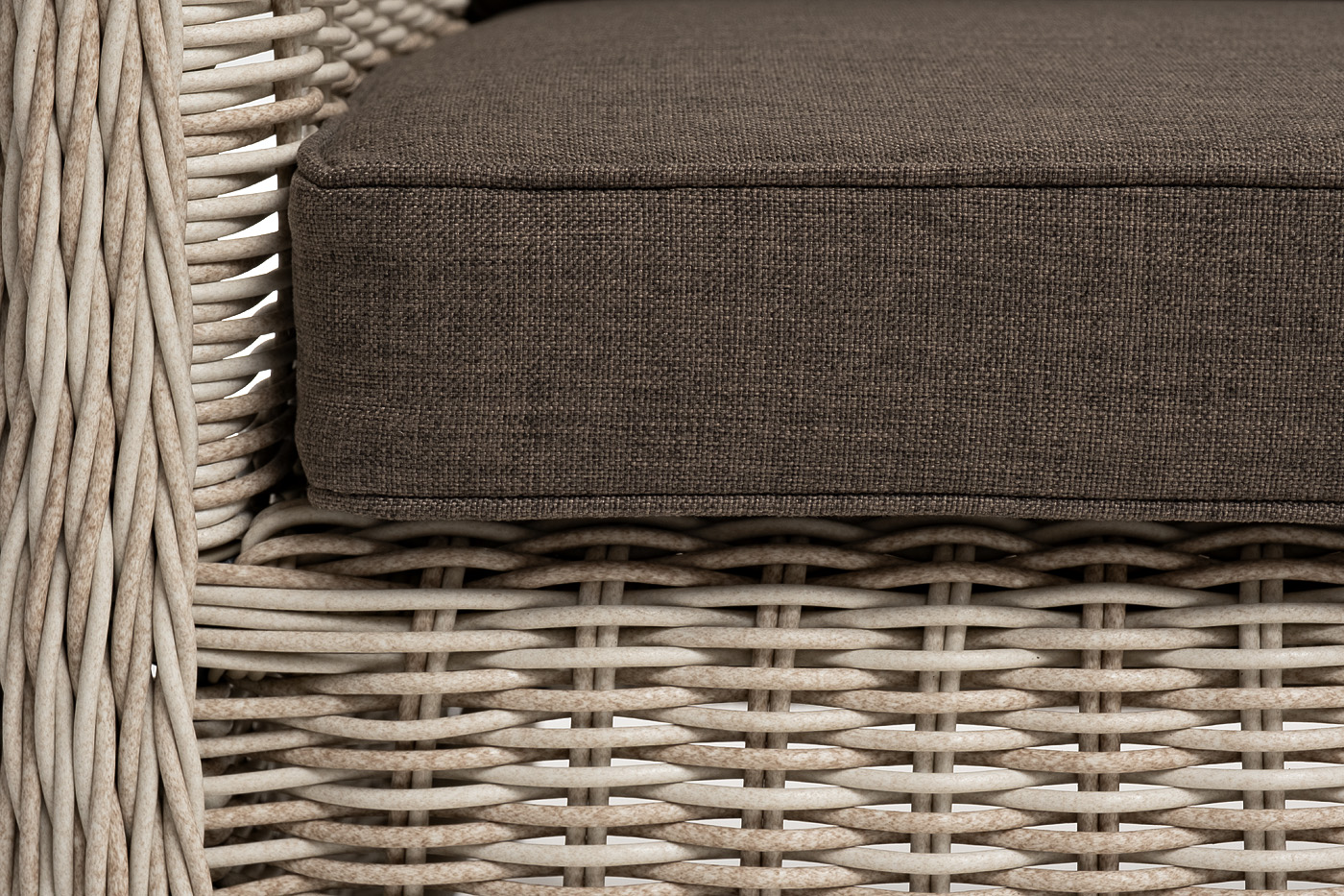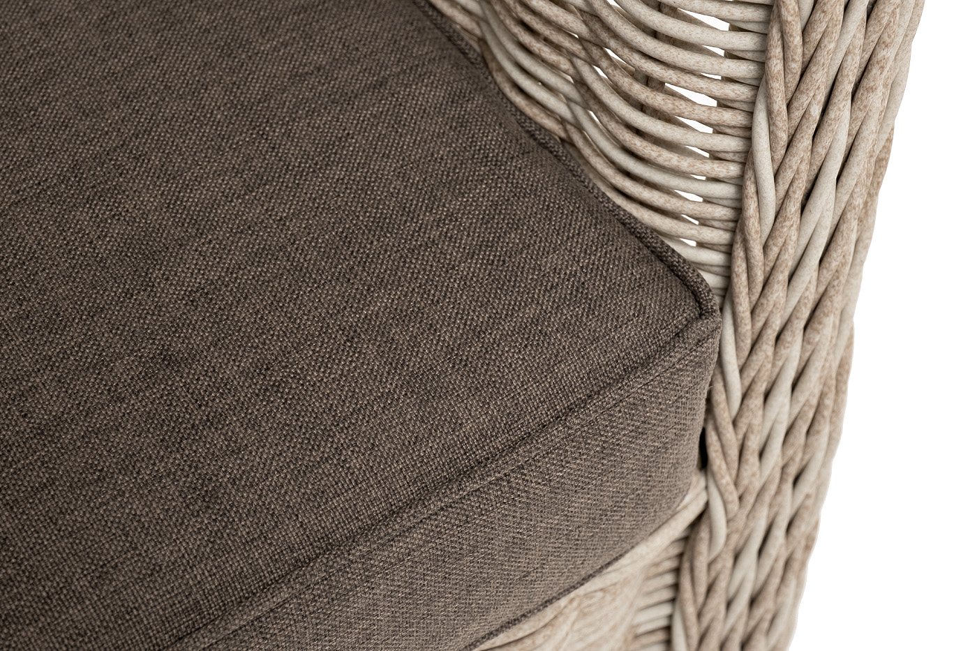 Ручное круглое плетение является основным декоративным элементом мебели. Оно выполнено из искусственного ротанга в бежевом цвете.
