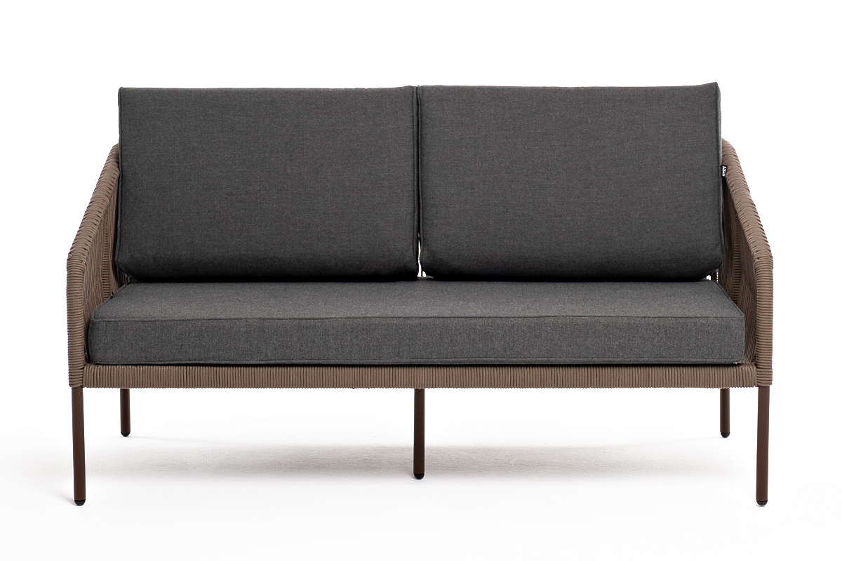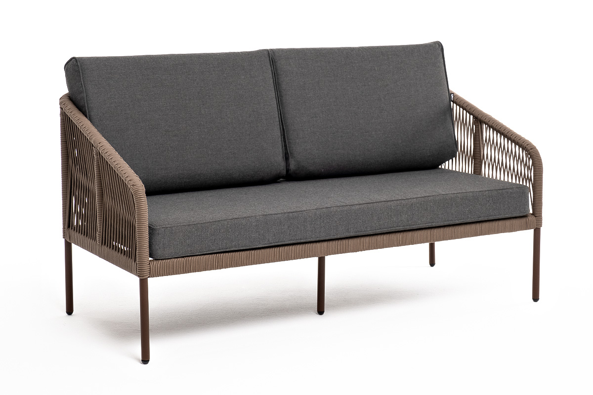 "Канны" диван 2-местный плетеный из роупа, каркас алюминий коричневый (RAL8016) муар, роуп коричневый круглый, ткань темно-серая 027