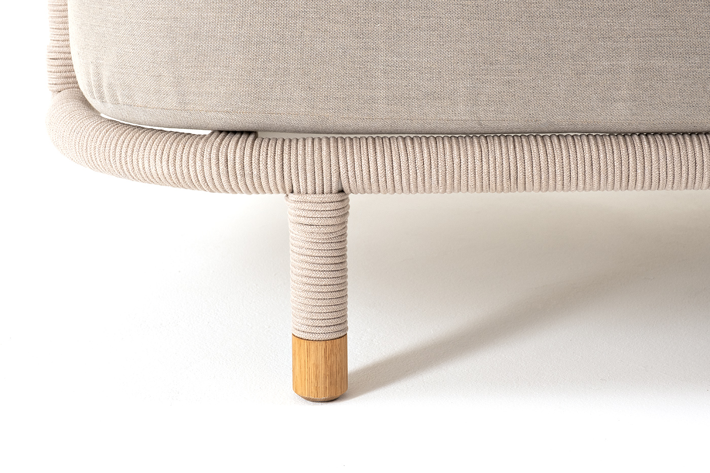 Диван имеет алюминиевый каркас, окрашенный порошковой краской в белый цвет. Боковины каркаса и спинка вручную оплетены роупом - эластичными синтетическими лентами, изготовленными из высокопрочных полиэфирных волокон. Цвет оплетки - бежевый. На ножках дивана идут дубовые наконечники (заглушки).