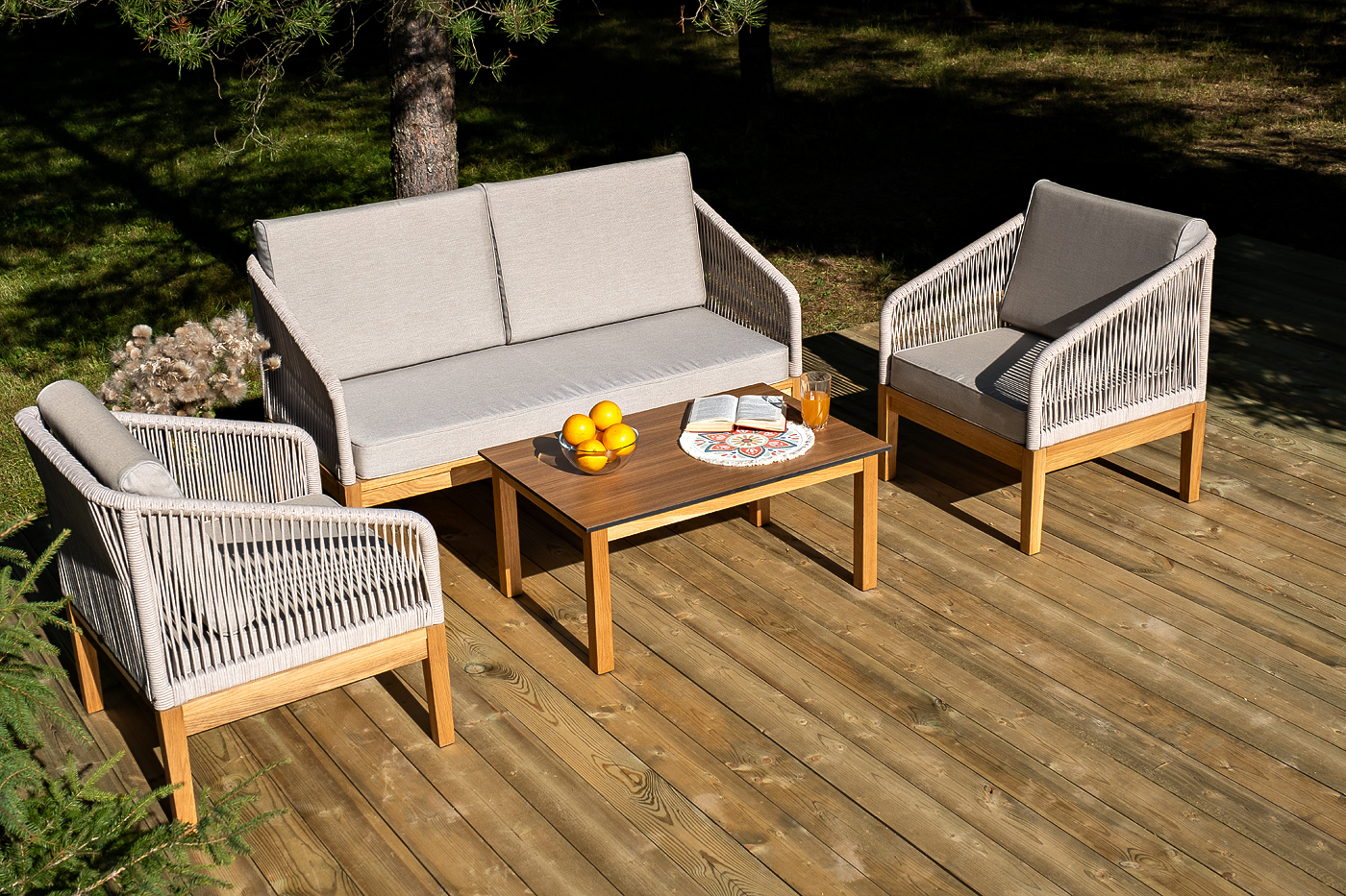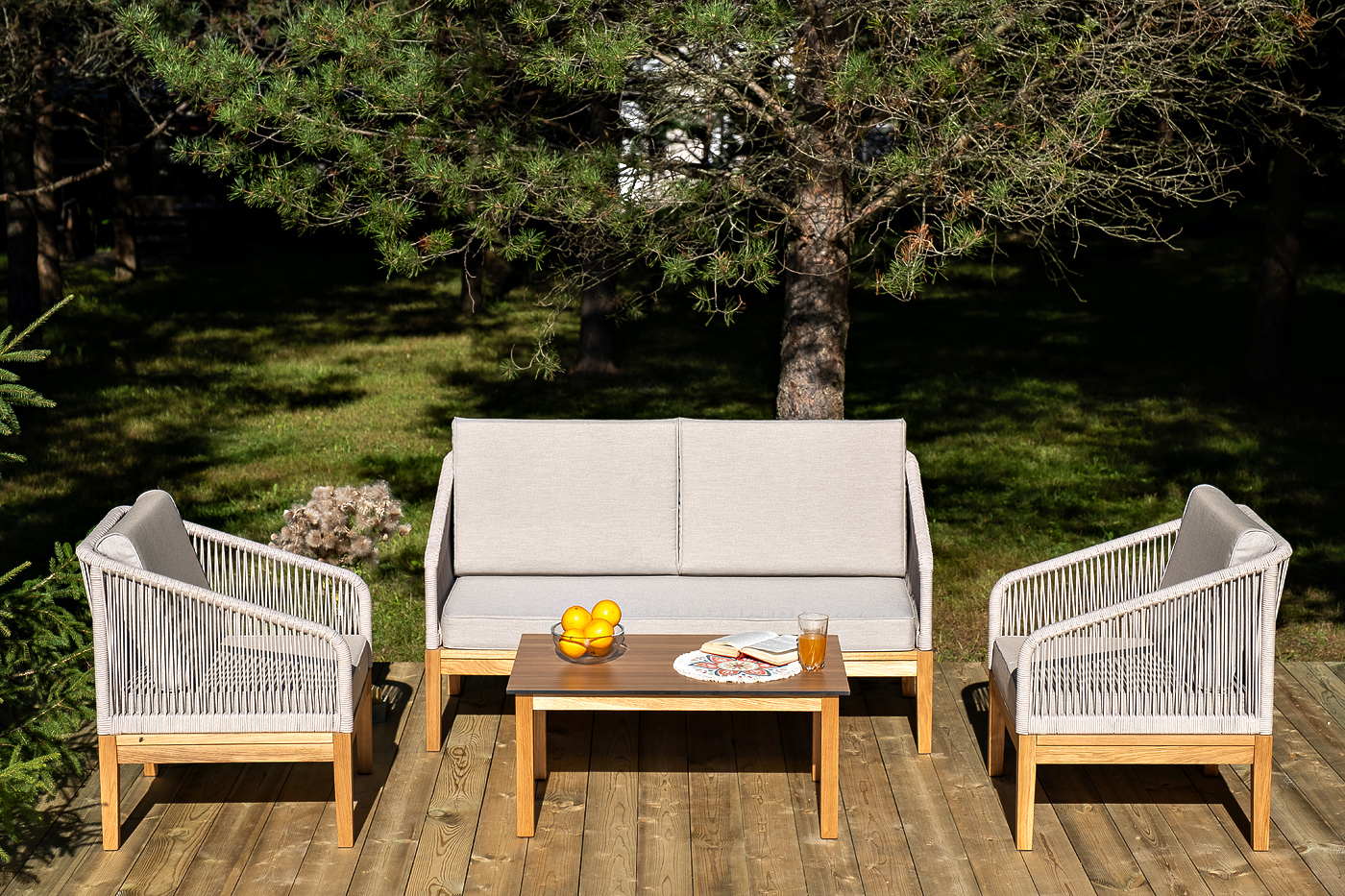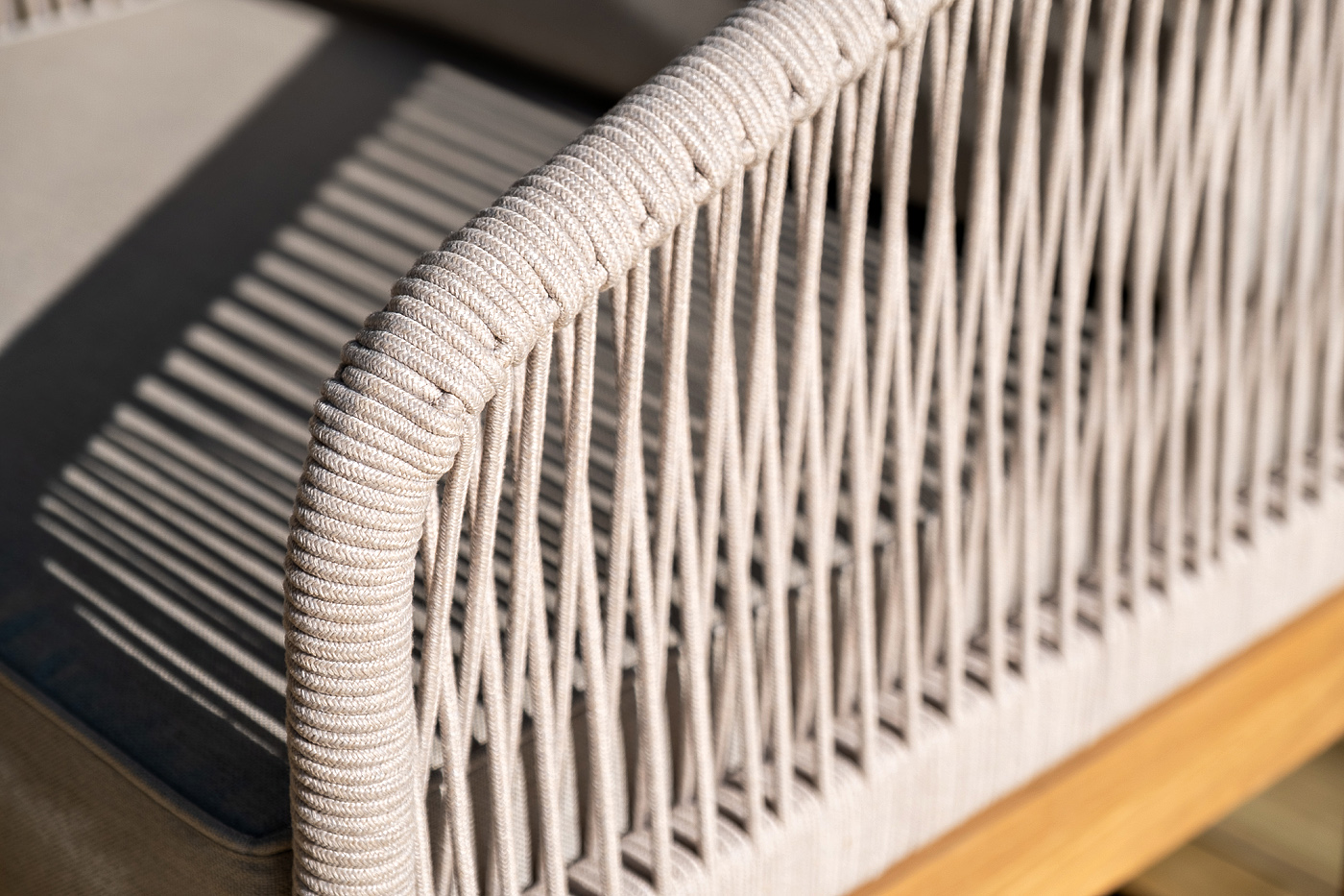 Боковины каркаса и спинка вручную оплетены роупом - эластичными синтетическими лентами, изготовленными из высокопрочных полиэфирных волокон. Цвет оплетки - бежевый. Основание - дуб.