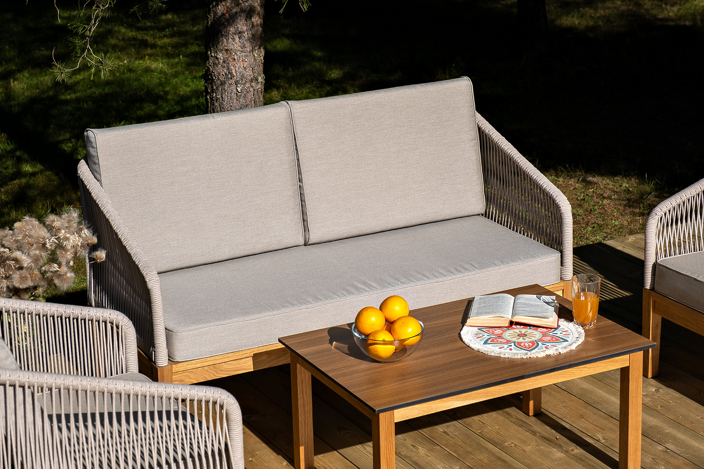 "Канны" диван 2-местный плетеный из роупа, основание дуб, роуп бежевый круглый, ткань бежевая 15052
