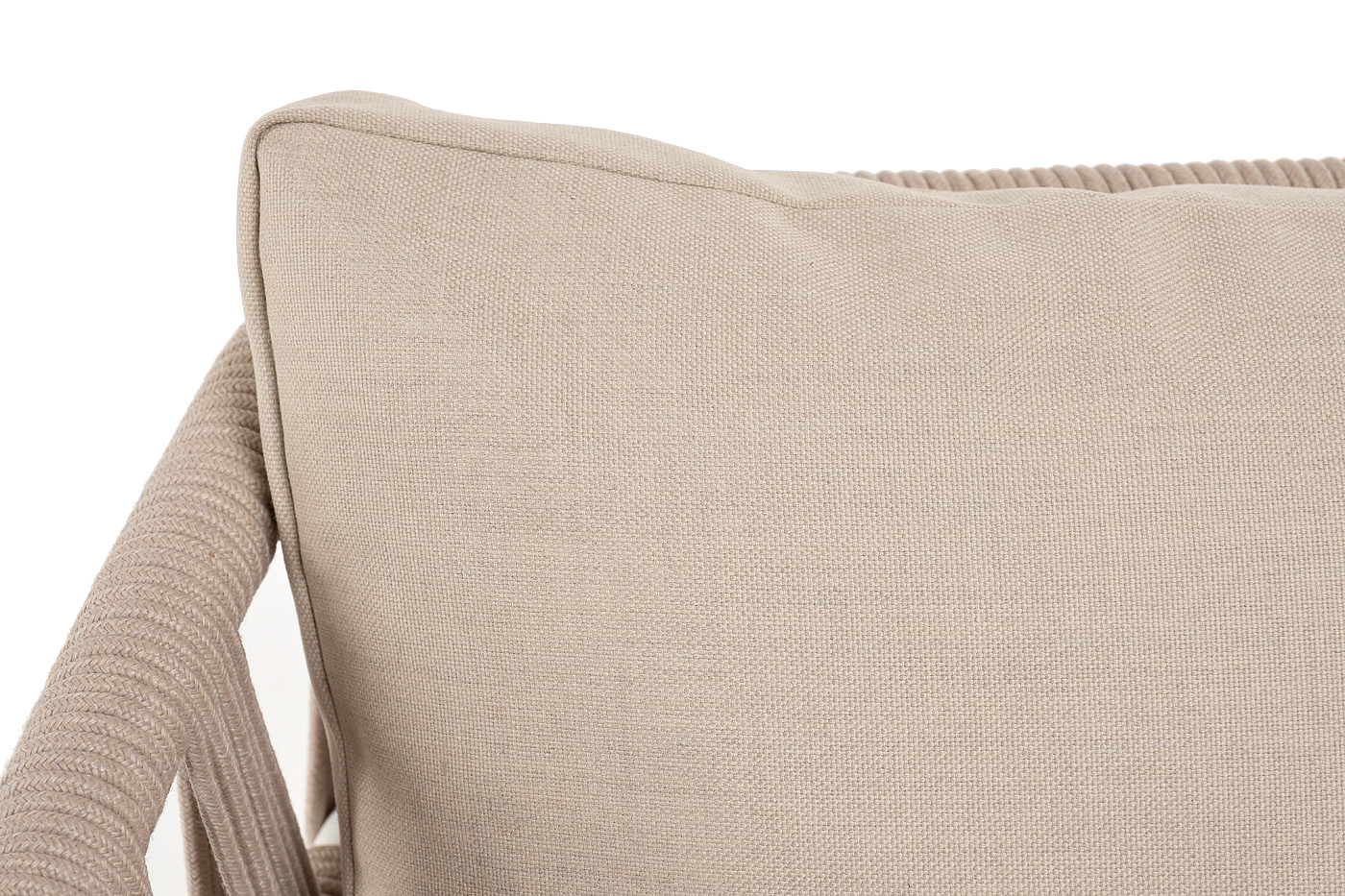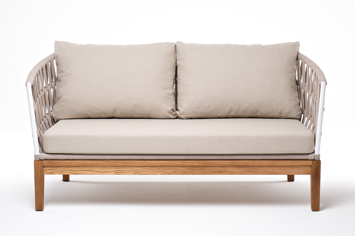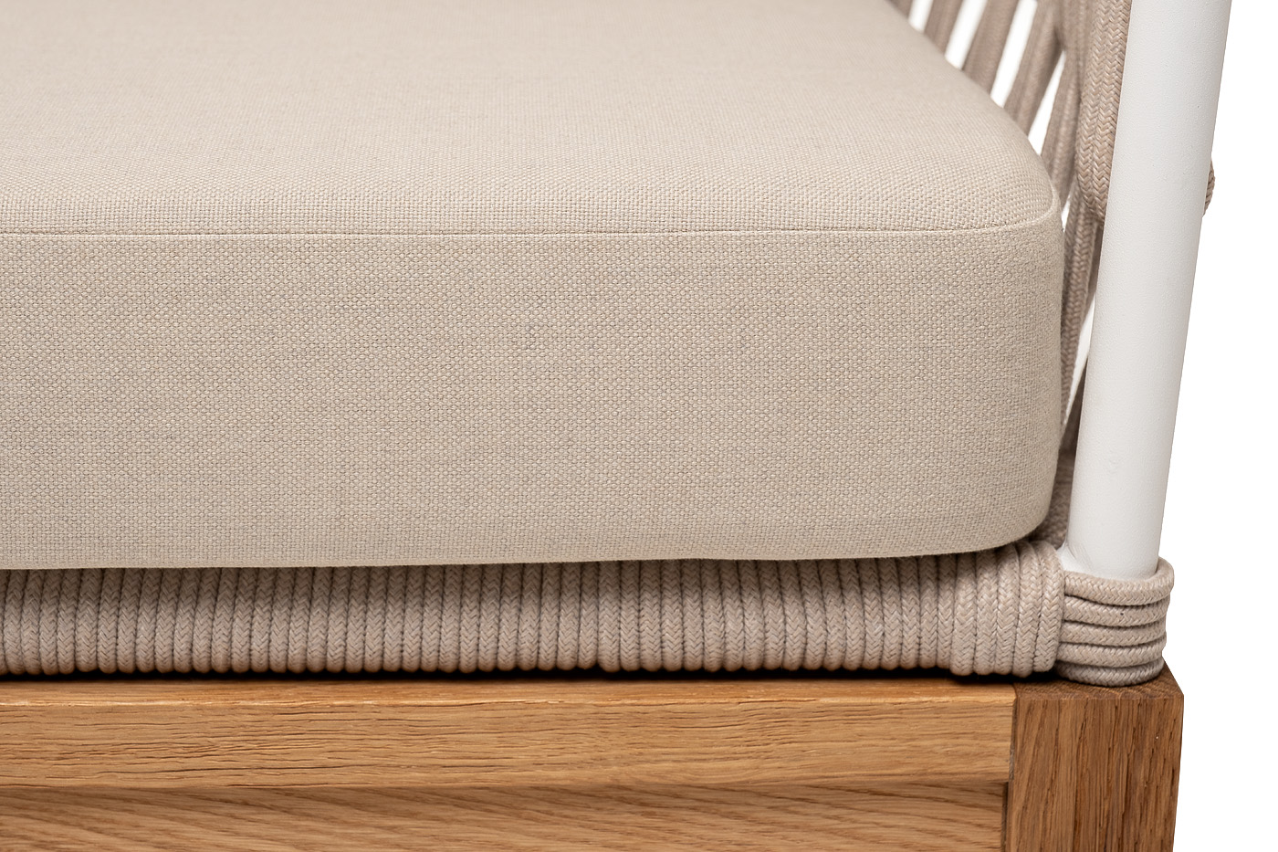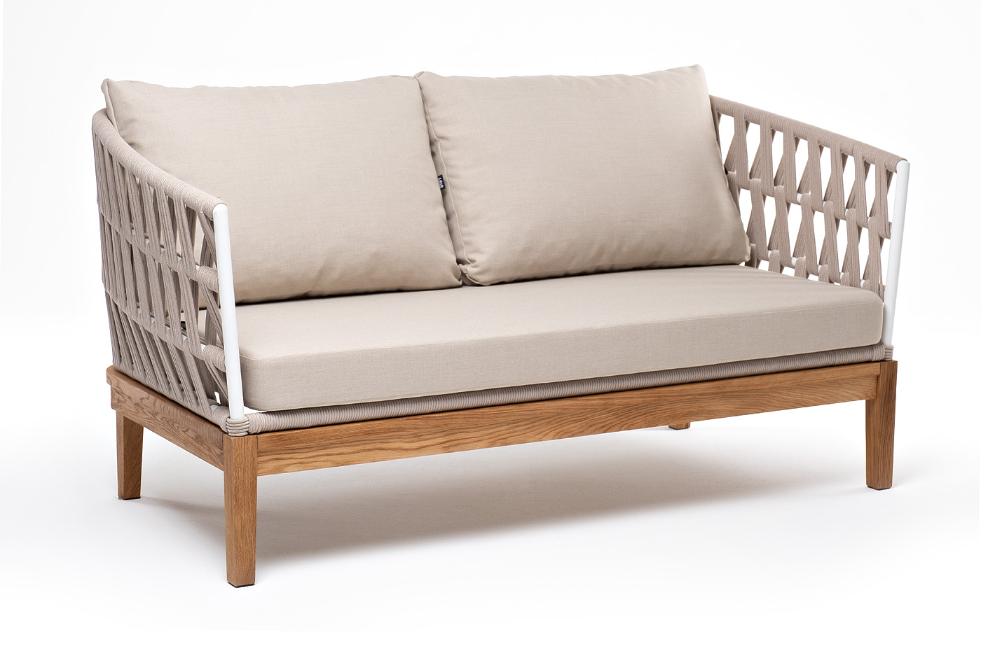 "Диего" диван 2-местный плетеный из роупа, основание дуб, каркас алюминий светло-серый (RAL7035) шагрень, роуп бежевый круглый, ткань бежевая 15052