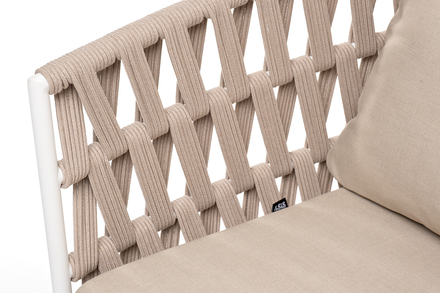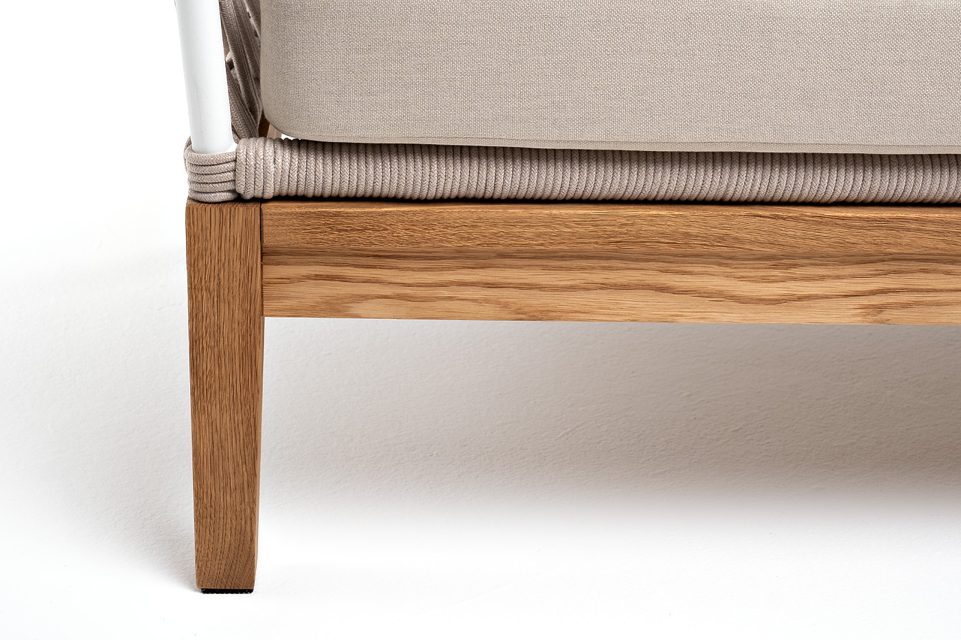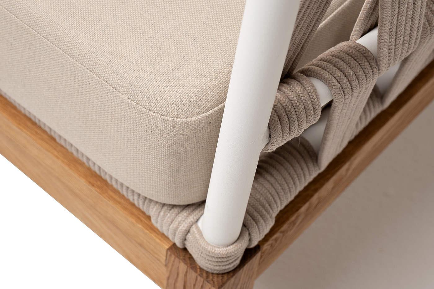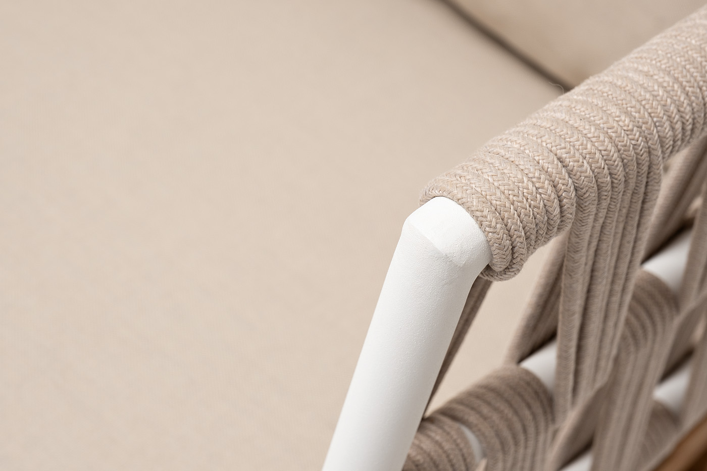 "Диего" диван 2-местный плетеный из роупа, основание дуб, каркас алюминий светло-серый (RAL7035) шагрень, роуп бежевый круглый, ткань бежевая 15052