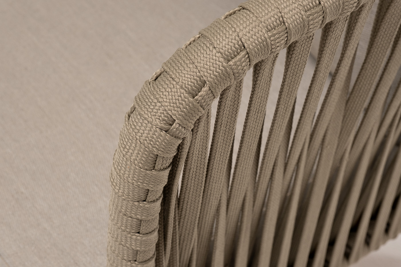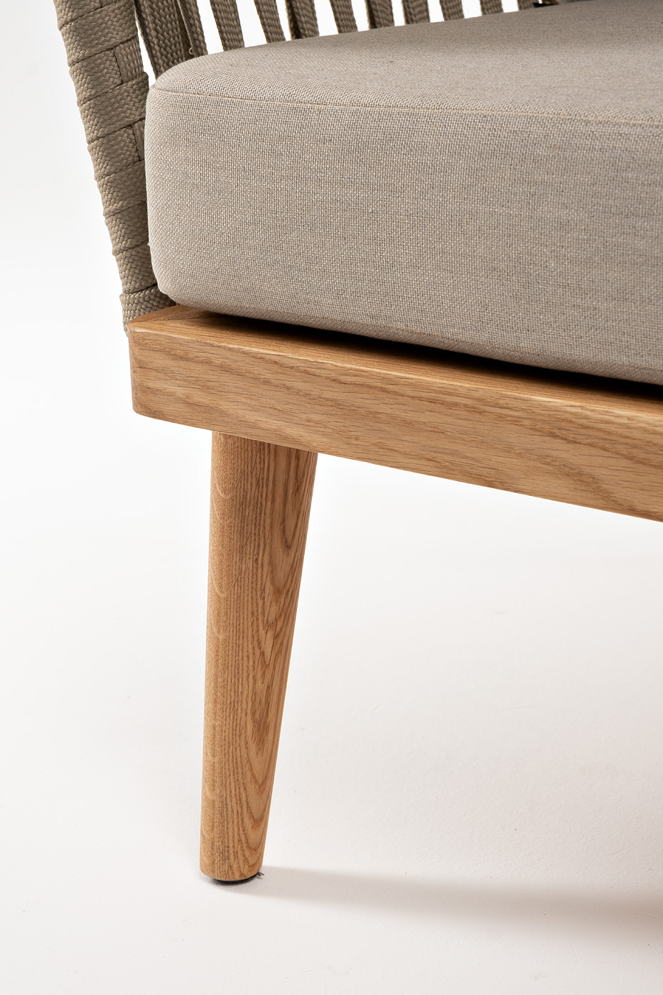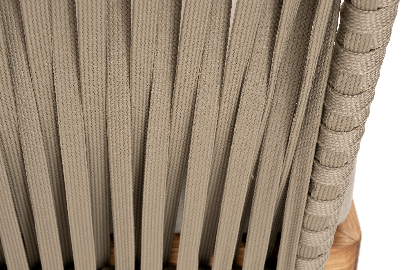 Боковины каркаса и спинка вручную оплетены роупом - эластичными синтетическими лентами, изготовленными из высокопрочных полиэфирных волокон. Цвет оплетки - серо-коричневый. Основание - дуб.