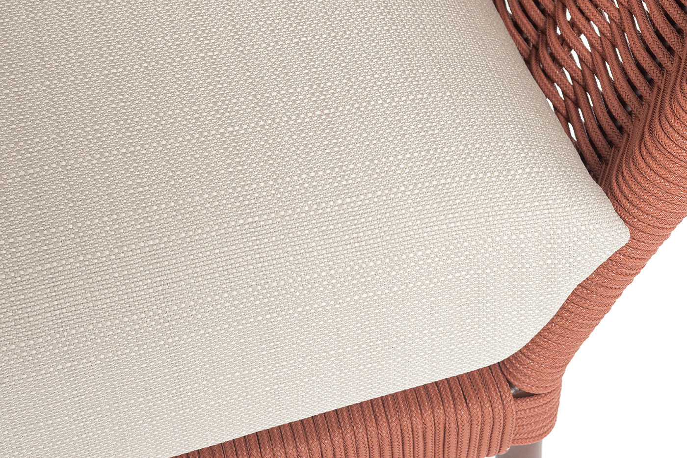 Боковины и спинка вручную оплетены роупом — эластичными синтетическими лентами из высокопрочных полиэфирных волокон. Веревка - круглый tex, придает изделию изысканный рельеф и подчеркивает ручную работу мастеров.