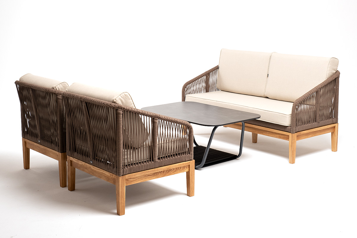 Боковины каркаса и спинка вручную оплетены роупом коричневого цвета. Это эластичные синтетические ленты, изготовленные из высокопрочных полиэфирных волокон. Основание дивана - натуральный дуб.