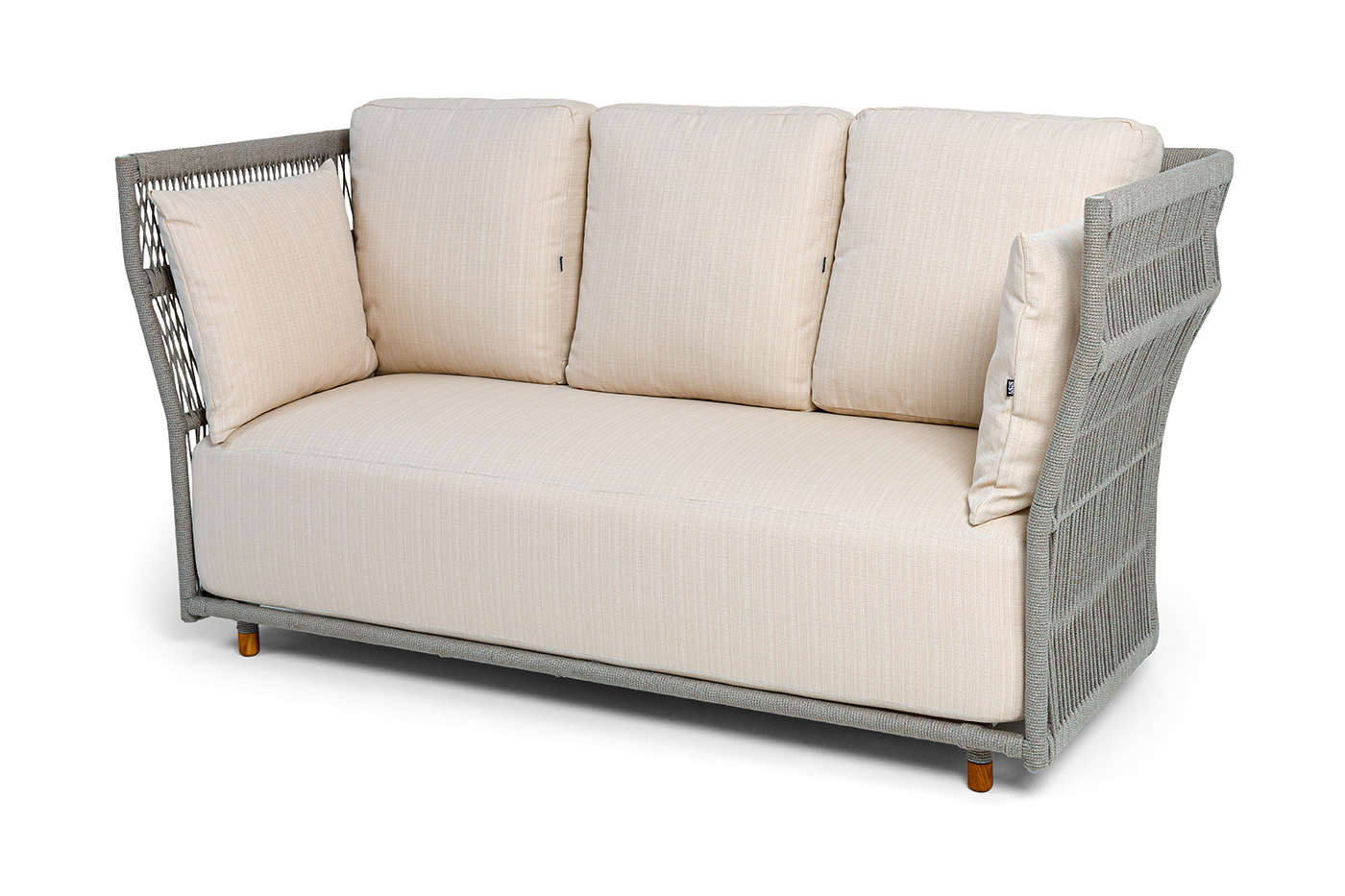 Диван имеет алюминиевый каркас, окрашенный порошковой краской в светло-серый (RAL7035) цвет. Боковины каркаса и спинка вручную оплетены роупом - эластичными синтетическими лентами, изготовленными из высокопрочных полиэфирных волокон. Цвет оплетки - серый меланж.