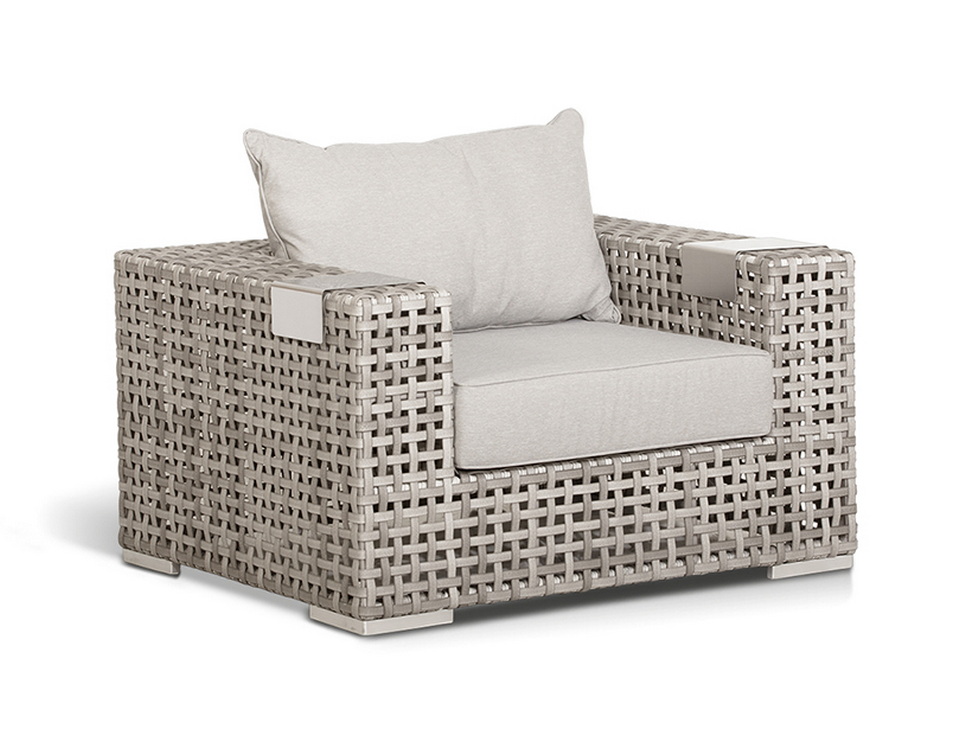 Основная нагрузки приходится на каркас мебели, который выполнен из высокопрочного алюминия. В качестве дизайнерского декора используется ручное плетение. Оно создано на основе искусственного ротанга 18×3,5 мм серого цвета.