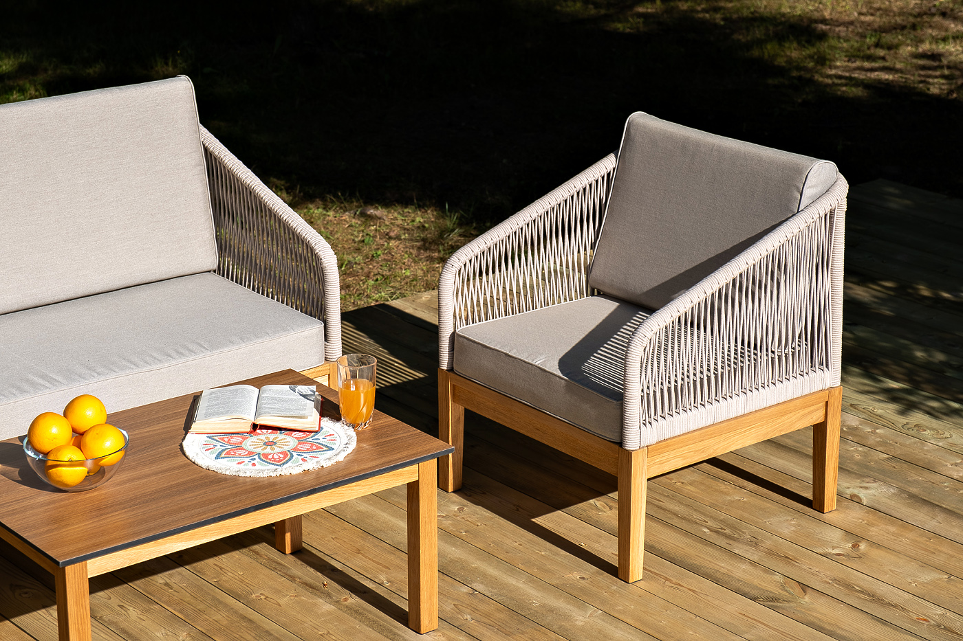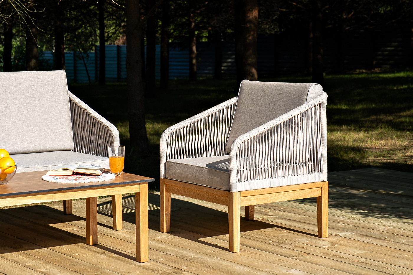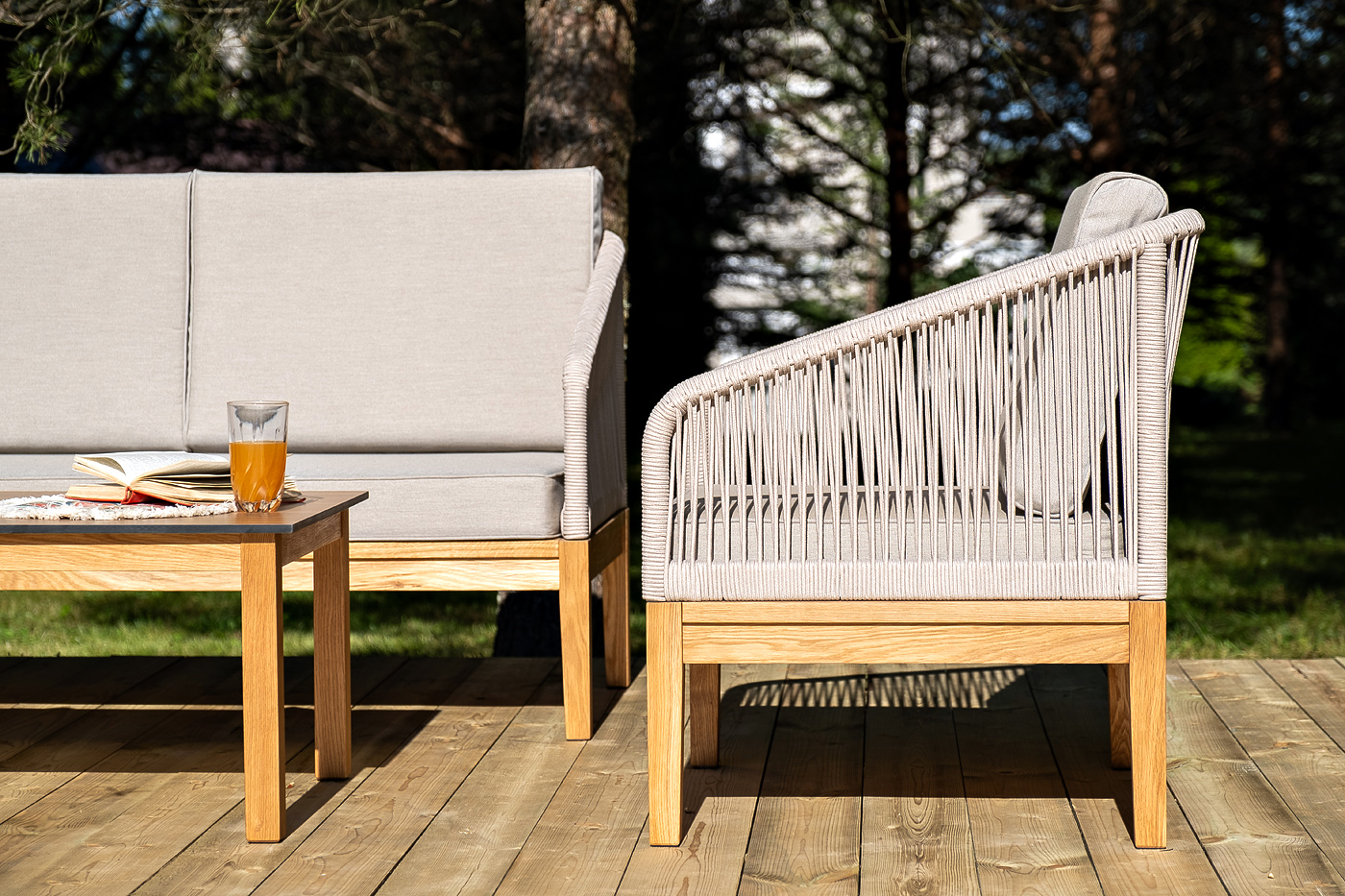 "Канны" кресло плетеное из роупа, основание дуб, роуп бежевый круглый, ткань бежевая 15052