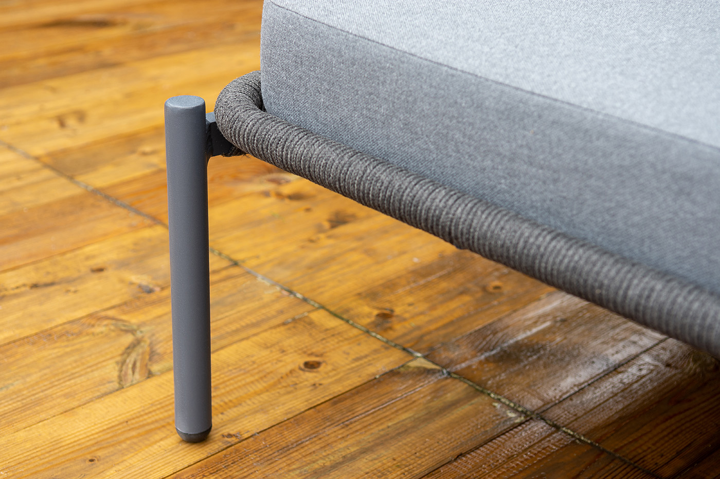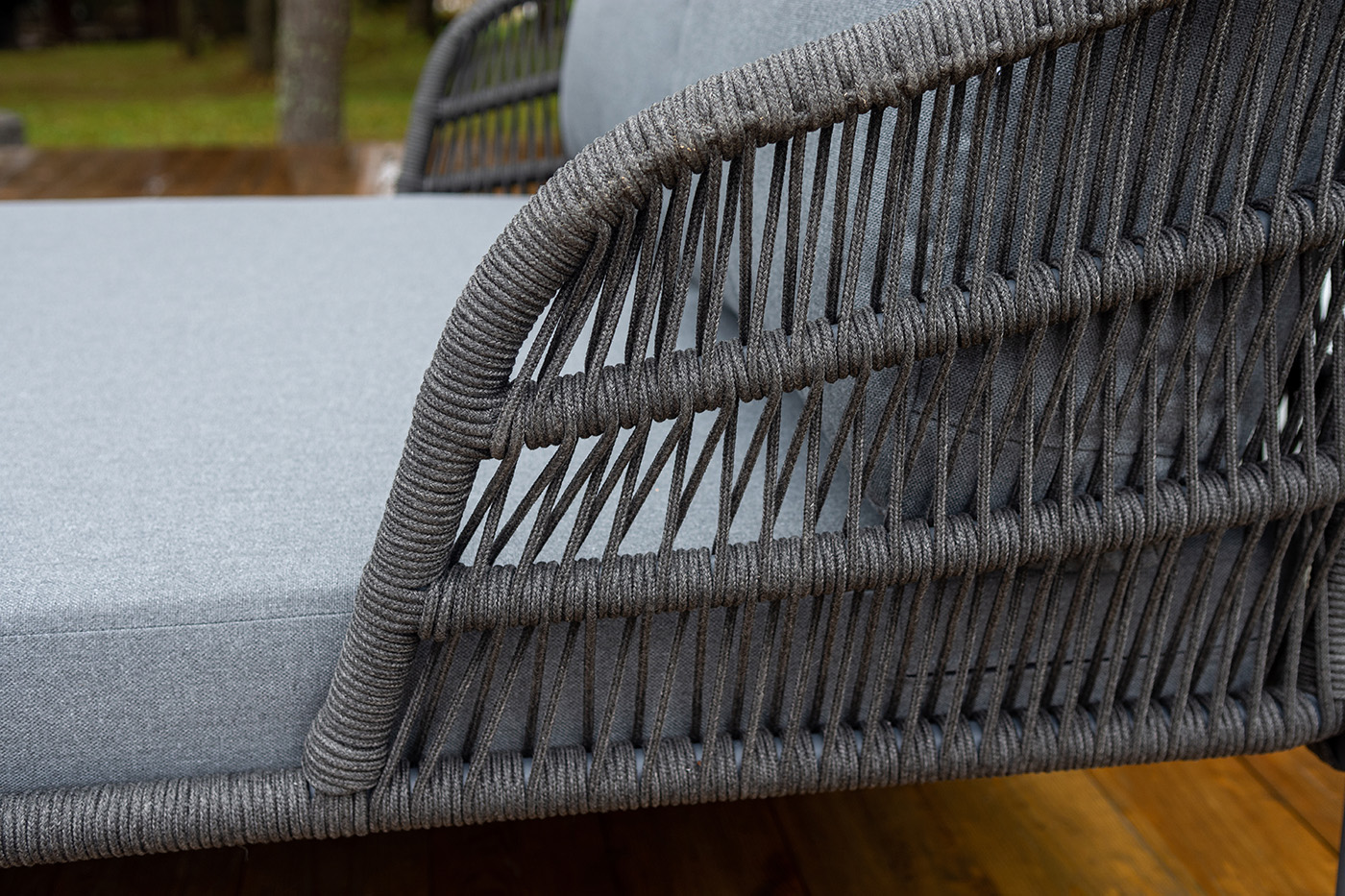 Оплетка боковин выполнена вручную из роупа — эластичных синтетических лент на основе высокопрочных полиэфирных волокон. Темно‑серый оттенок оплетки гармонично сочетается с каркасом, подчеркивая лаконичность дизайна.