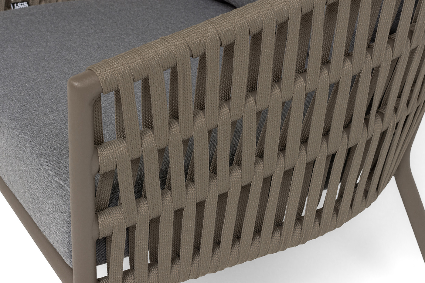 "Комо" кресло плетеное из роупа, каркас алюминий бежево-серый (RAL7006) муар, роуп серо-коричневый 23мм, ткань темно-серая 027