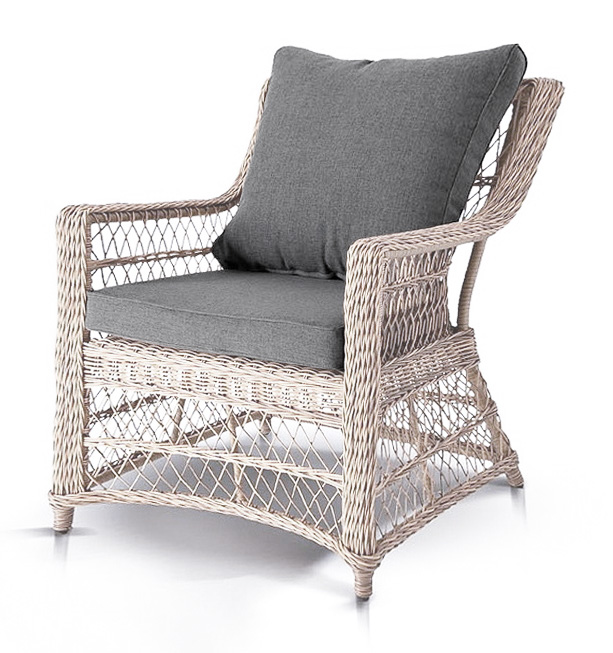 Укомплектовано плетеное кресло удобными мягкими подушками, одна из которых располагается в области спинки. Они выполнены в сером оттенке. При пошиве тканевых изделий используется полиэстер, плотностью 300гр/м2