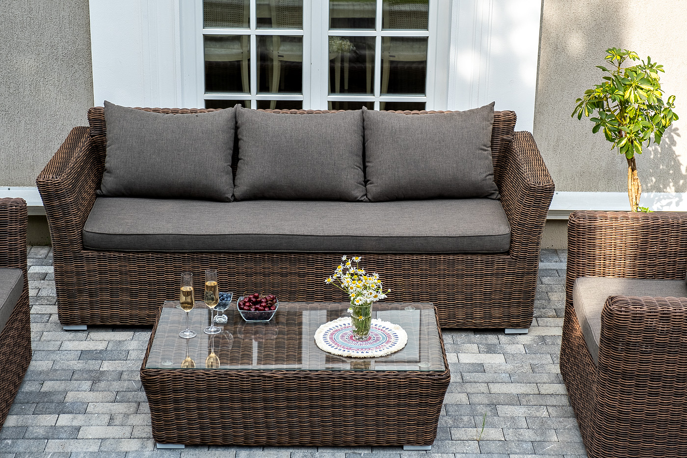 В качестве основы применяется алюминиевый каркас. Из круглого искусственного ротанга сделана ручная оплетка. Цвет комплекта – коричневый.