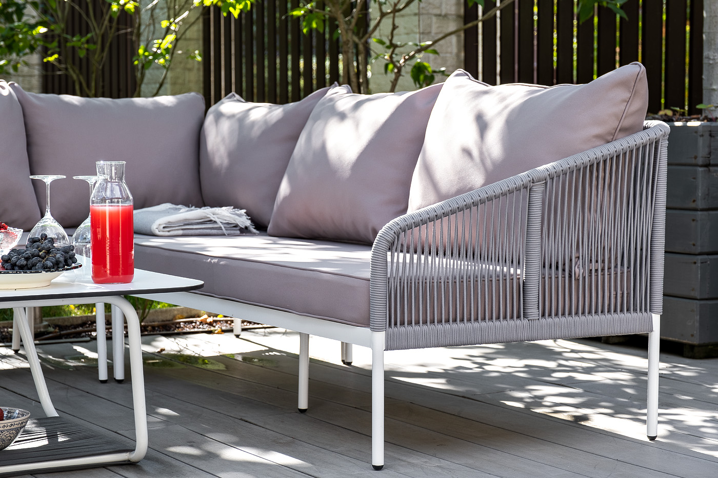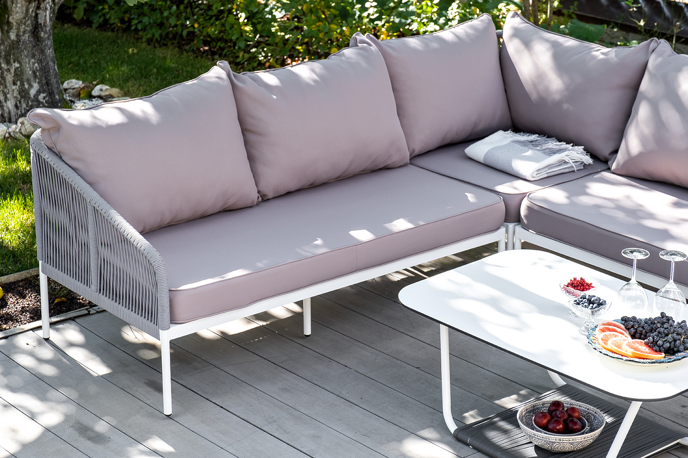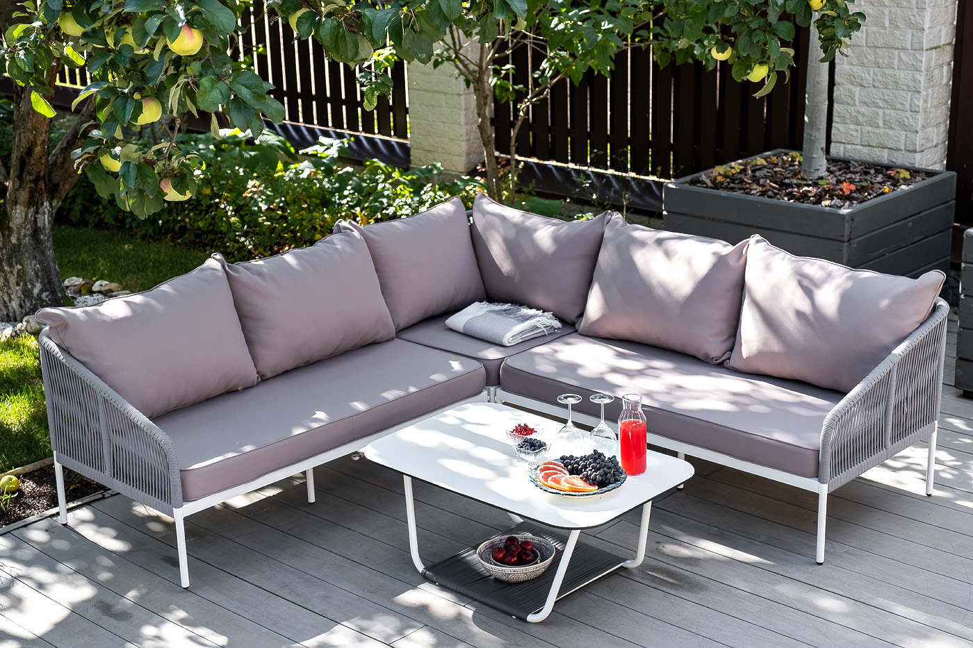 Диван идет в комплекте с мягкими подушками в чехлах светло-серого цвета. "Канны" правый модуль плетеный из роупа, каркас алюминий белый шагрень, роуп светло-серый круглый, ткань светло-серая 1шт. 1 480Х850Х750, "Канны" левый модуль плетеный из роупа, каркас алюминий белый шагрень, роуп светло-серый круглый, ткань светло-серая 1шт. 1 480Х850Х750, "Канны" угловой модуль плетеный из роупа, каркас алюминий белый шагрень, роуп светло-серый круглый, ткань светло-серая 1шт. 850Х850Х750, "Гранада" журнальный стол 90х60см из HPL, цвет "молочный", каркас белый муар, роуп темно-серый круглый 1шт. 900Х600Х420,