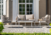 "Милан" диван 2-местный плетеный из роупа, каркас алюминий белый муар, роуп бежевый круглый, ткань бежевая 052 1шт. 1 450Х650Х830, "Милан" кресло плетеное из роупа, каркас алюминий белый муар, роуп бежевый круглый, ткань бежевая 052 2шт. 700Х650Х830, "Диего" журнальный стол из HPL 120х60 H40, каркас белый муар, цвет "молочный" 1шт. 1 200Х600Х400,