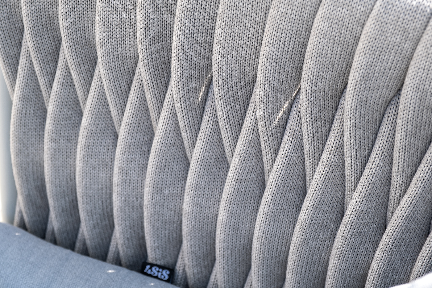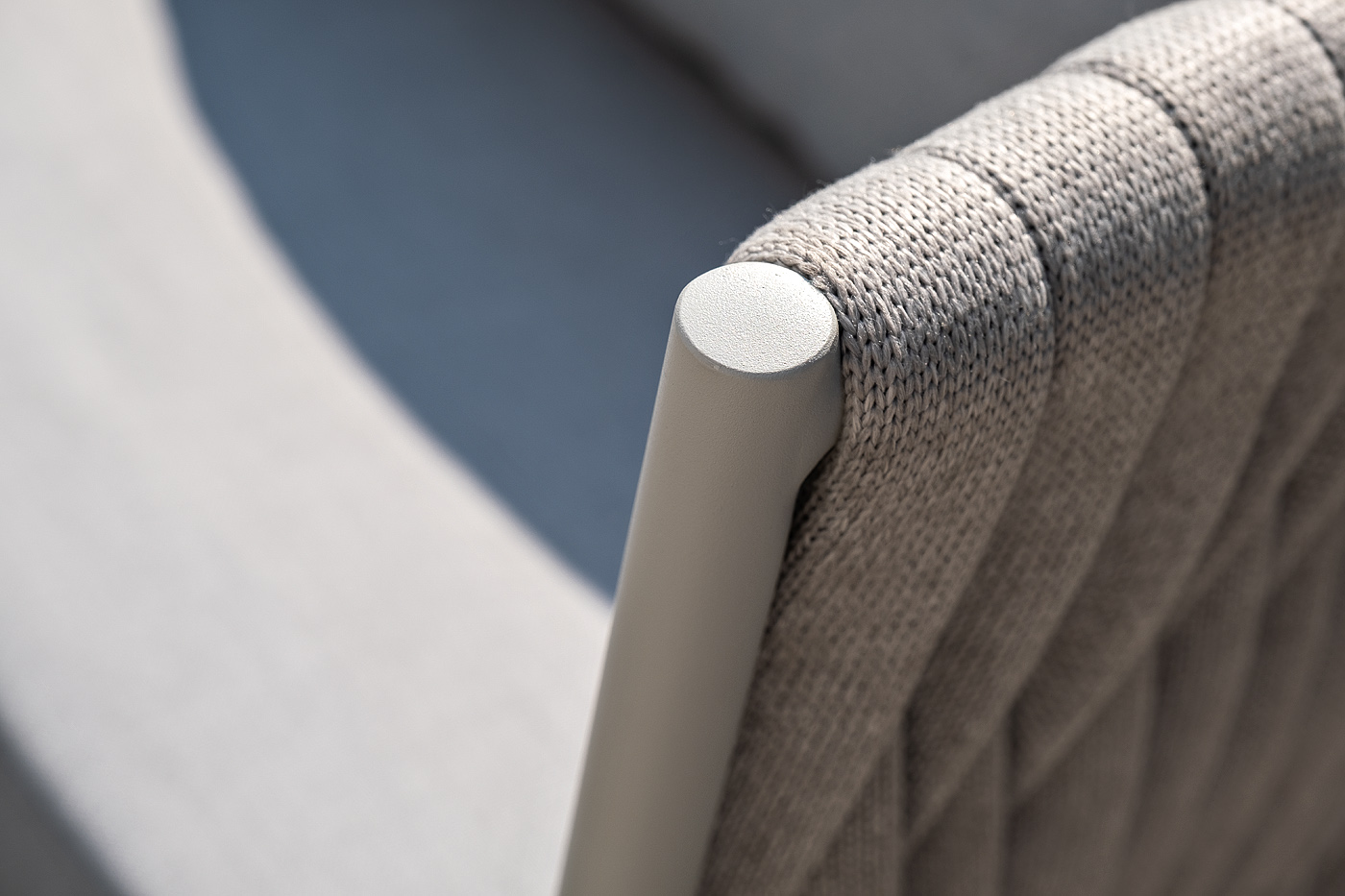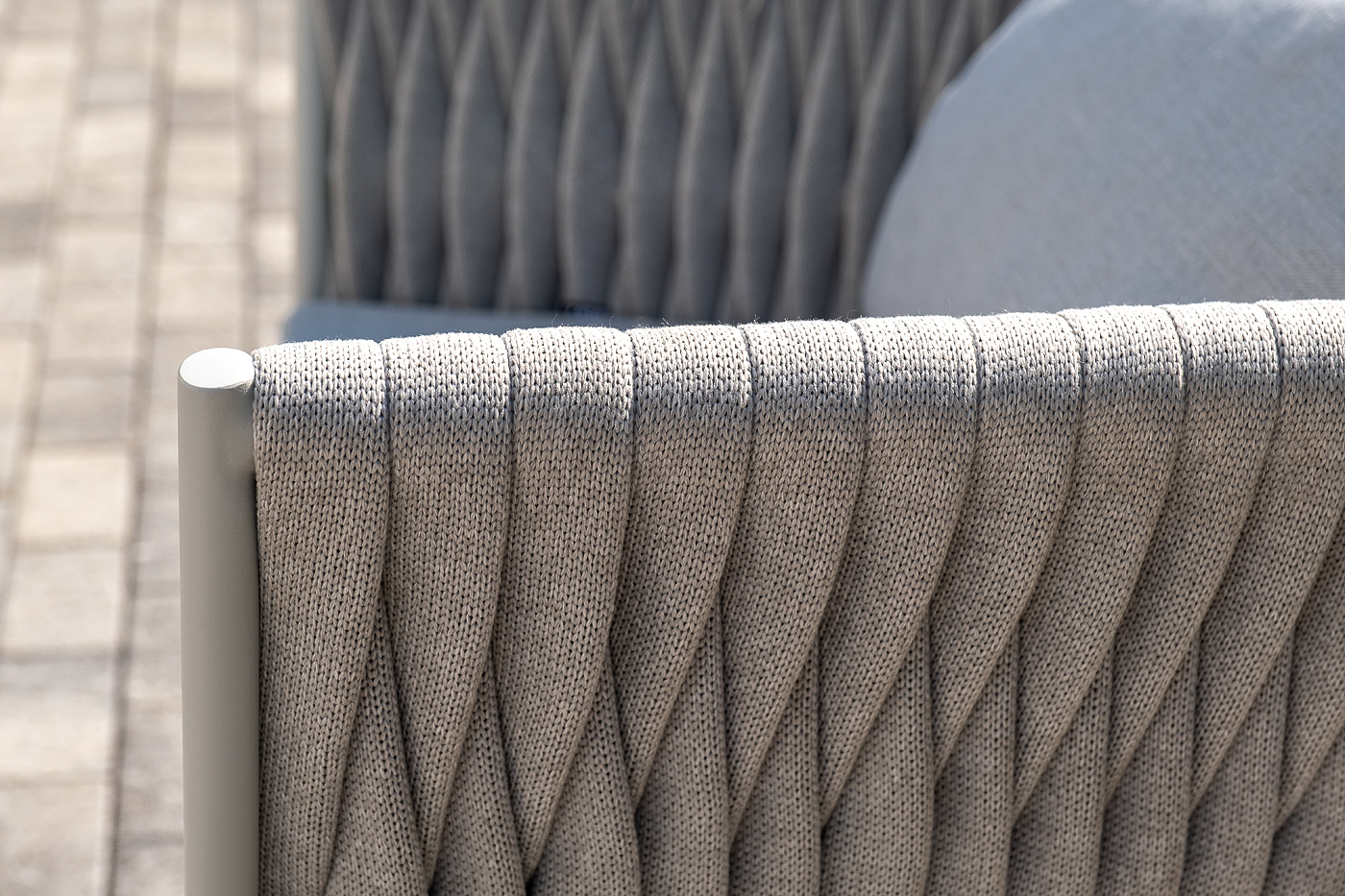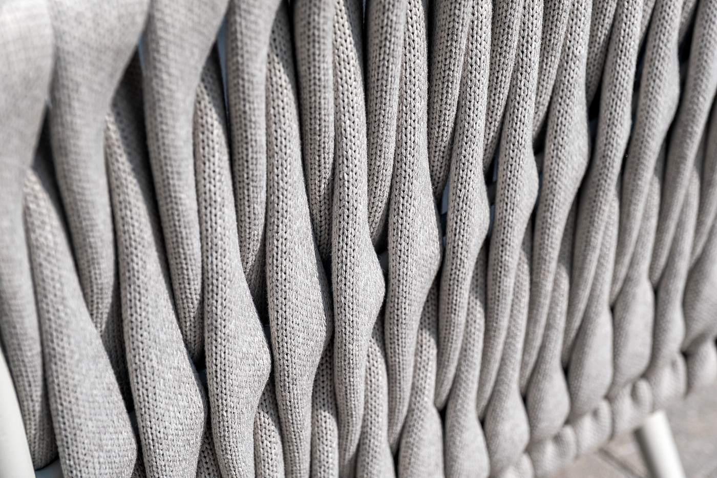Каркас уличной мебели выполнен из алюминия. Его дополняет светло-серая оплетка, изготовленная на основе эластичных синтетических лент из полиэфирных волокон высокой прочности.