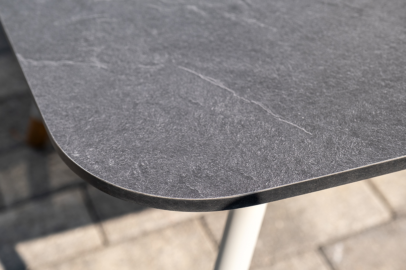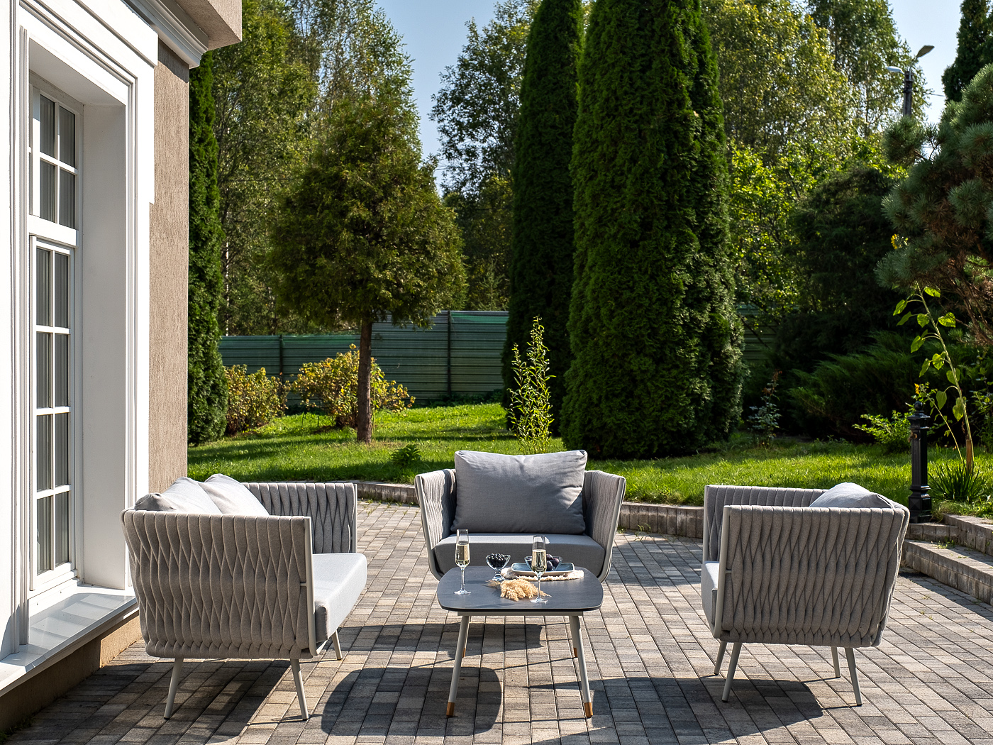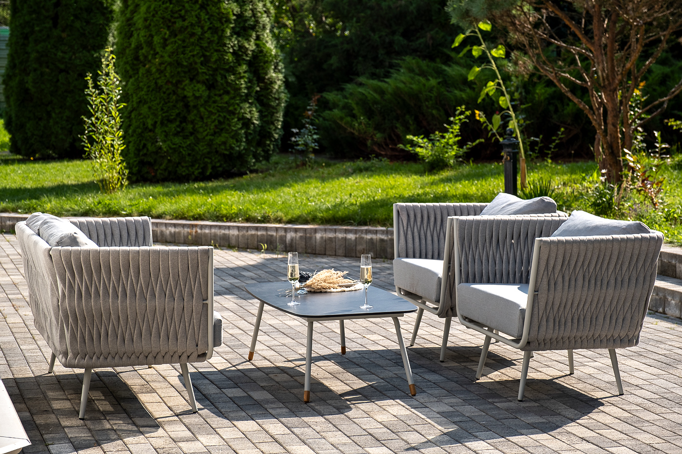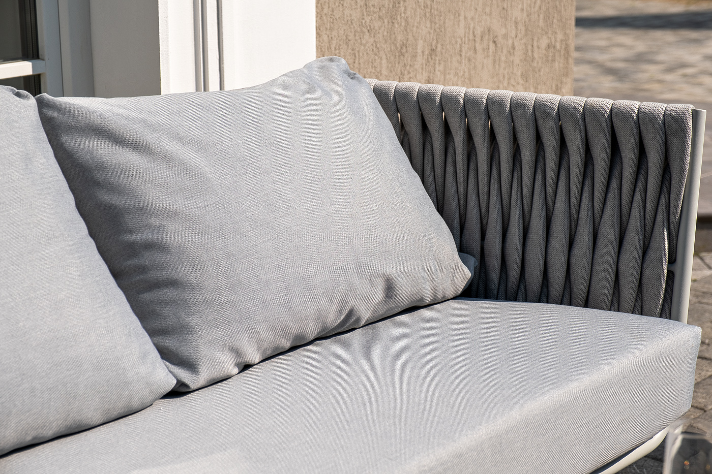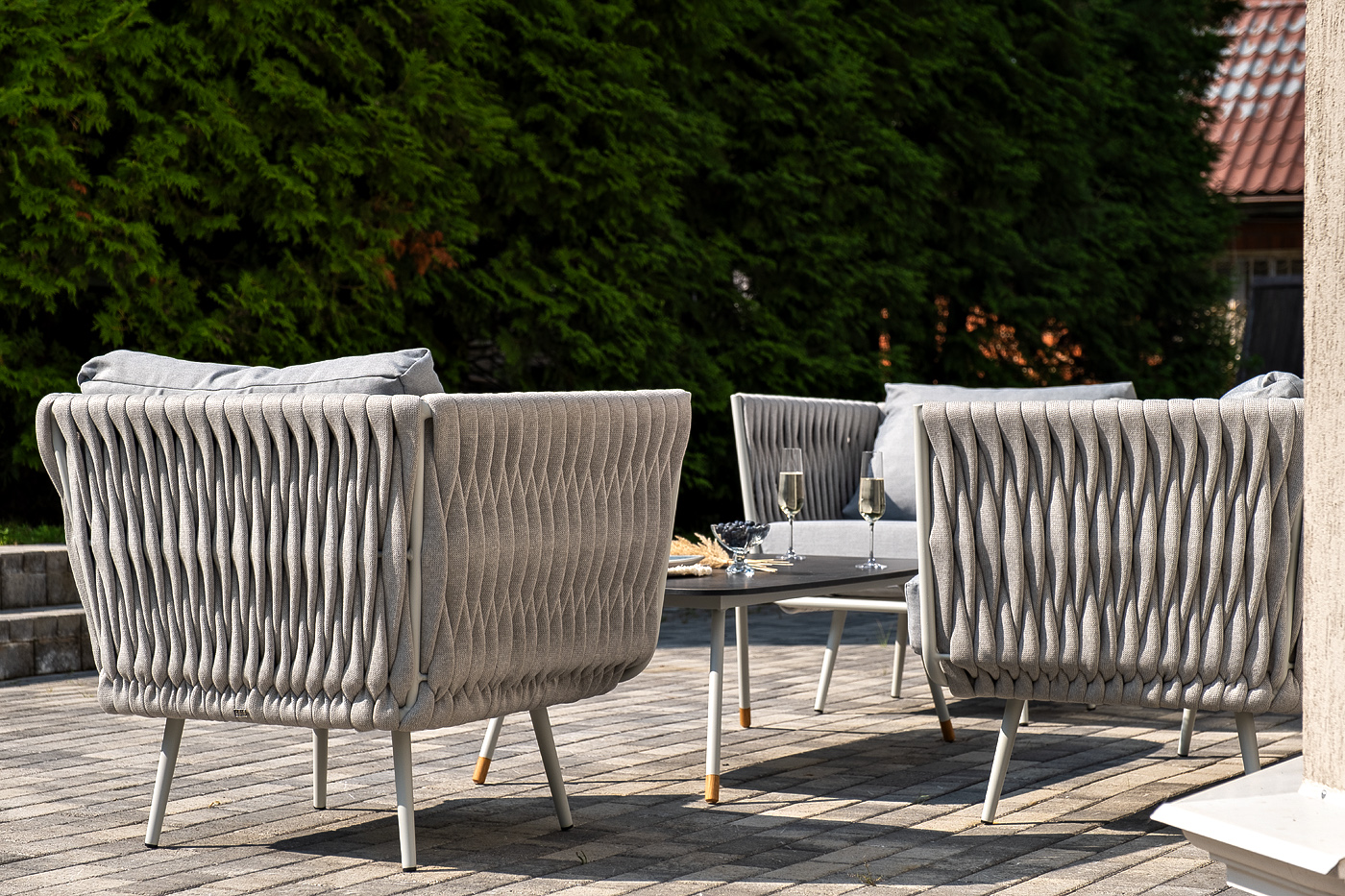 Каркас уличной мебели выполнен из алюминия. Его дополняет светло-серая оплетка, изготовленная на основе эластичных синтетических лент из полиэфирных волокон высокой прочности.