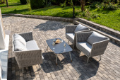 Кресла и диван идут в комплекте с мягкими подушками в чехлах светло-серого цвета. "Монако" диван 2-местный плетеный из роупа, каркас алюминий светло-серый (RAL7035) муар, роуп светло-серый 40 мм, ткань светло-серая 1шт. 1 600Х700Х750, "Монако" кресло плетеное из роупа, каркас алюминий светло-серый (RAL7035) муар, роуп светло-серый 40 мм, ткань светло-серая 2шт. 980Х700Х750, "Верона" журнальный стол из HPL 120х65, H40, каркас светло-серый (RA L7035) муар, цвет столешницы "серый гранит" 1шт. 1 200Х650Х400,