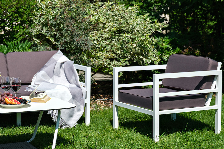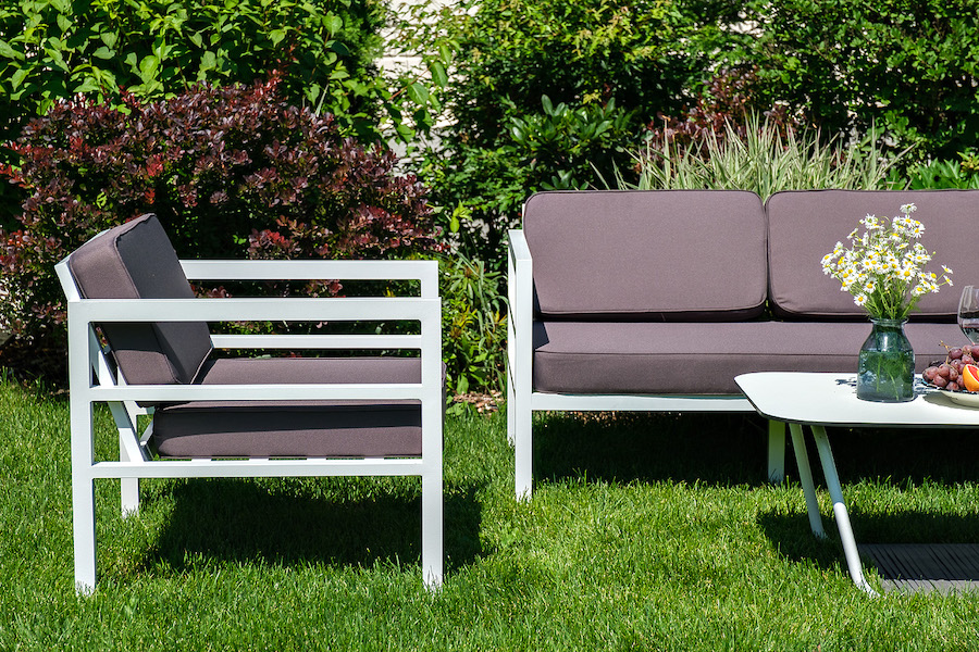 Каркас дивана и кресел выполнен из прочного алюминия и окрашен в белый цвет. Комплект дополняют подушки со съёмными чехлами и водоотталкивающей пропиткой темно-серого цвета. Материал чехлов - 100% полиэстер плотностью 300гр/м2.