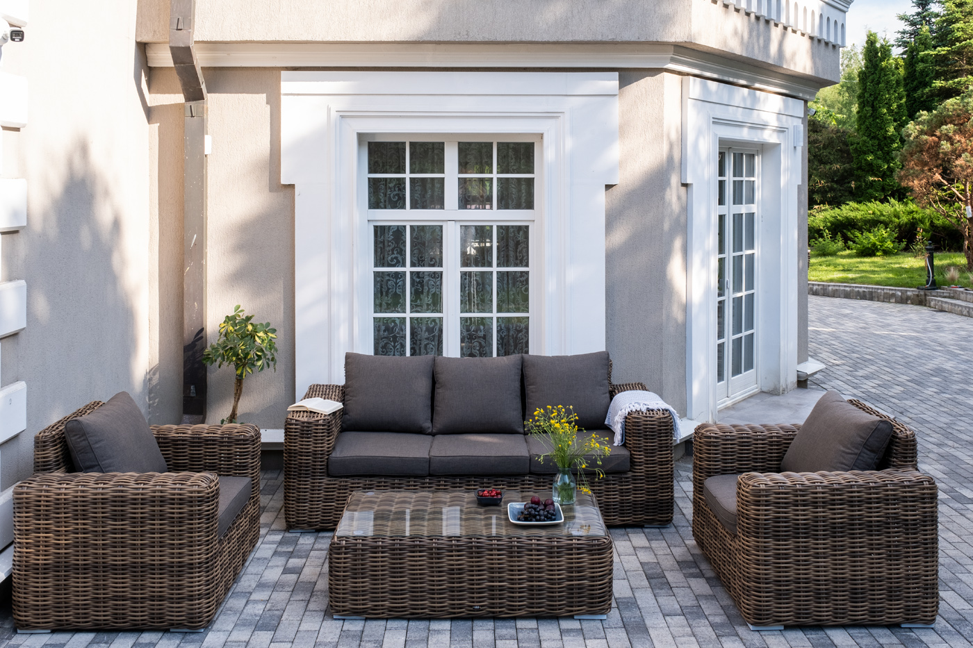 Плетеная мебель дополнена удобными подушками в серых чехлах. При их изготовлении используют полиэстер, плотность – 300гр/м2. Он обрабатывается влагоотталкивающей пропиткой для повышения защитных свойств материала.