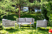 Каркас уличной мебели выполнен из износостойкого алюминия. Его дополняет бежевая ручная оплетка, изготовленная на основе эластичных синтетических лент из полиэфирных волокон высокой прочности (роупа).
