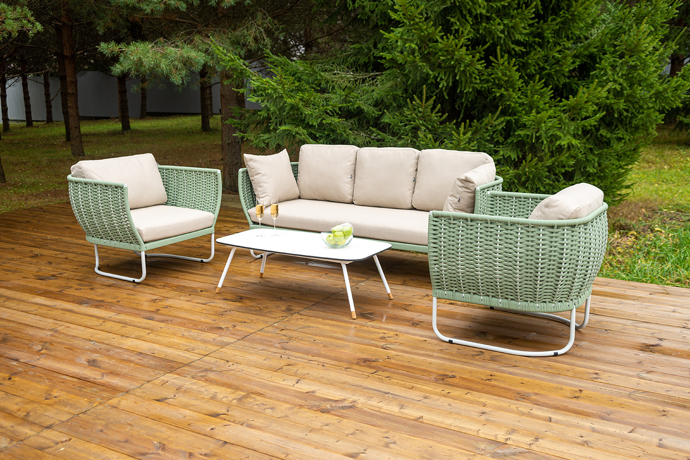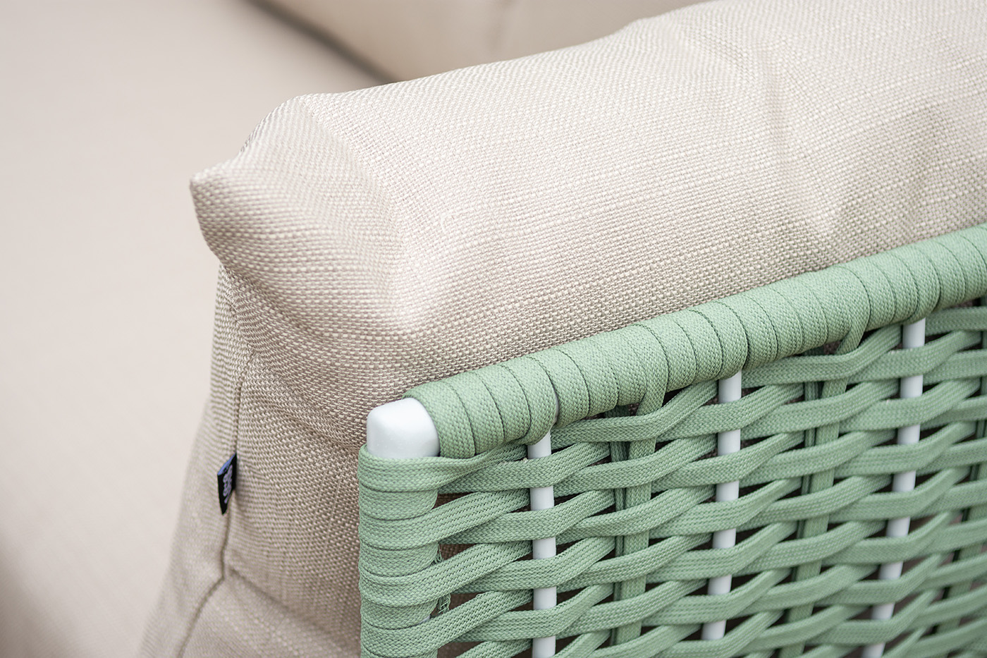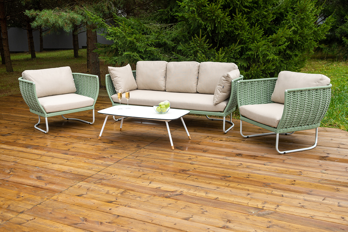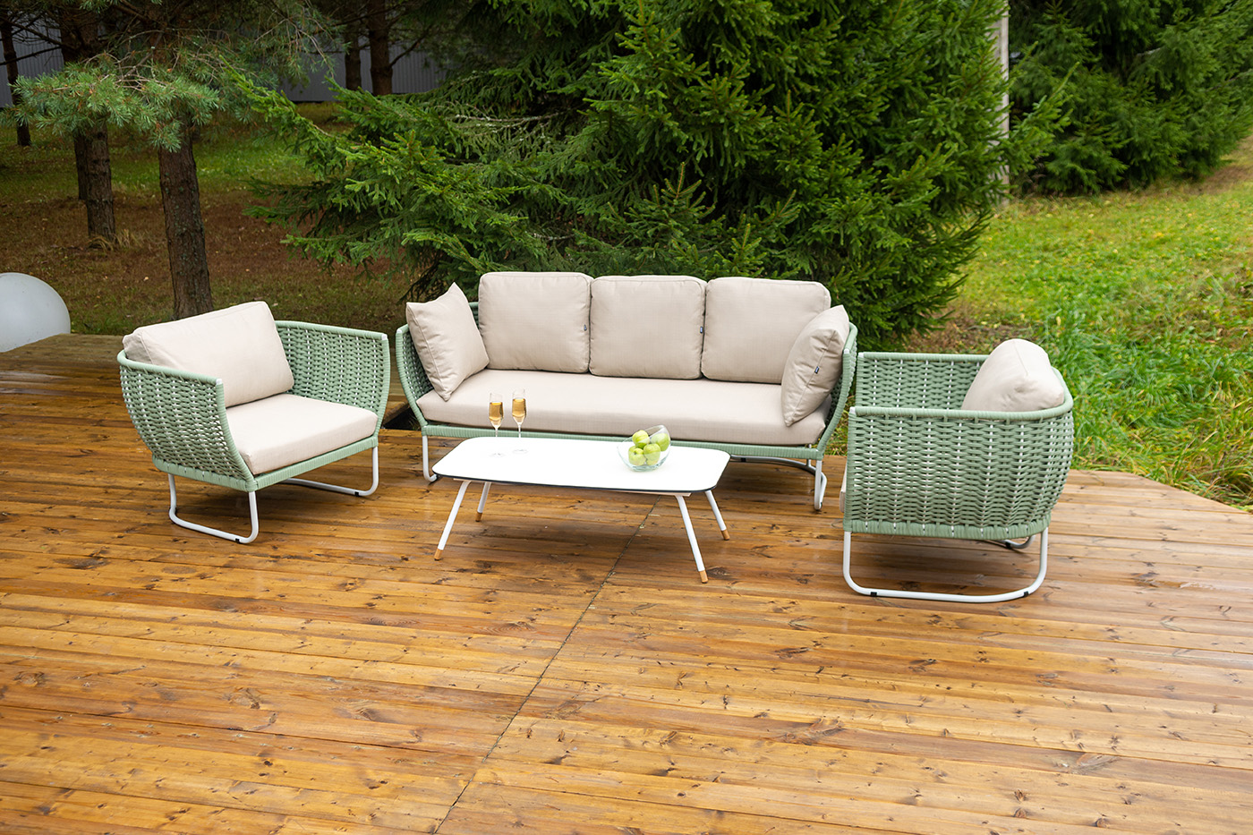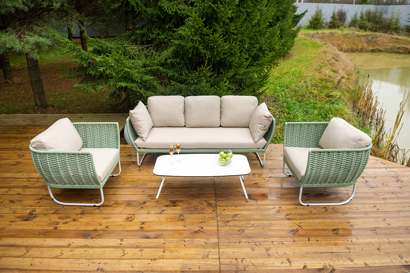 "Фиджи" диван 3-местный плетеный из роупа, каркас алюминий светло-серый (RAL7035) муар, роуп зеленый (4204) круглый tex, ткань Mossle бежевая 1шт. 2 180Х890Х810, "Фиджи" кресло плетеное из роупа, каркас алюминий светло-серый (RAL7035) муар, роуп зеленый (4204) круглый tex, ткань Mossle бежевая 2шт. 1 040Х890Х810, "Верона" журнальный стол из HPL 120х65, H40, каркас белый муар, цвет столешницы "молочный" 1шт. 1 200Х650Х400,