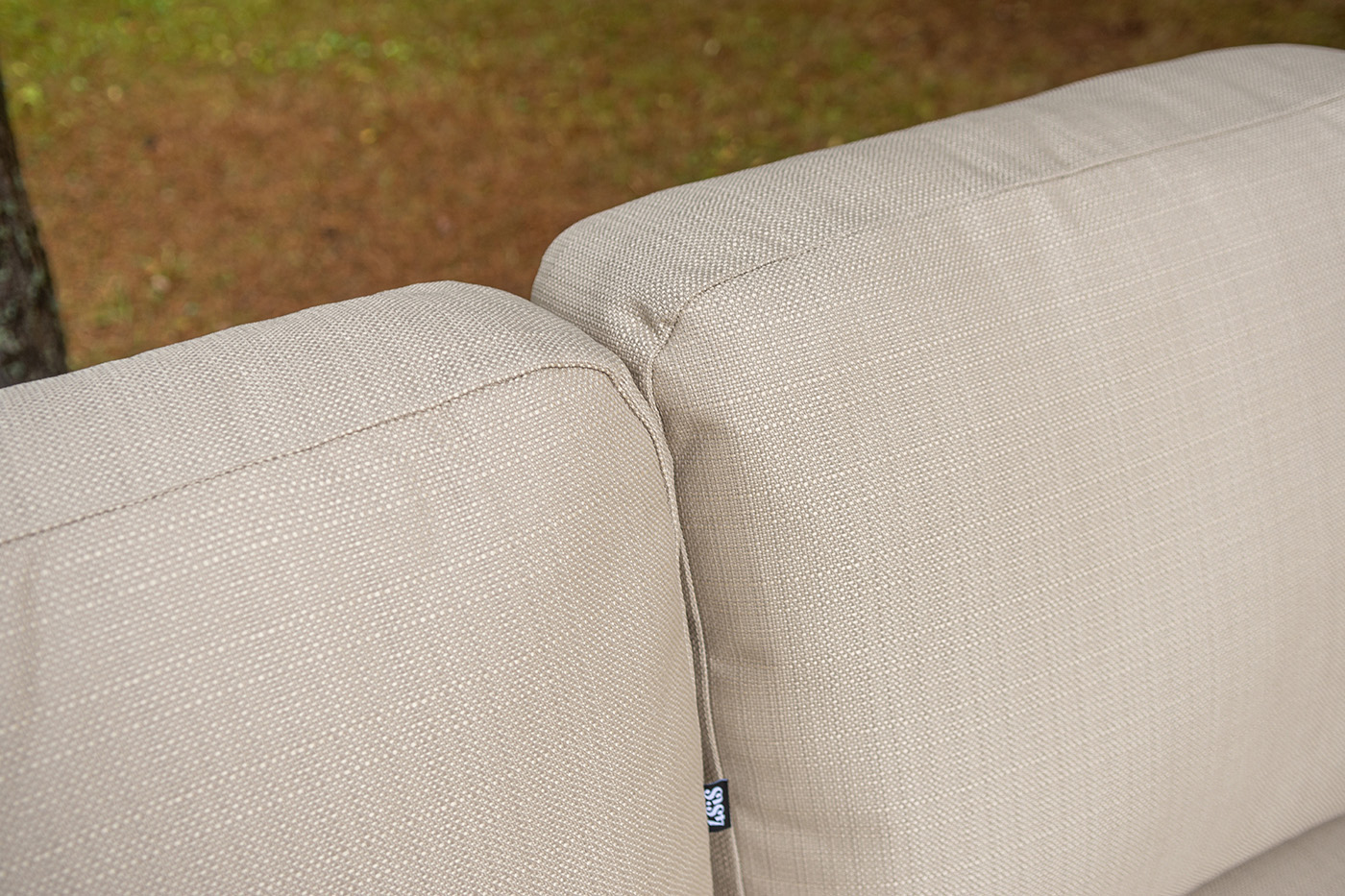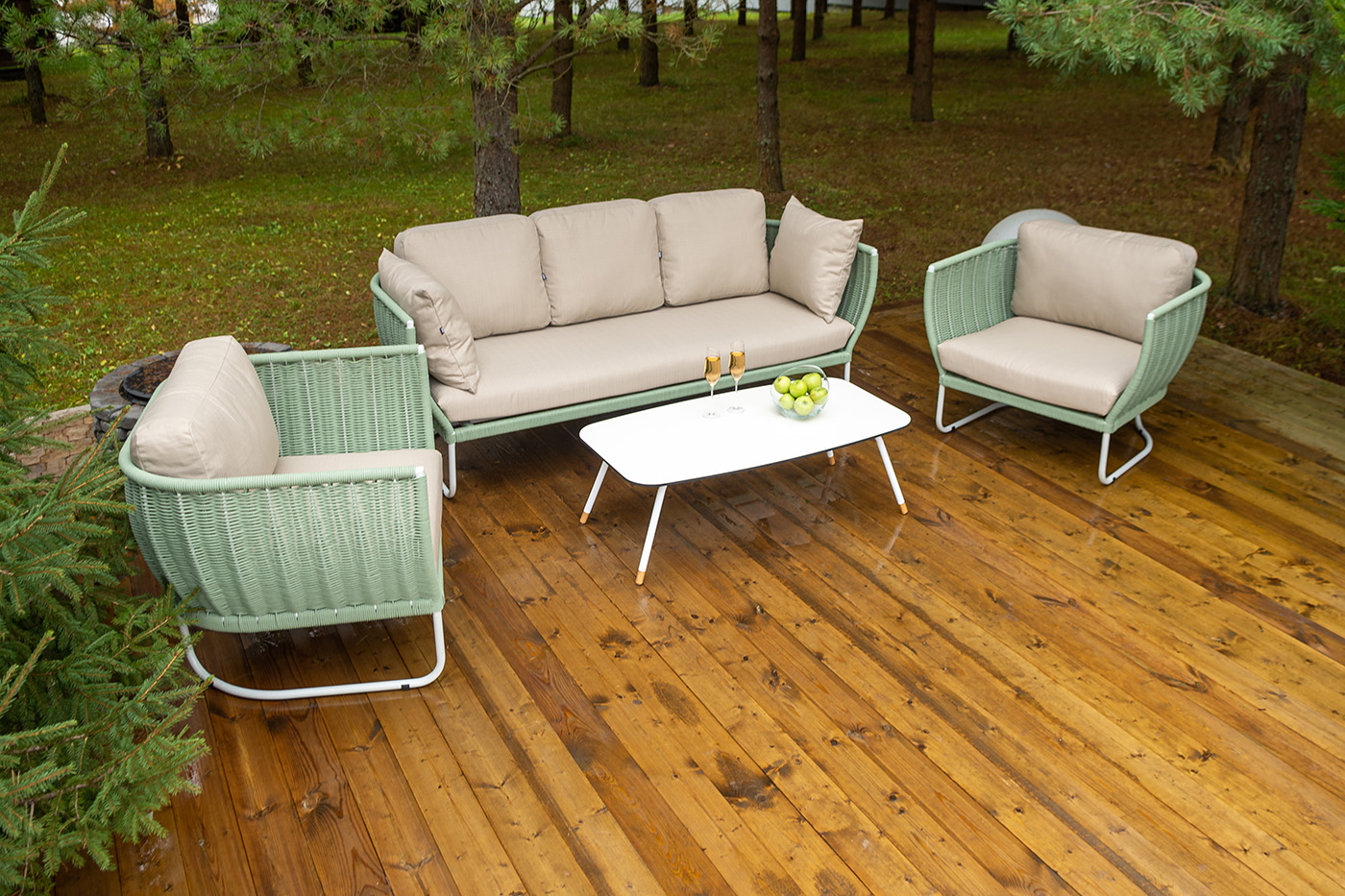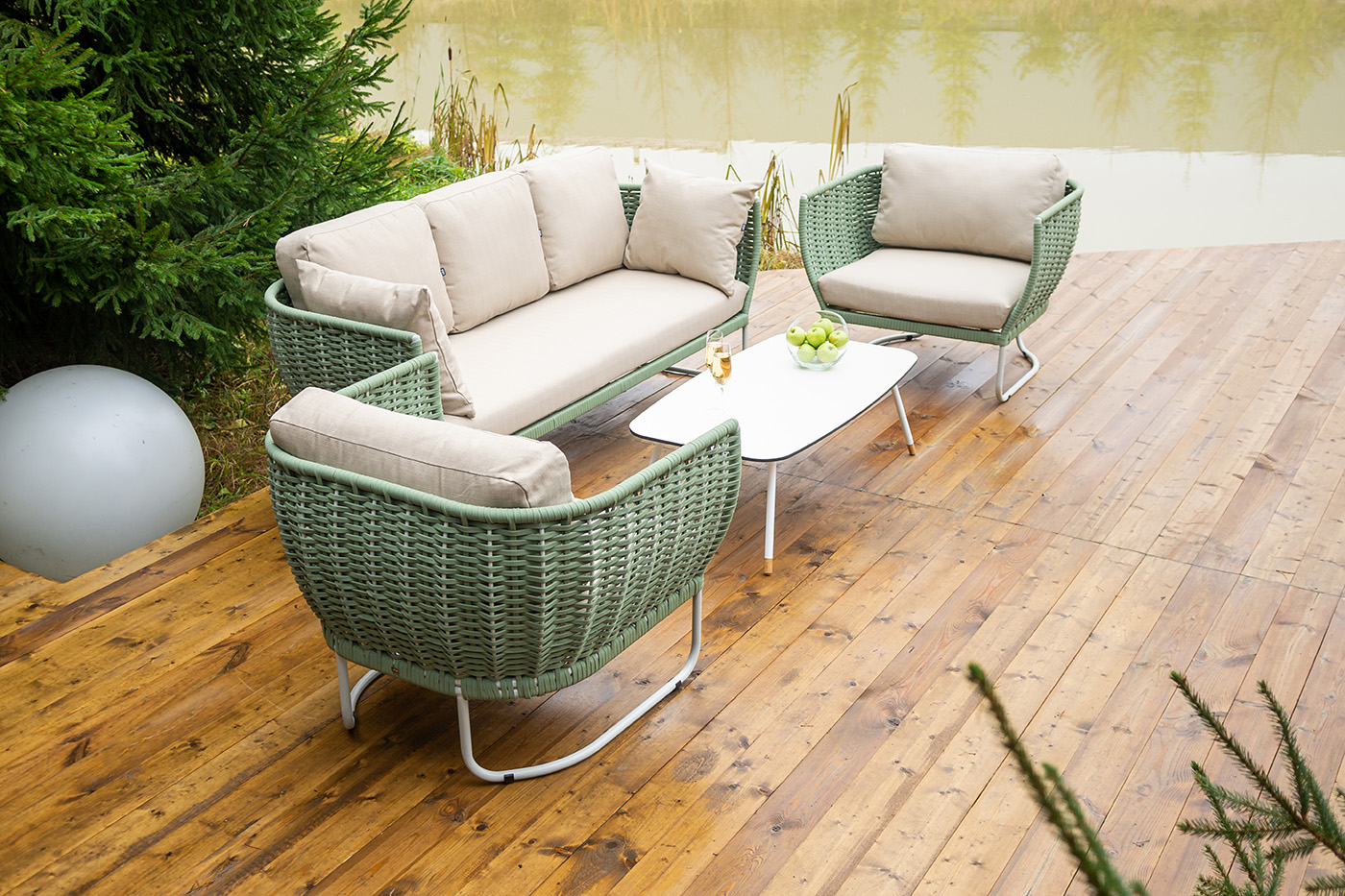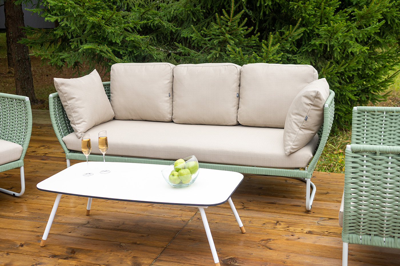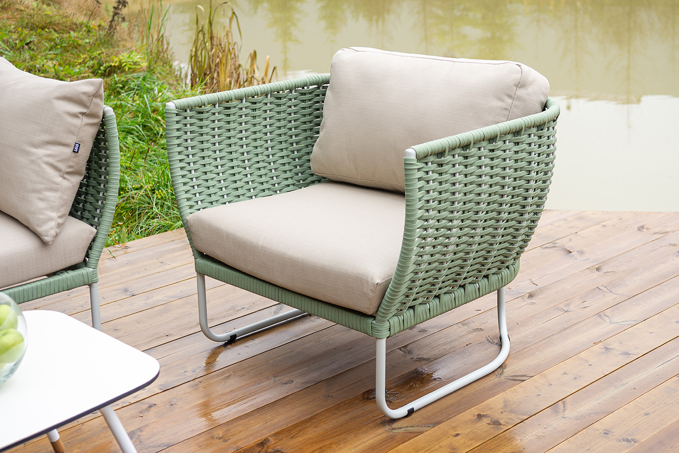 "Фиджи" диван 3-местный плетеный из роупа, каркас алюминий светло-серый (RAL7035) муар, роуп зеленый (4204) круглый tex, ткань Mossle бежевая 1шт. 2 180Х890Х810, "Фиджи" кресло плетеное из роупа, каркас алюминий светло-серый (RAL7035) муар, роуп зеленый (4204) круглый tex, ткань Mossle бежевая 2шт. 1 040Х890Х810, "Верона" журнальный стол из HPL 120х65, H40, каркас белый муар, цвет столешницы "молочный" 1шт. 1 200Х650Х400,