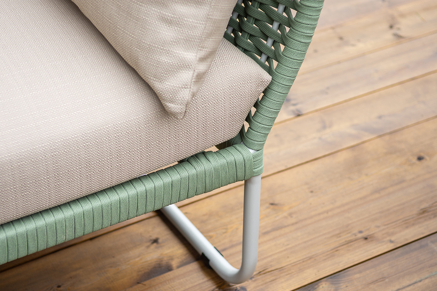 Боковины дивана и кресел вручную оплетены зелеными синтетическими лентами из высокопрочных полиэфирных волокон. Плетение придает мебели выразительный облик и удачно дополняет цвет каркаса.